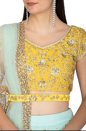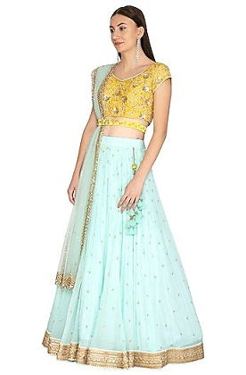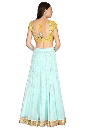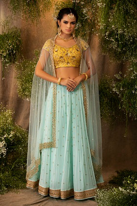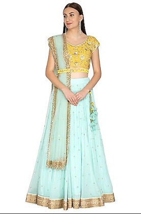 Featuring an aqua blue gathered lehenga skirt in georgette base with dabka and sequins embroidery. It is paired with a contrasting bright yellow blouse in chanderi base, belt and dupatta in net base.