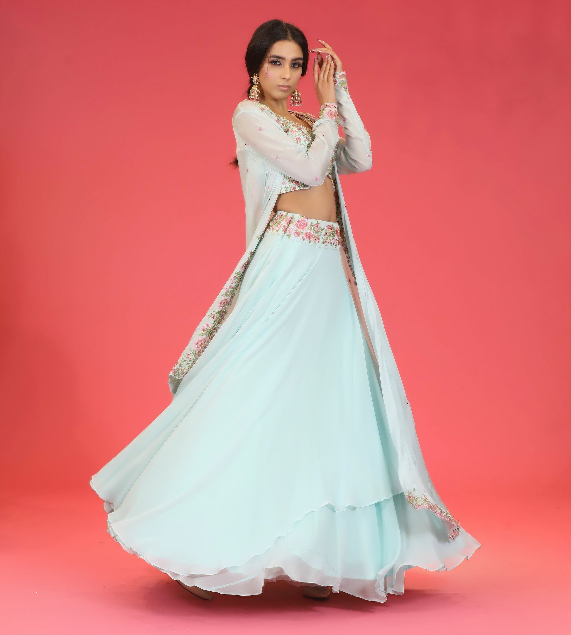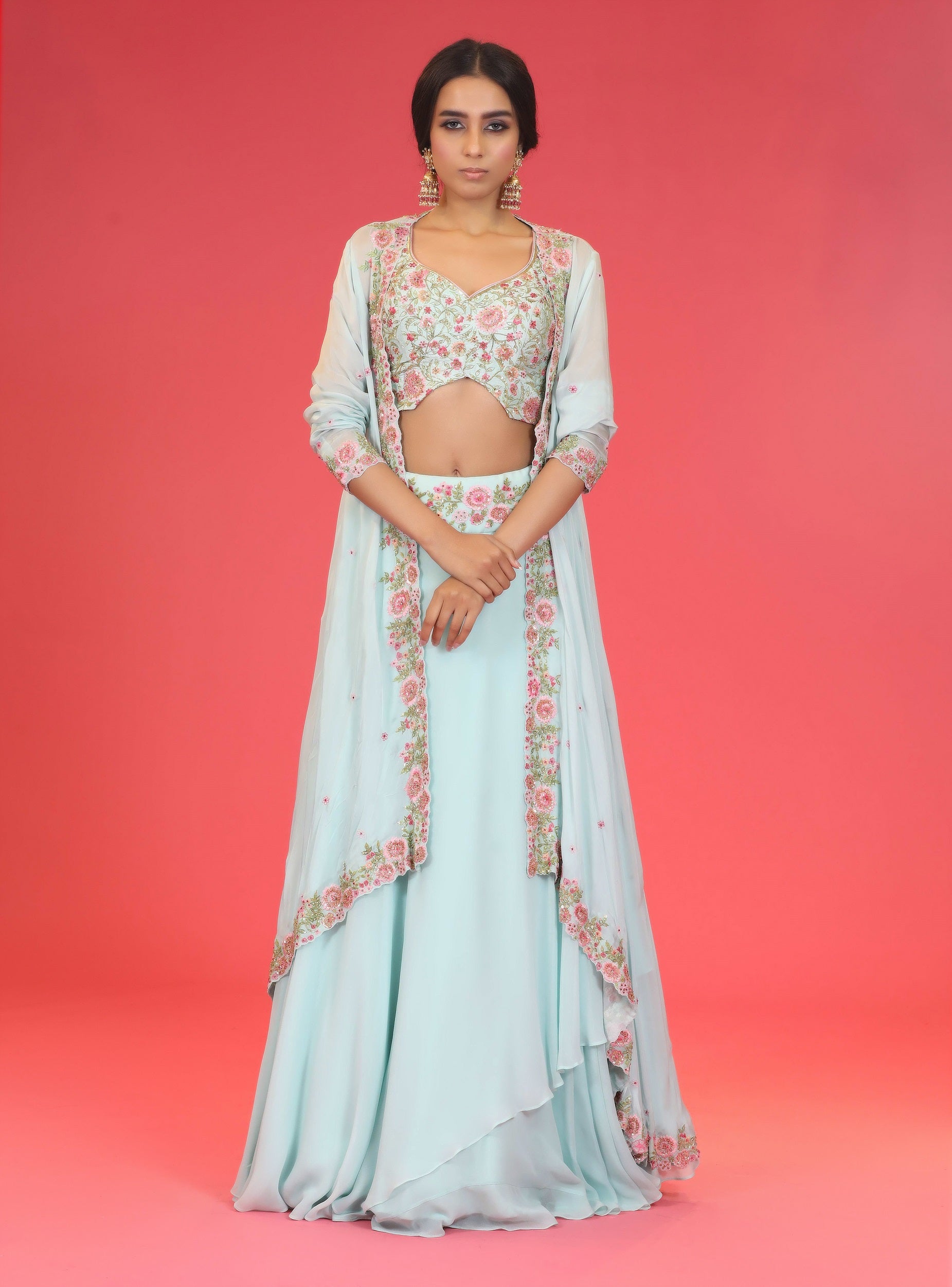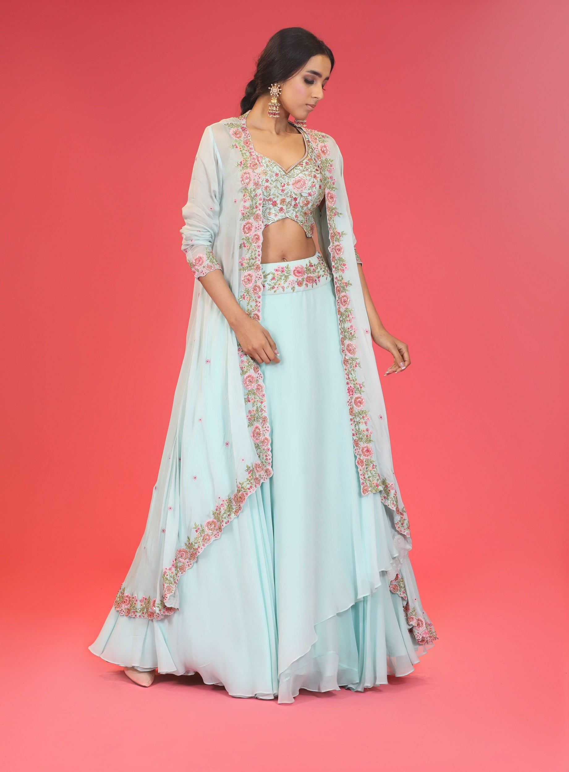 Featuring an aqua floral skirt in georgette base with sequins and thread embroidery. It is paired with matching blouse in dupion silk base and aqua floral cape.
