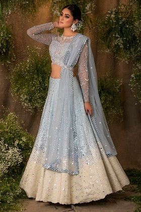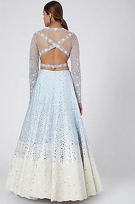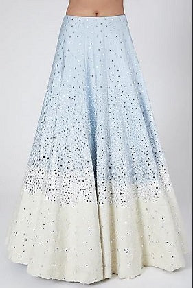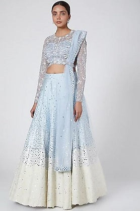 Featuring a powder blue and white blouse in net base with aari/threadwork and katdana /wool work embroidery. It is paired with a matching lehenga and with a matching net dupatta.