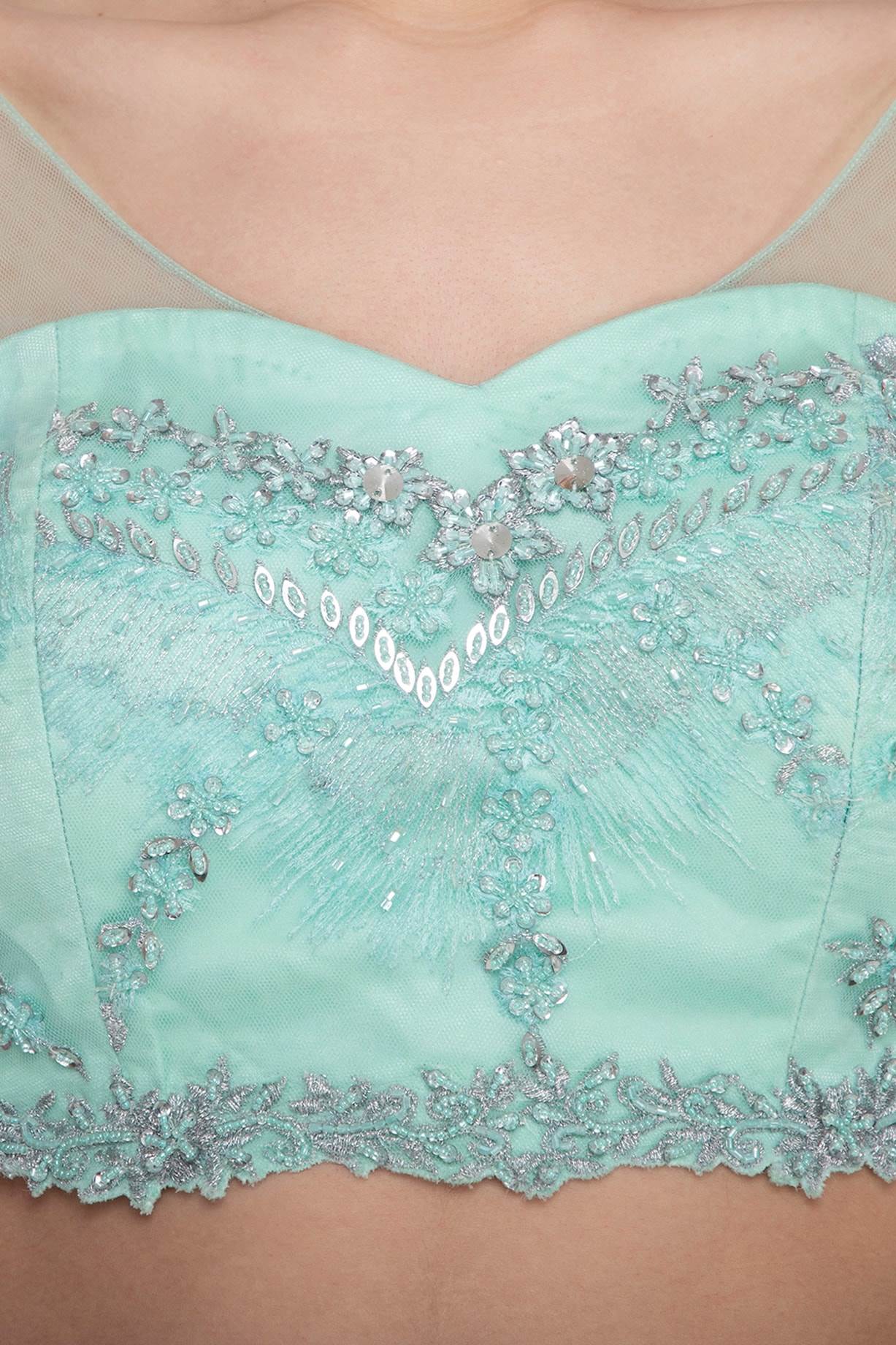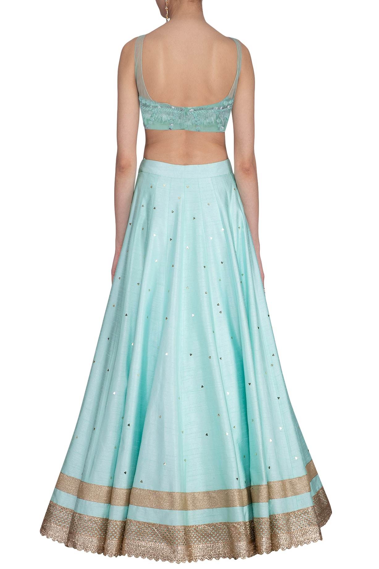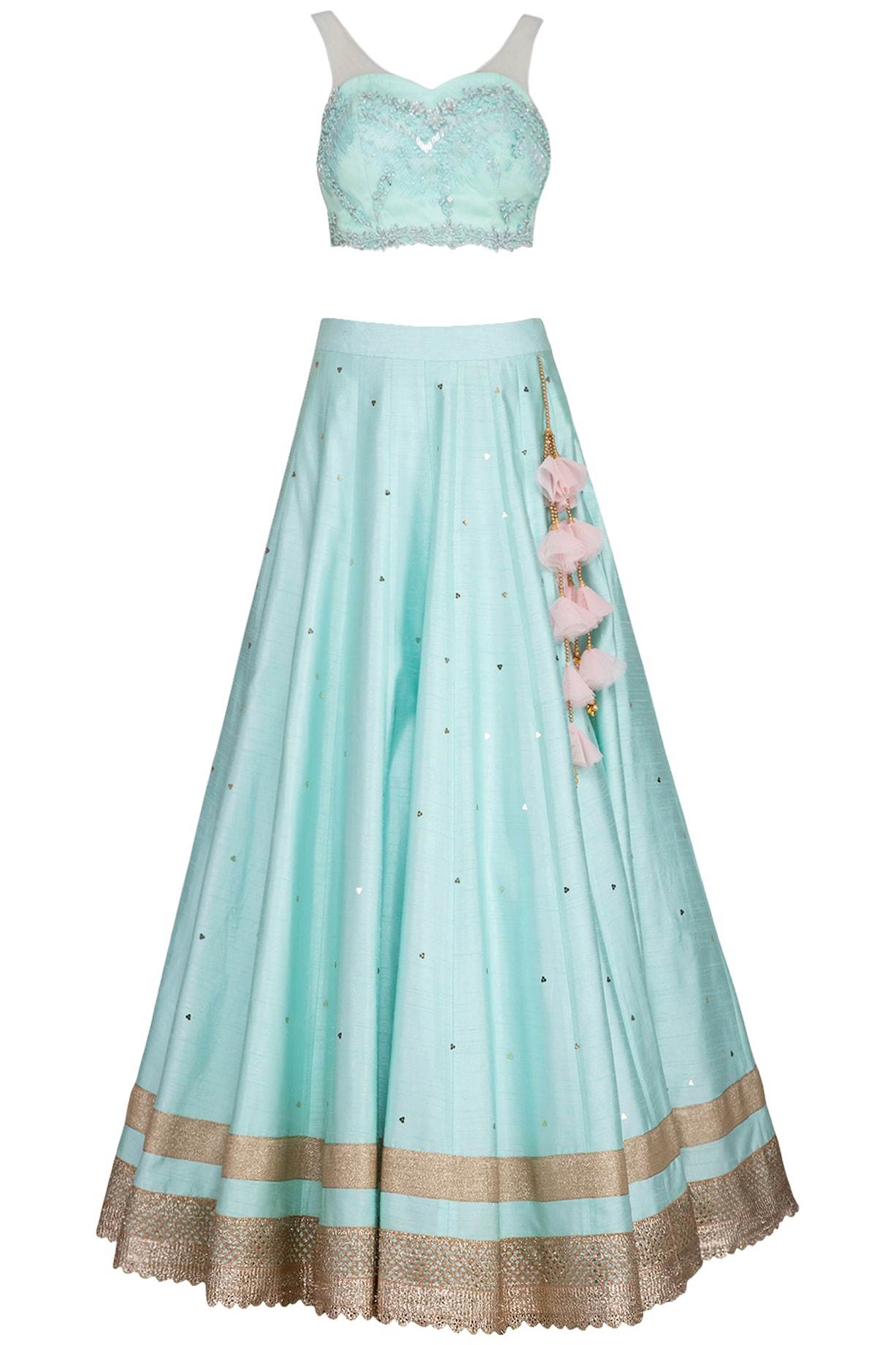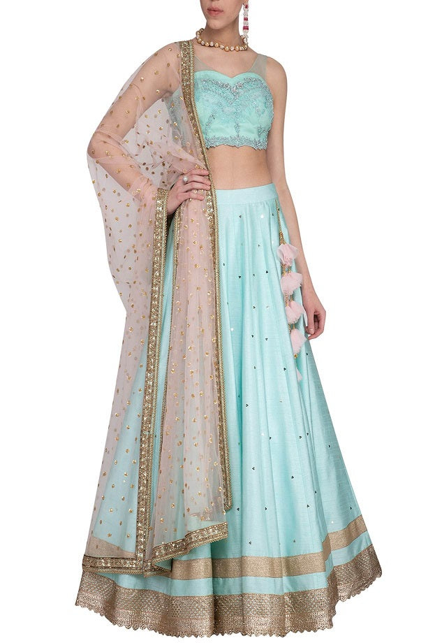 Aqua Bustier with Zari and Sequins Embroidery with dupion silk lehenga and Embroidered Baby Pink Dupatta.