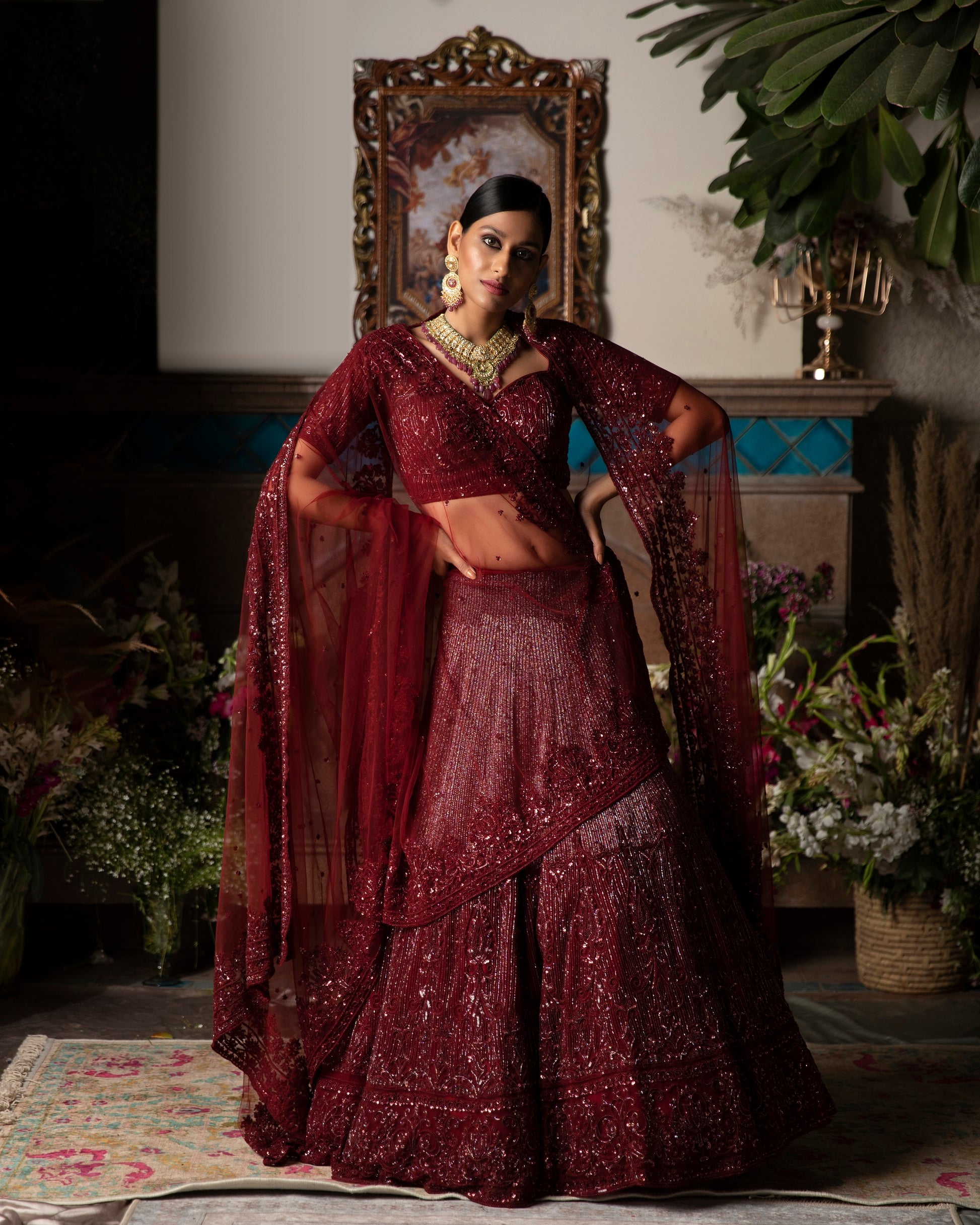 Featuring a burgundy lehenga in net base with thread, cutdana, sequins embroidery. It is paired with matching blouse and net base two dupattas.