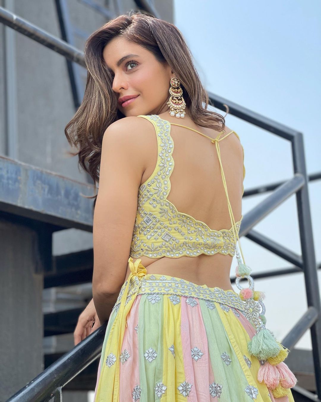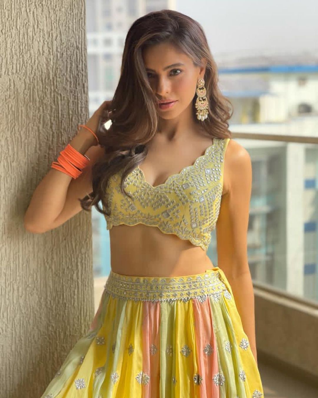 From our Chand collection, this gorgeous multi color ankle length lehenga in tassar silk, is beautifully embellished with silver mirrors and gota appliqué. Paired with a fitted, fully embroidered bustiere-choli and organza dupatta, the starry motifs, myriad mirrors and silvery sheen of gota reminisces the magic of a moonlit night! An ensemble with a young, happy vibe!