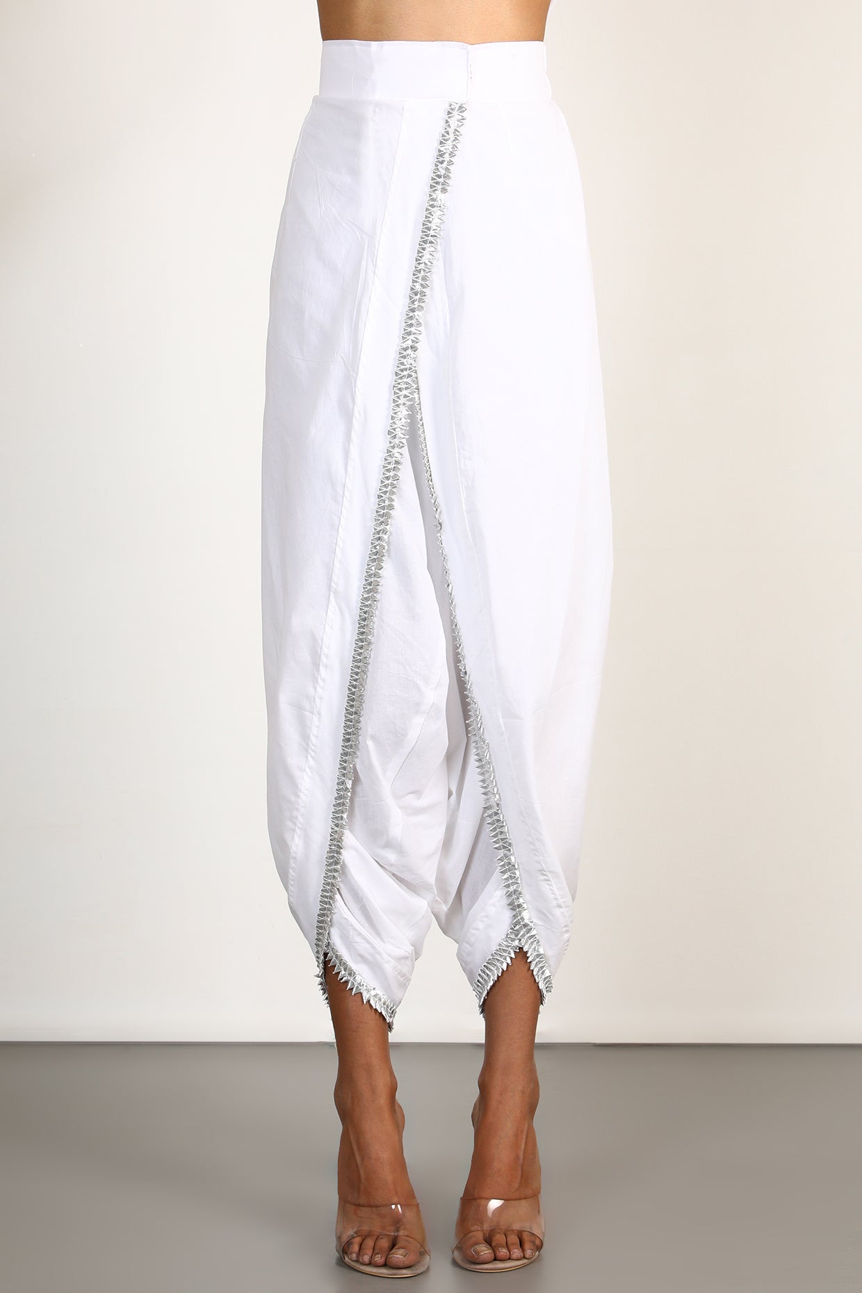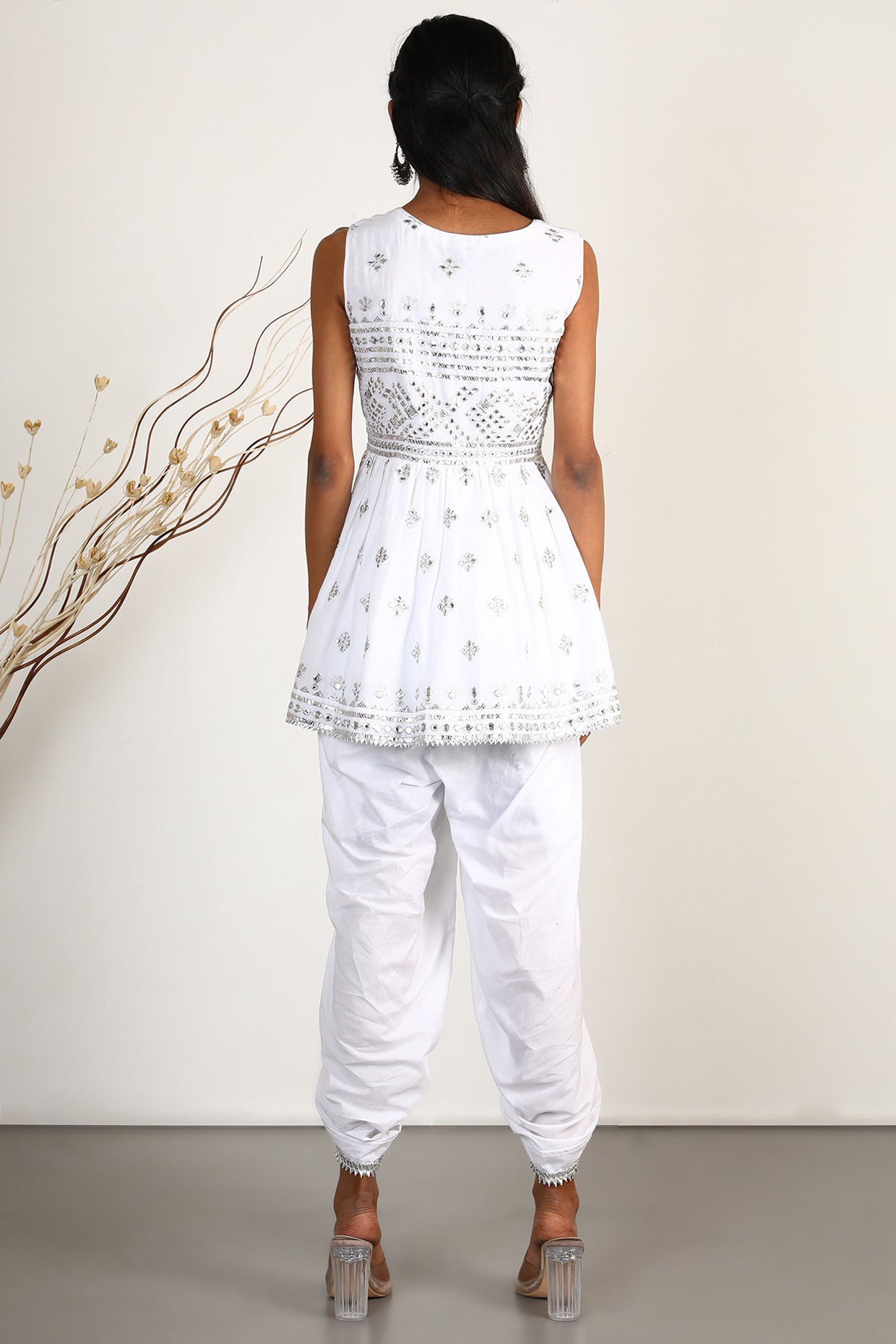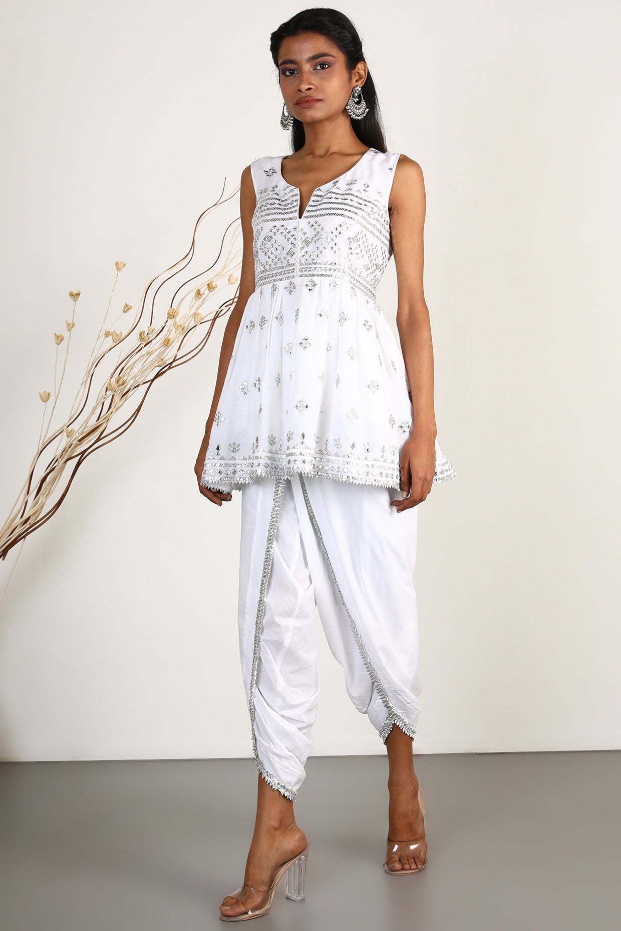 This classic slvless peplum top on cotton silk is paired up with cotton dhoti making it a perfect option for any occasion. The silver applique, mirror and silvery sheen of gota reminisces the magic of moonlight.