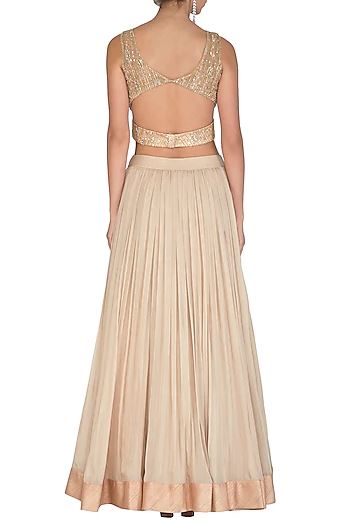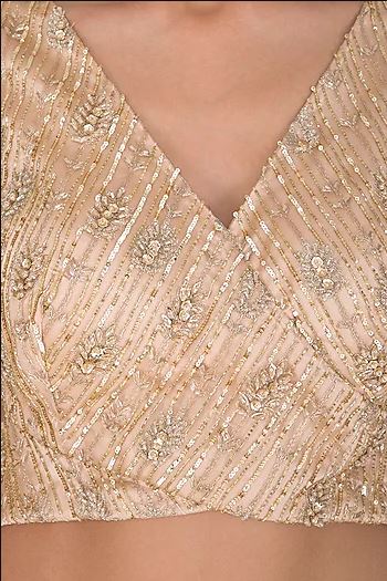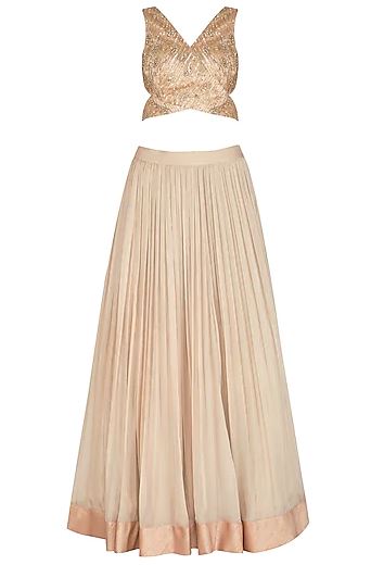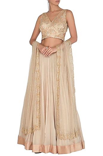 GOLD EMBROIDERED TOP WITH PLEATED LEHENGA AND GOLD EMBROIDERED NET DUPATTA.