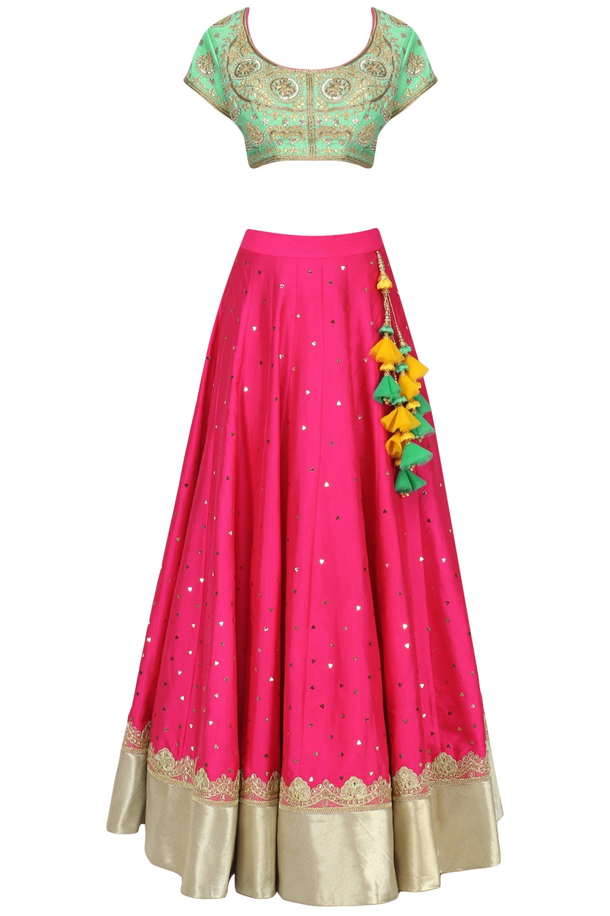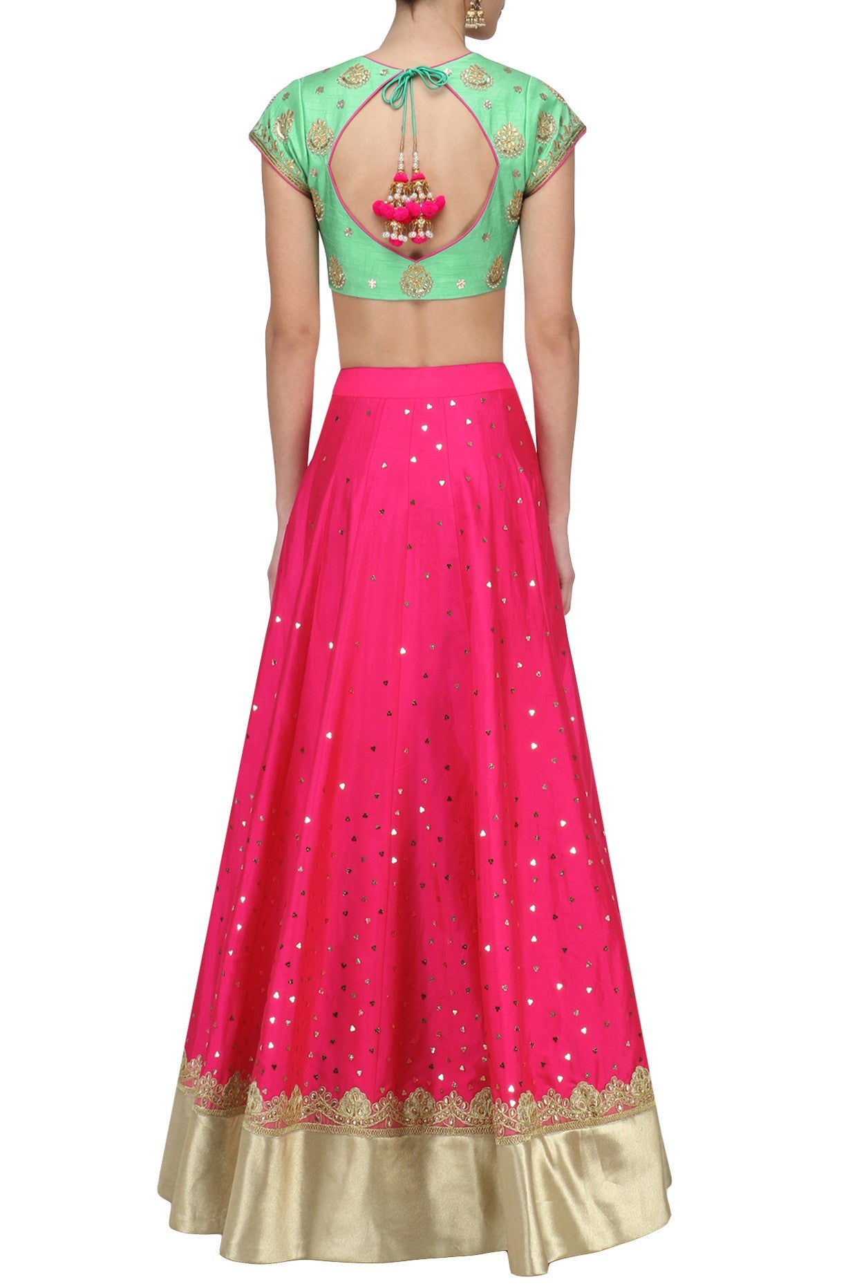 Green Dupion blouse with Gotapatti Work comes with Hot Pink Embroidered Lehenga and Yellow Booti net dupatta with embroidered border.