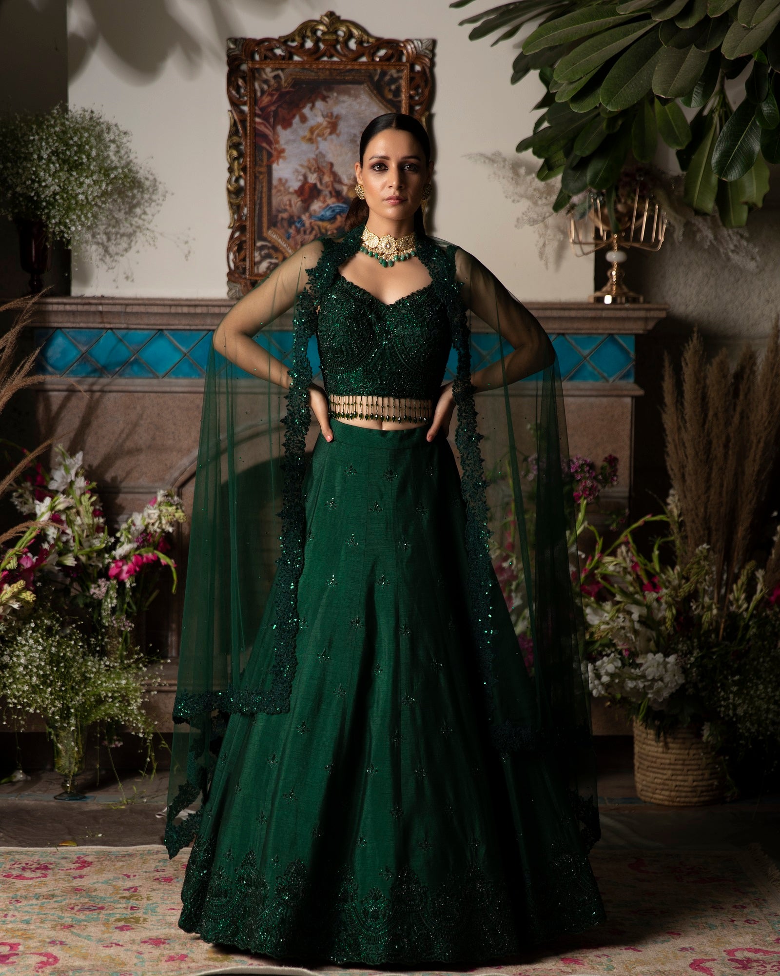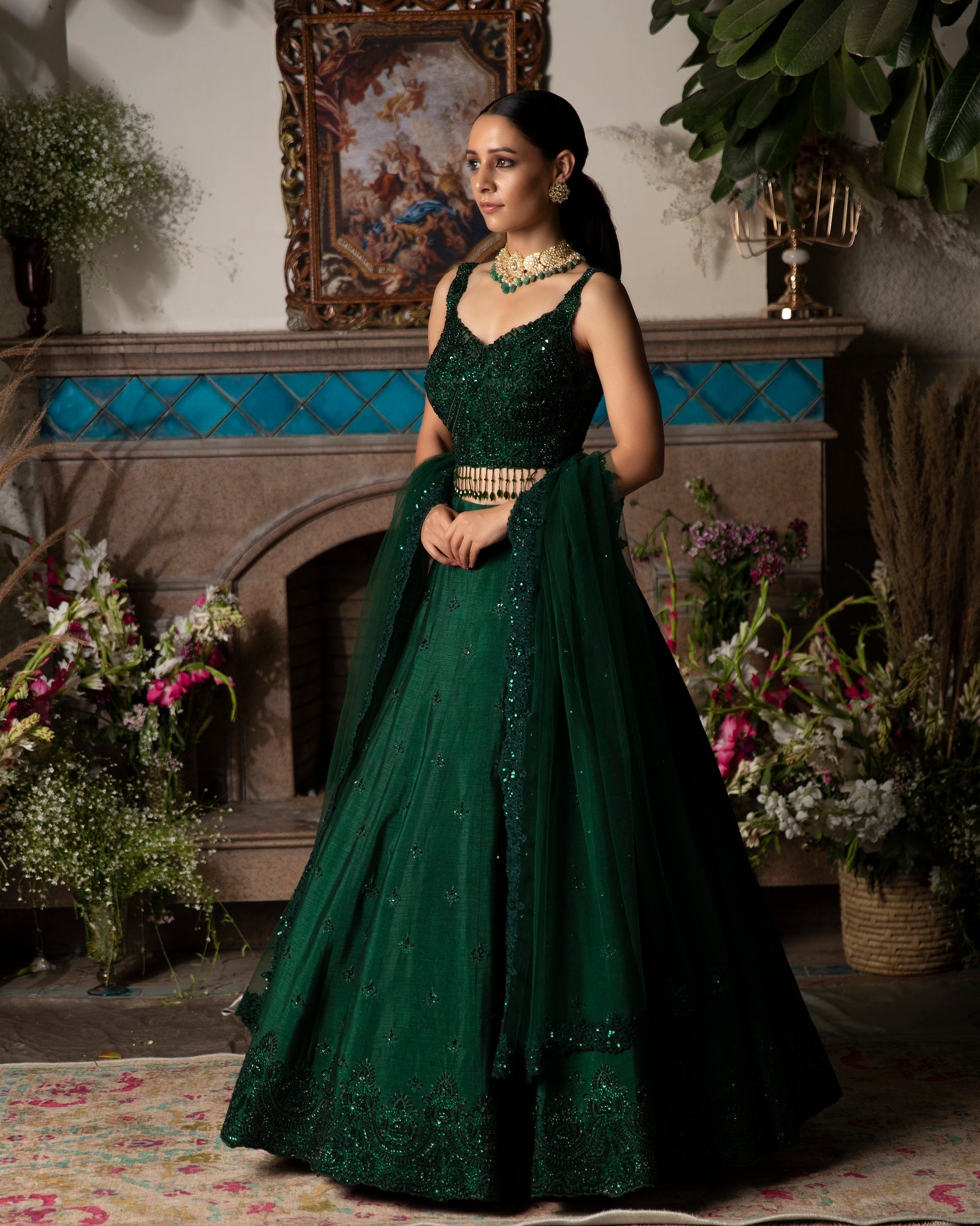 Featuring a green lehenga in dupion base with sequins embroidery. It is paired with a matching scalloped blouse and a net dupatta.