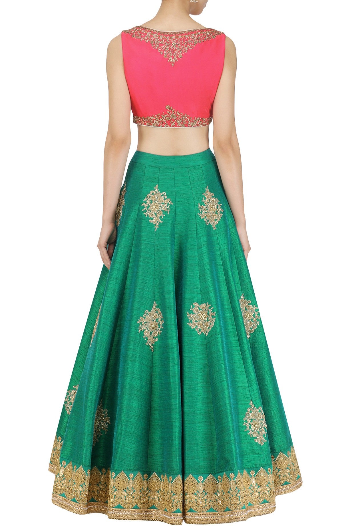 Green rawsilk skirt comes with hot pink blouse mustard embroridered dupatta