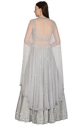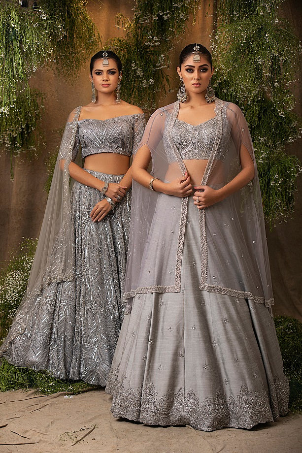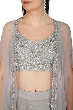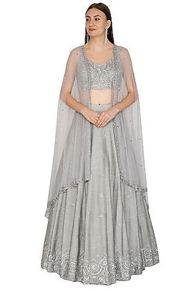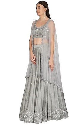 Featuring a steel grey lehenga skirt in dupion silk base with cutdana and sequins embroidery. It is paired with a matching sleeveless blouse and cape in soft net base.