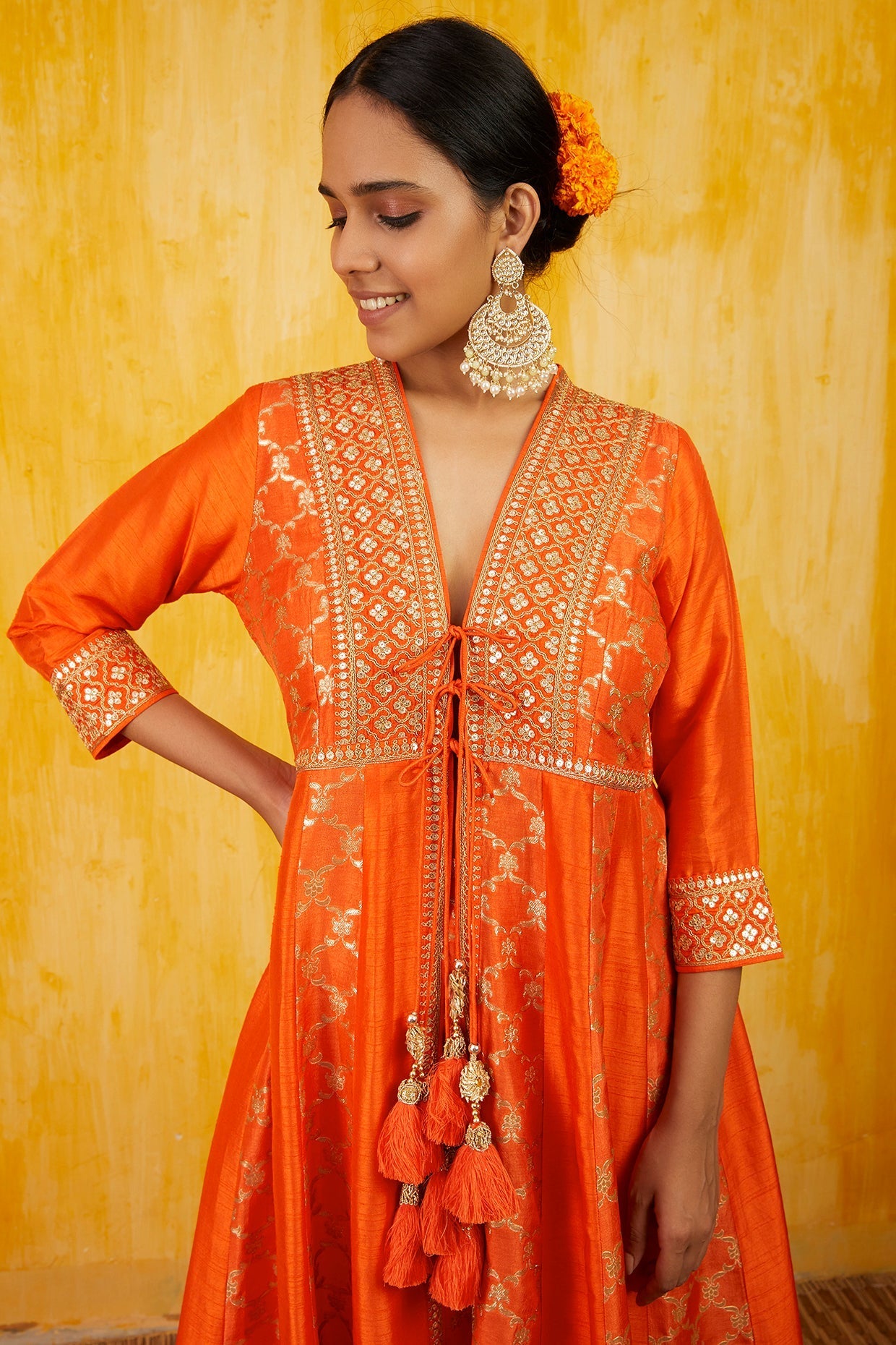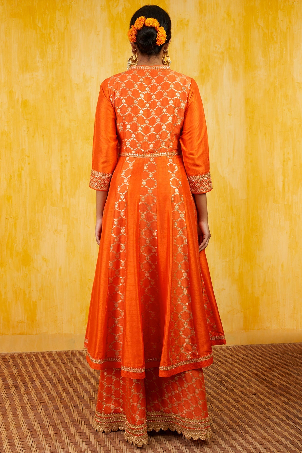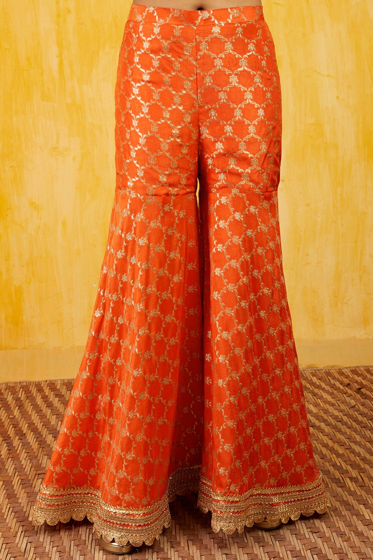 Using exquisite marodi embroidery, jewelled tone tassar silk and hand woven silk brocade, this open jacket, palazzo set in orange is a great for a night of revelry. Feel like royalty in our Marigold Brocade collection!