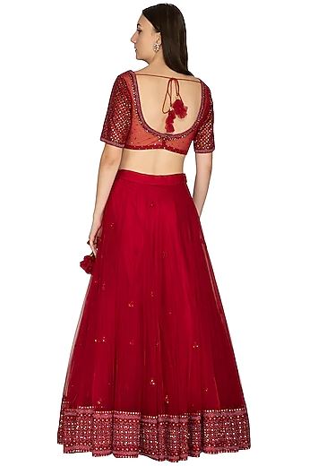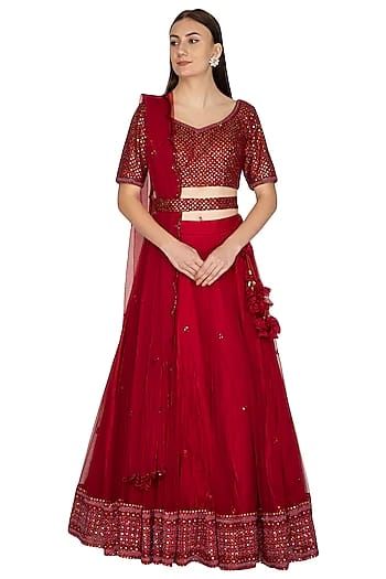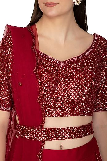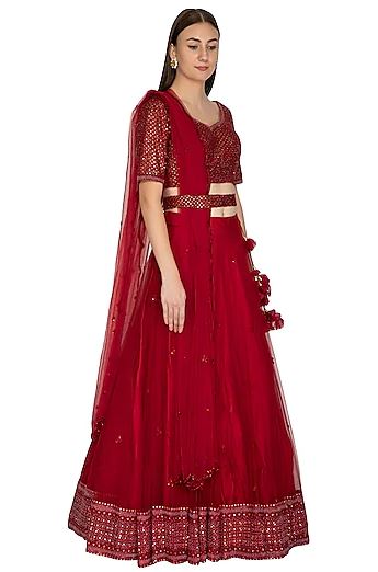 FEATURING MAROON LEHENGA SKIRT IN NET BASE WITH EMBROIDERED SWAROVSKI BORDER.IT IS PAIRED WITH MAROON EMBROIDERED OFFSHOULDER BLOUSE , A BELT AND AN EMBROIDERED DUPATTA IN NET BASE.