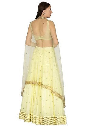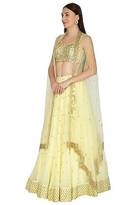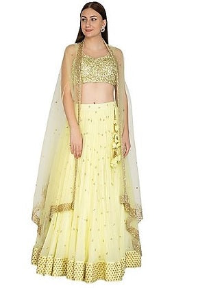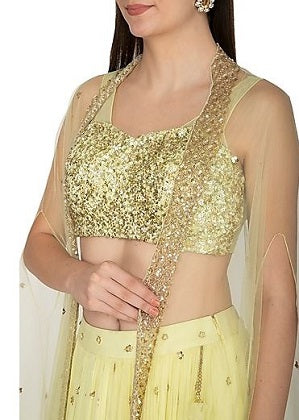 Featuring a lime green gathered lehenga skirt in georgette base with sequins and swarovski embroidery. It is paired with a matching blouse and cape in net base.