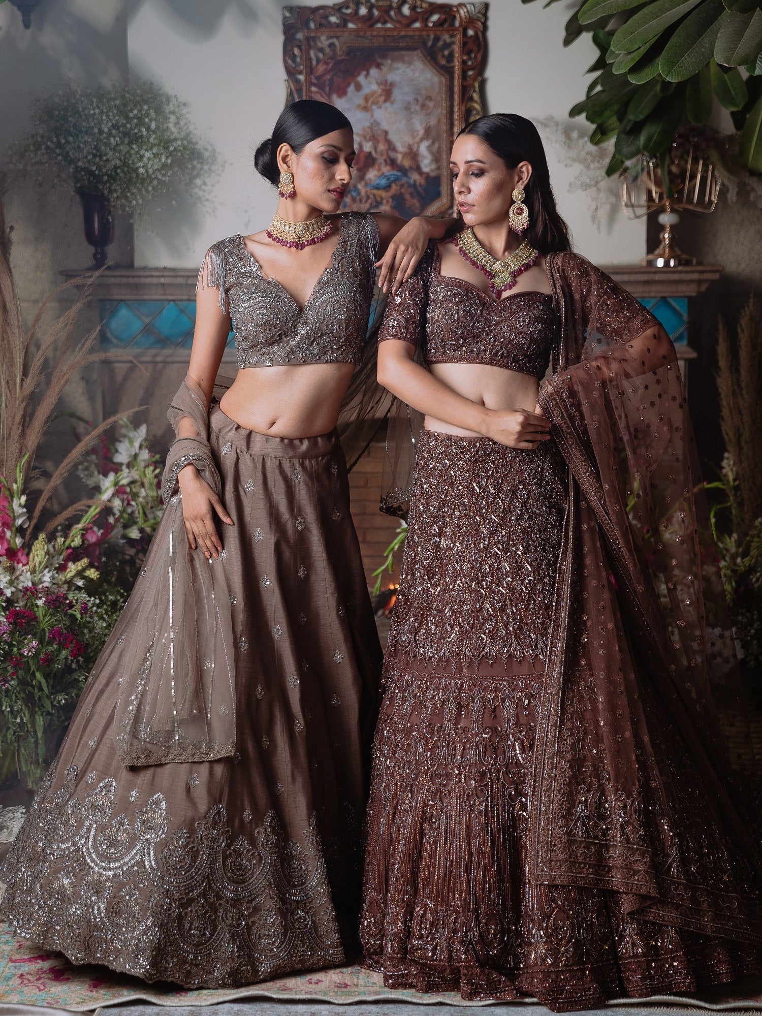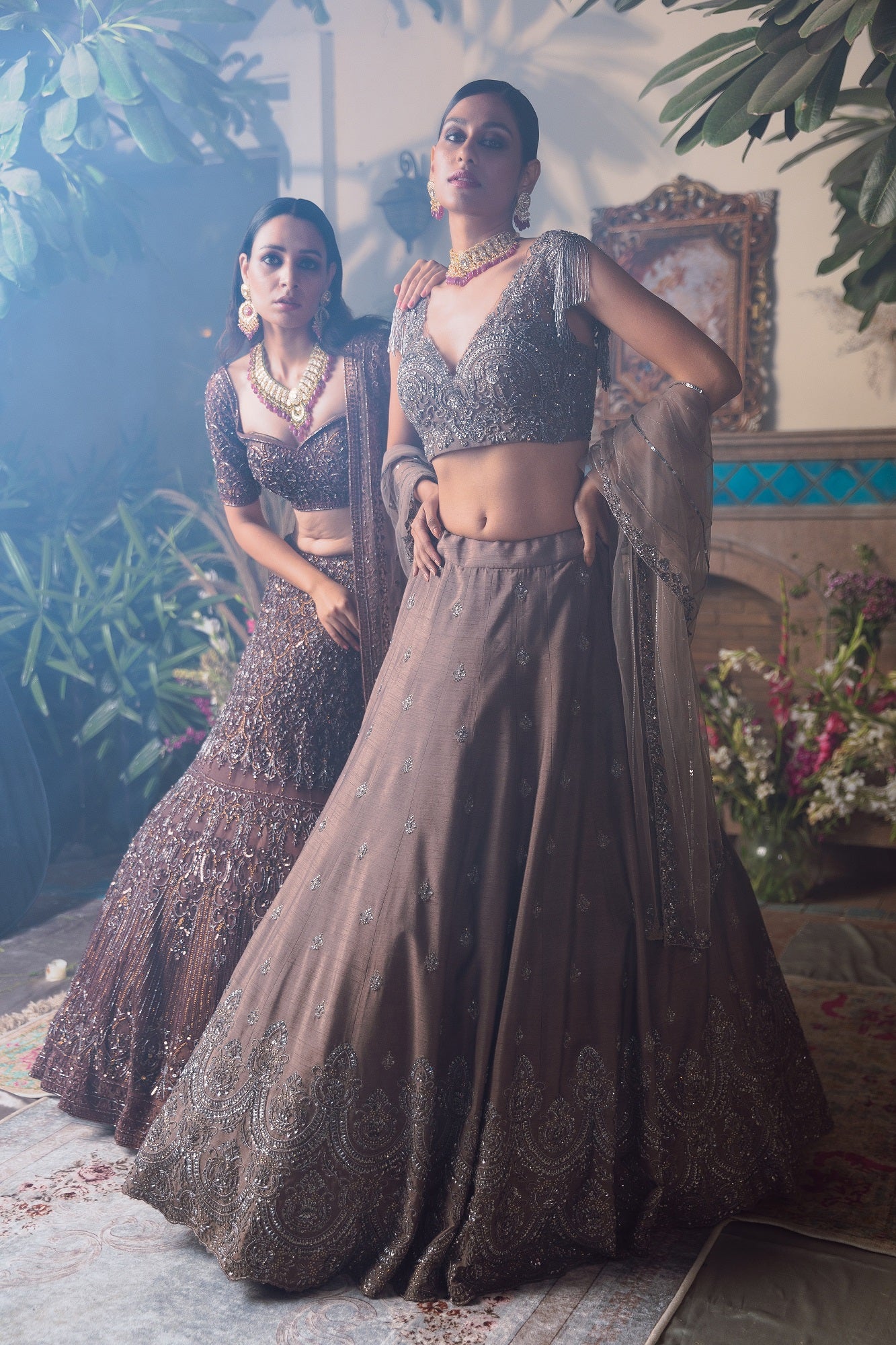 Featuring a mouse grey lehenga in dupion base with sequins embroidery. It is paired with a matching scalloped blouse and a net dupatta.