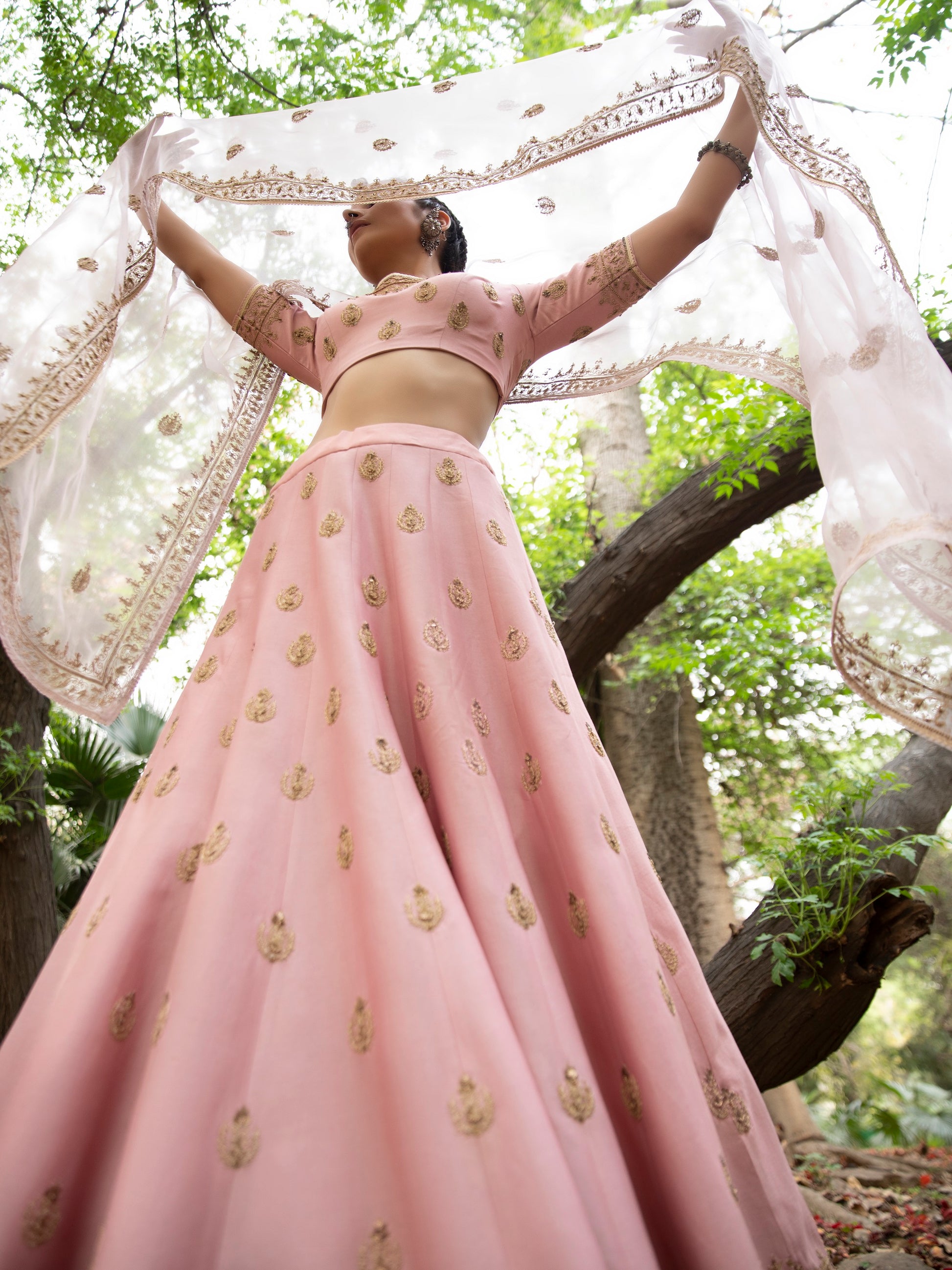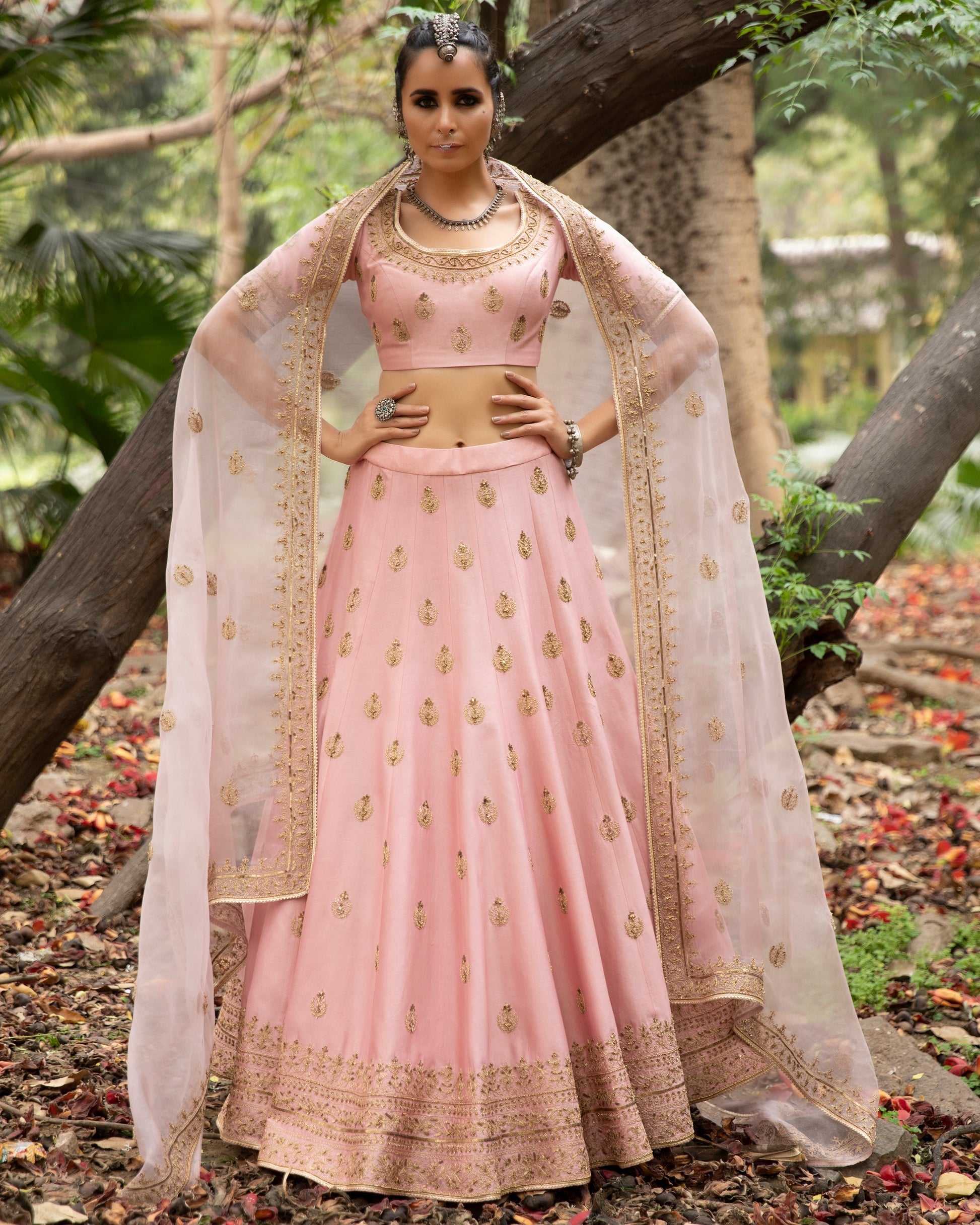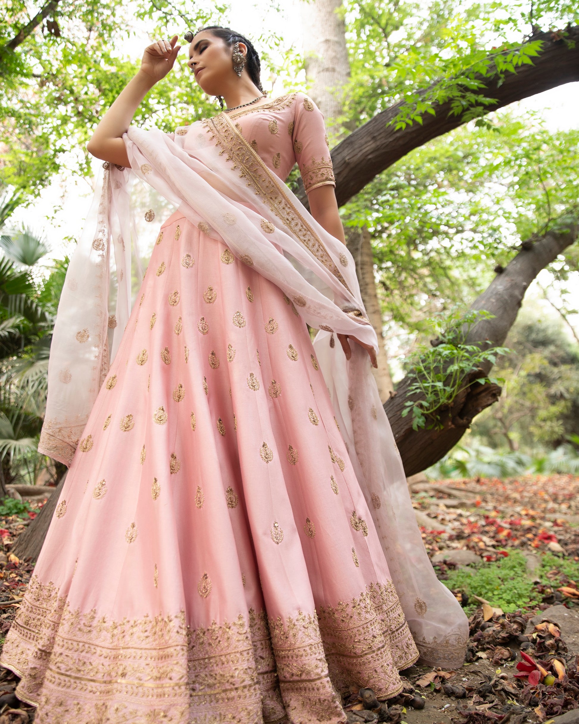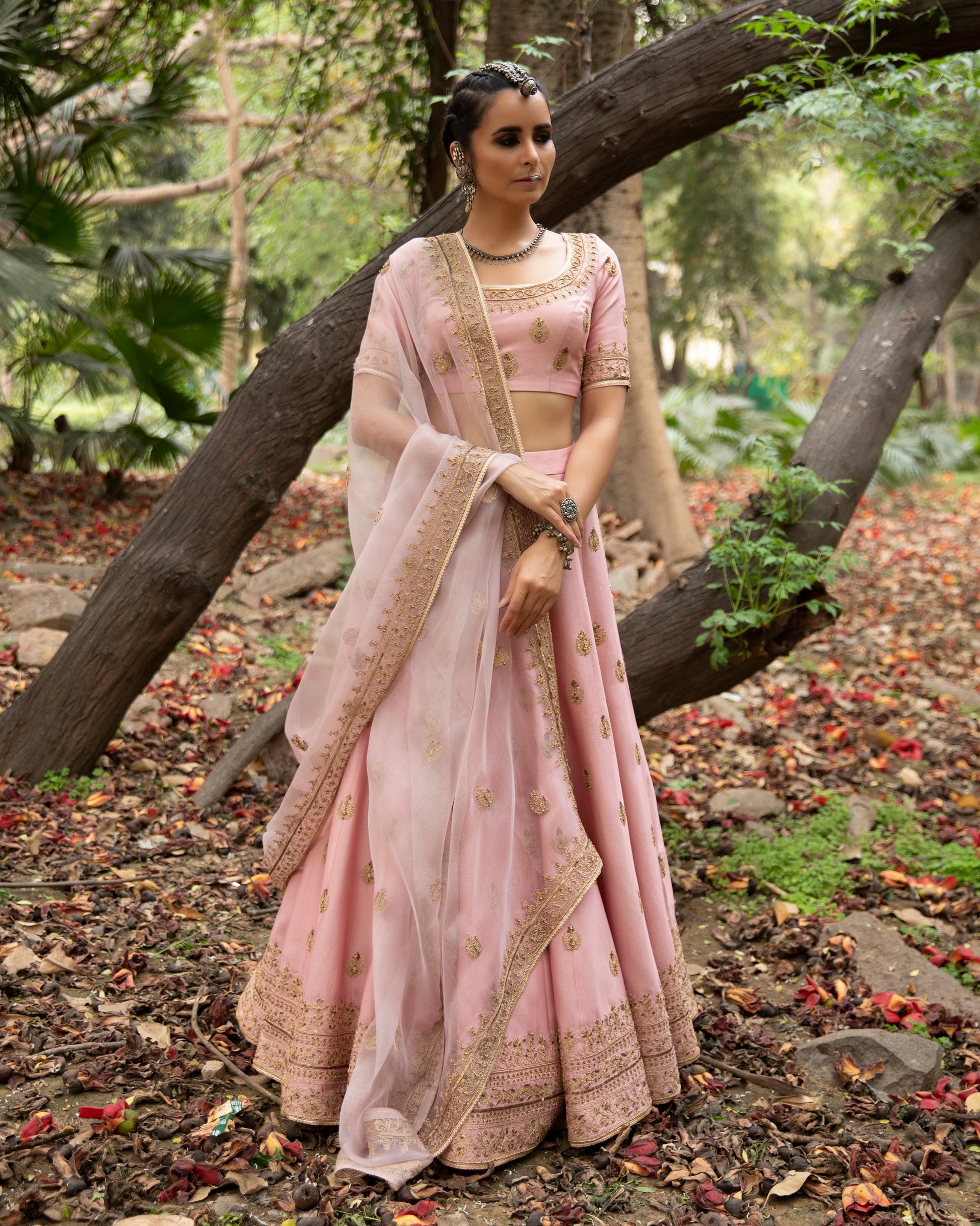 Featuring a mouve lehenga in chanderi base with dori and sequins embroidery. It is paired with matching blouse and organza base dupatta.