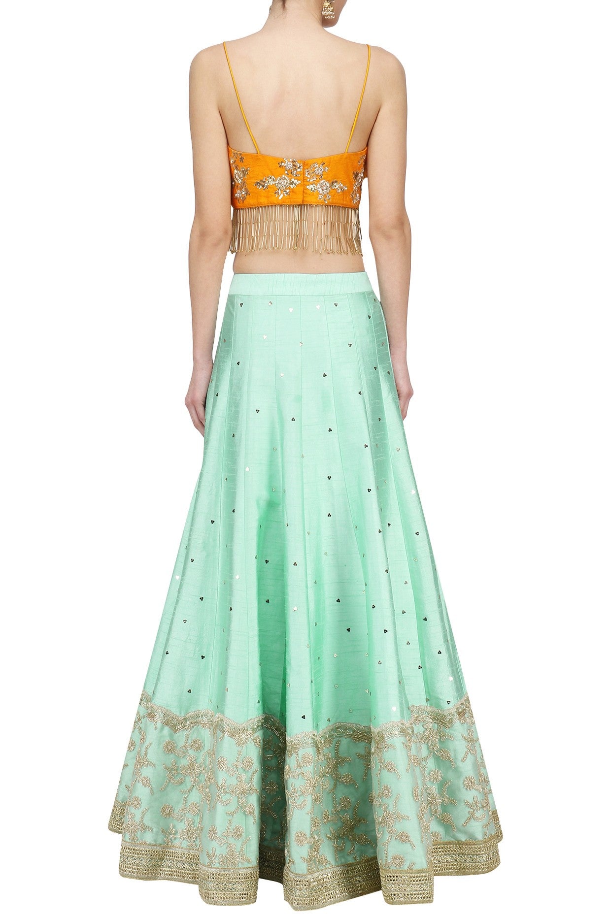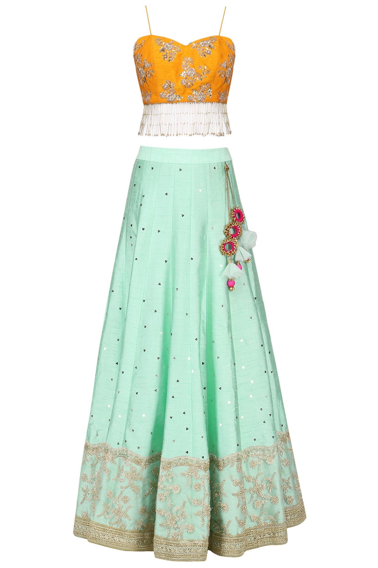 Mustard dupion embroidered bustier with aqua dupion embroidered lehenga and Mustard scallope embroidered dupatta
