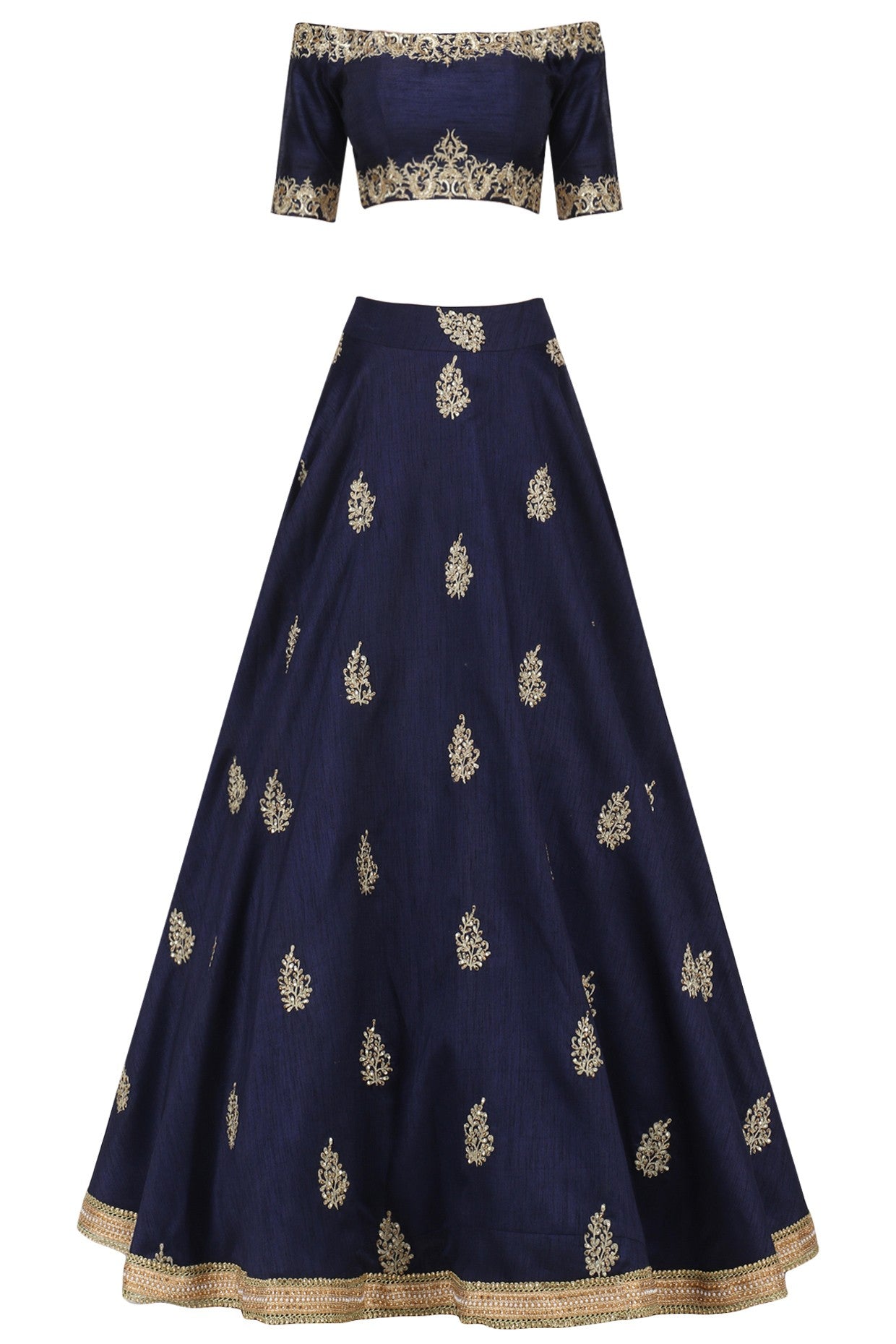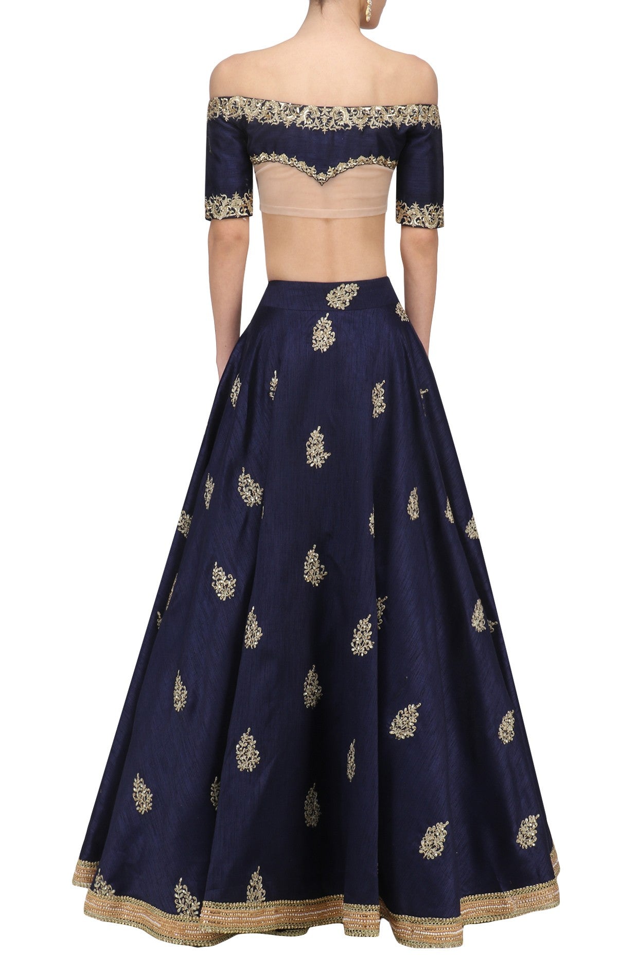 Navy Blue dupion off shoulder embroidered blouse with navy blue embroidered lehenga and Baby pink scallope embroidered dupatta