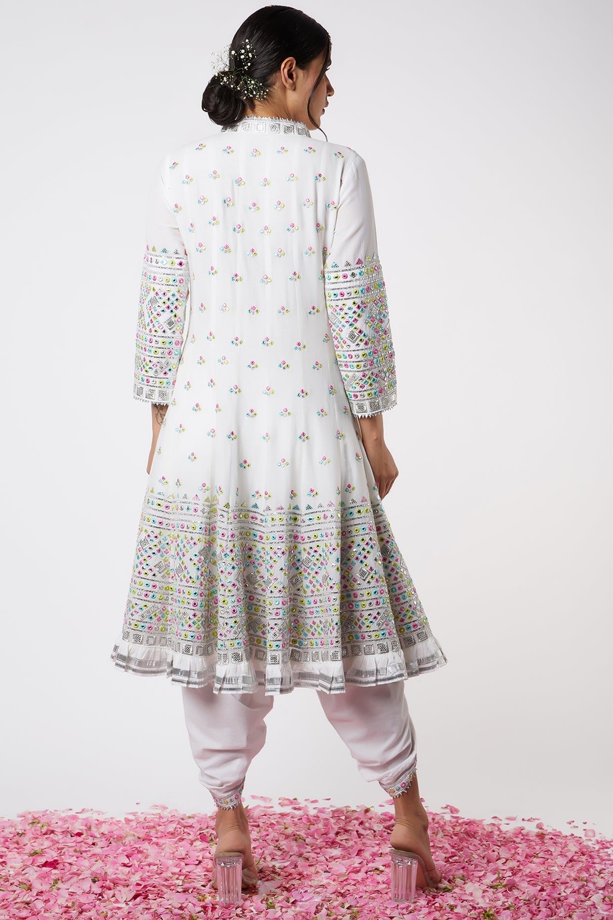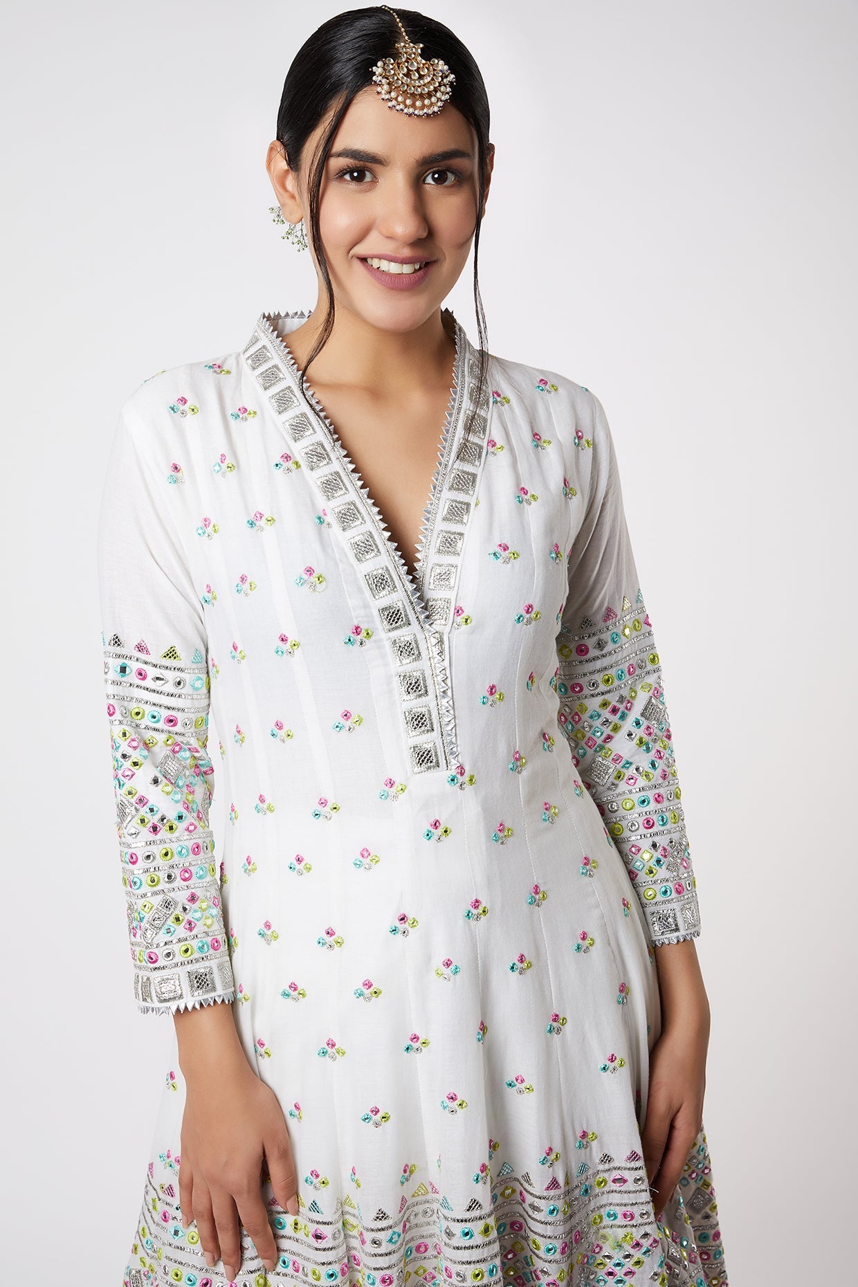 This anarkali in yellow is embroidered with zardosi and delicate gota motifs all over highlighting the neckline.. Paired with a matching dhoti, it is a smart, young silhouette perfect for day festivities.