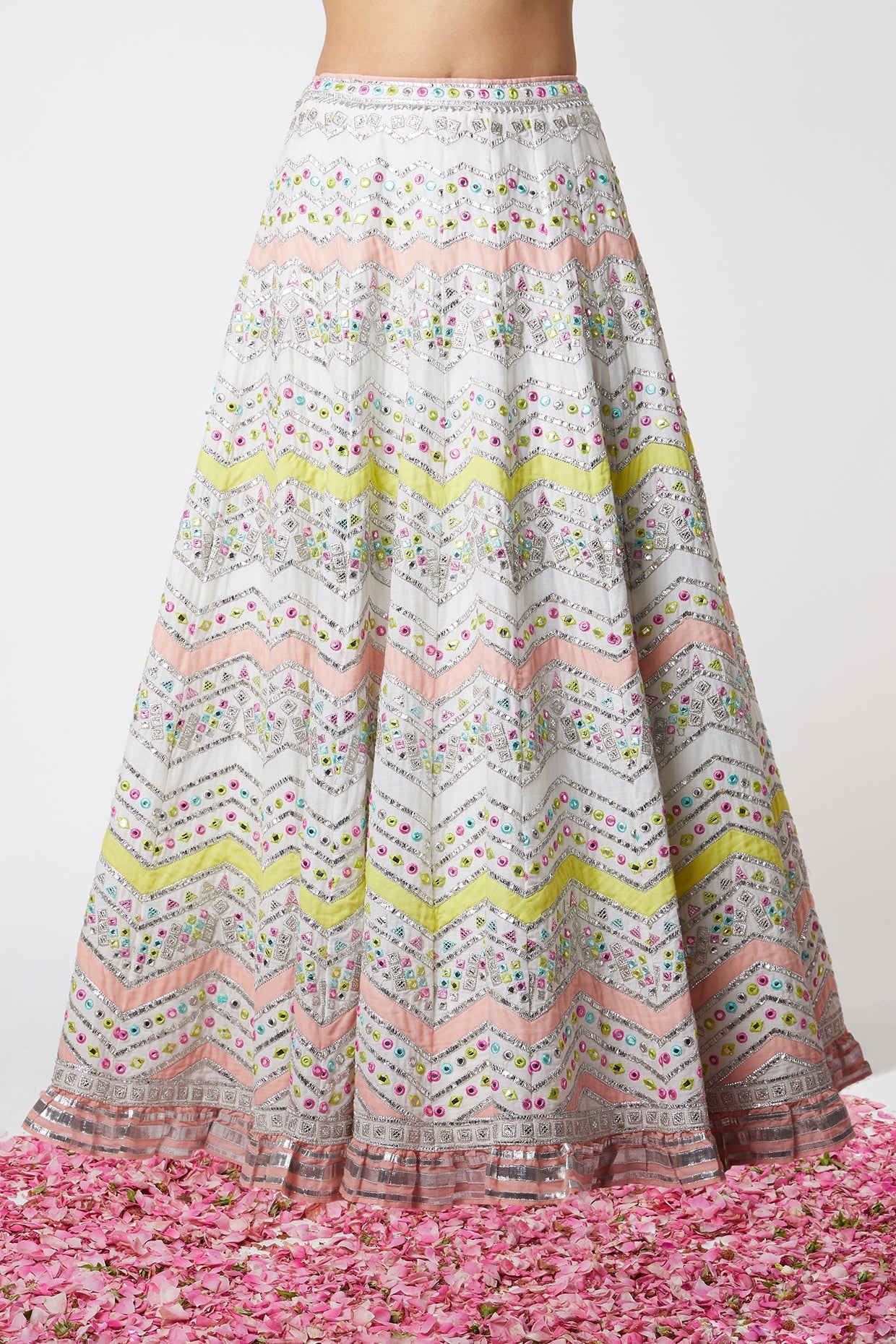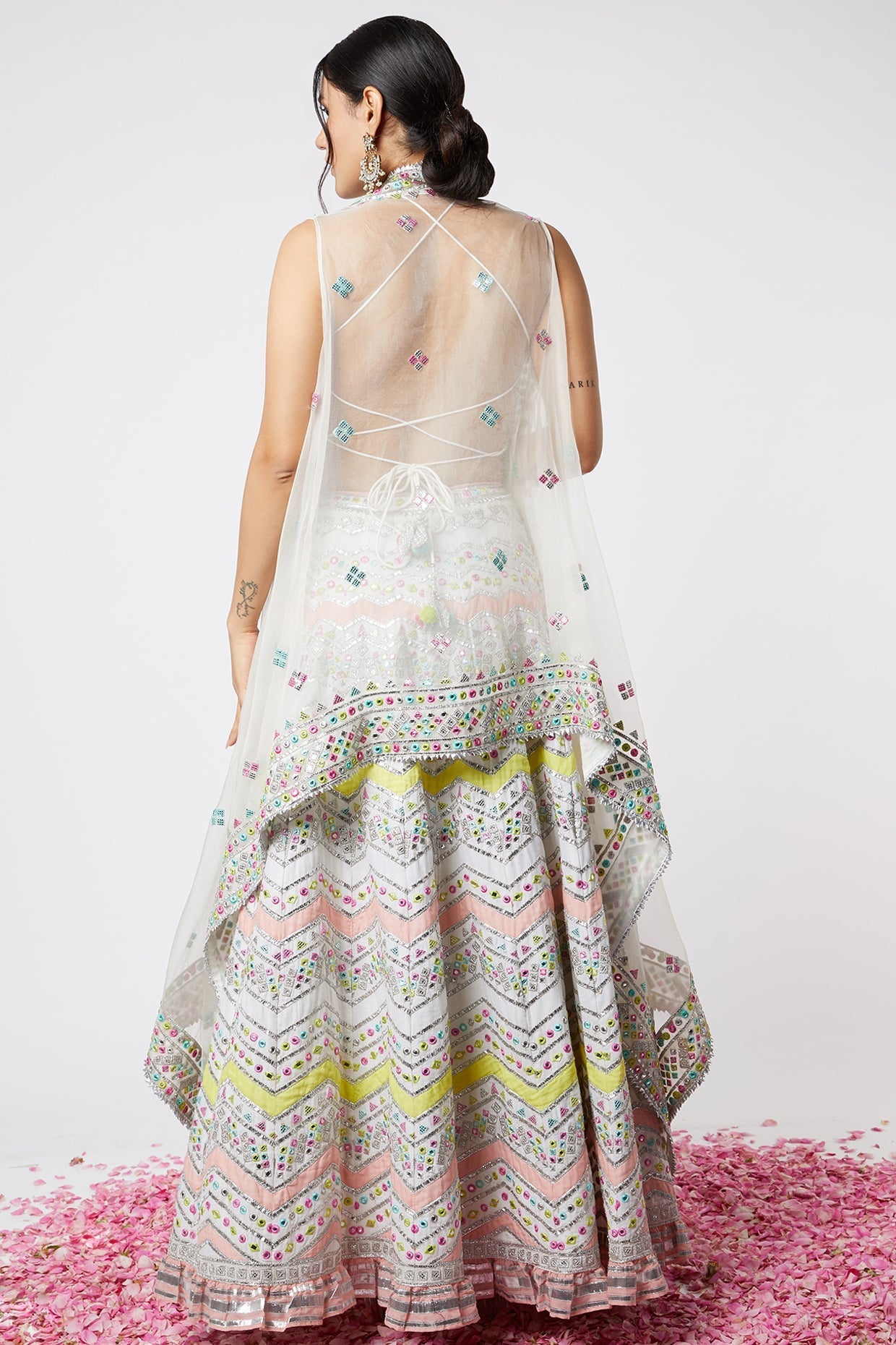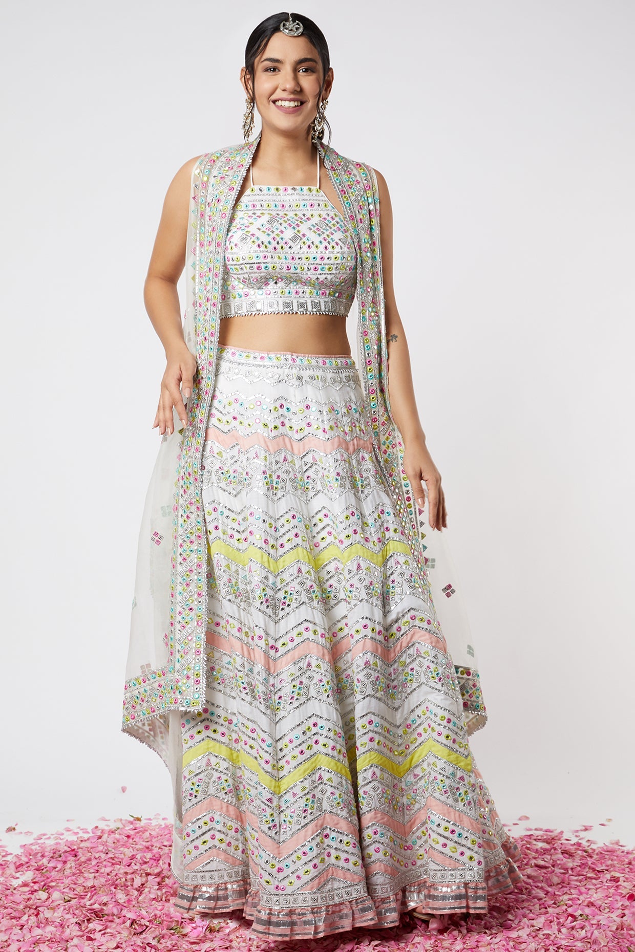 Featuring this gorgeous chevron lehenga set In soft cotton, with gota highlights all over. Paired with a fully embroidered criss cross bustier and cape. The embroidery combines silver with pretty turquoise and pink threadwork and coloured tassels that give this a young, happy vibe!