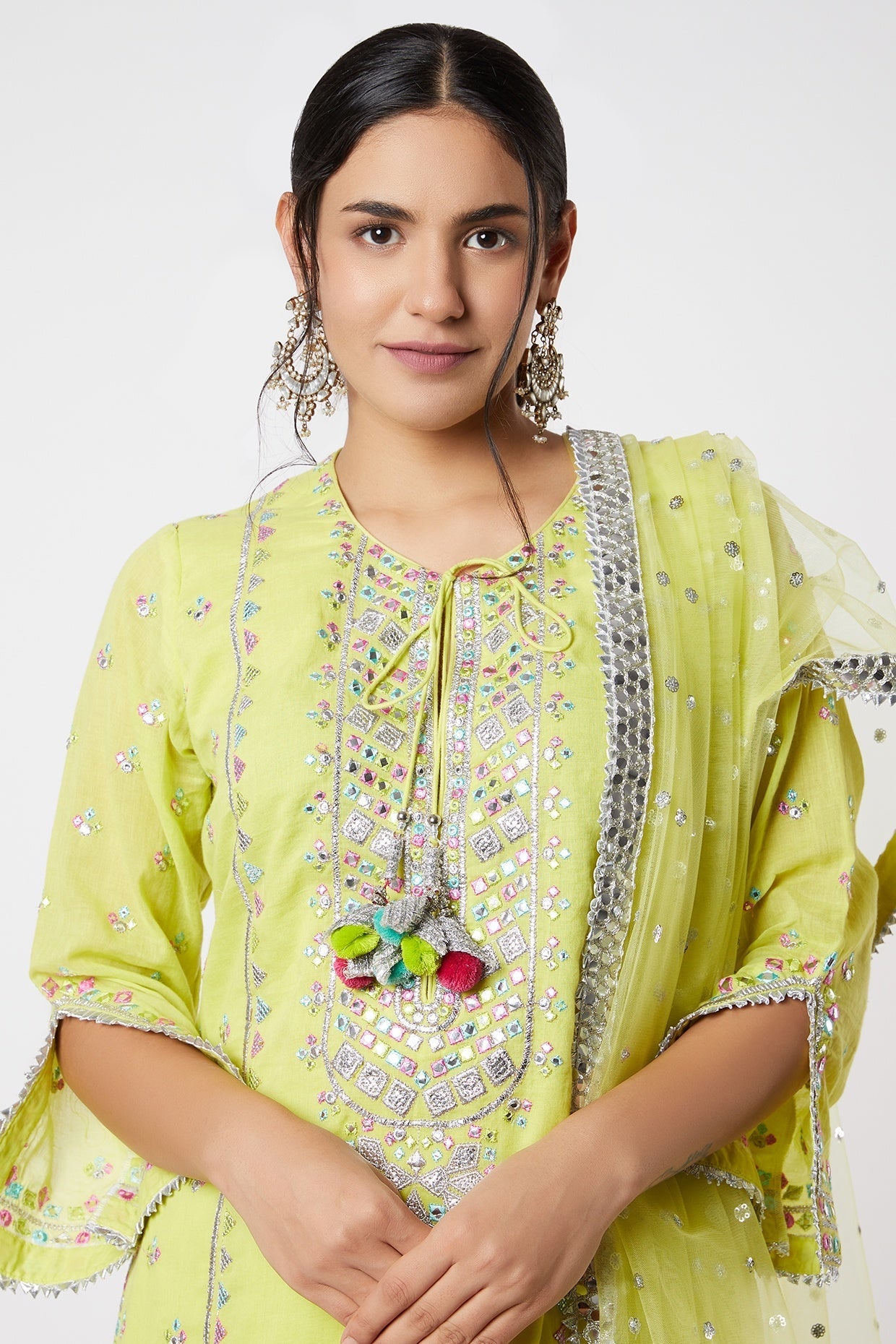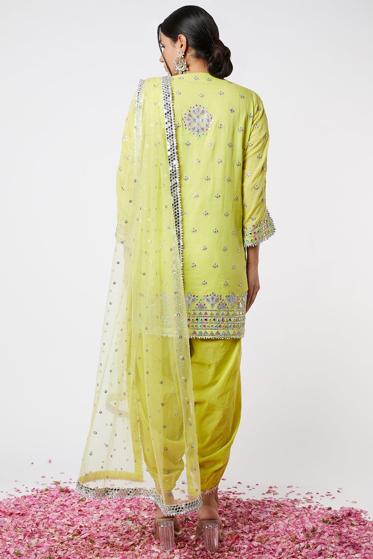 This short kurta on cotton silk is paired up with cotton dhoti and net dupatta, making it a perfect option for any occasion. The silver applique, mirror and bright threadwork highlighting the neckline and bottom of the kurta gives it a festive look. The colorful tassels brings fun to the ensemble.
