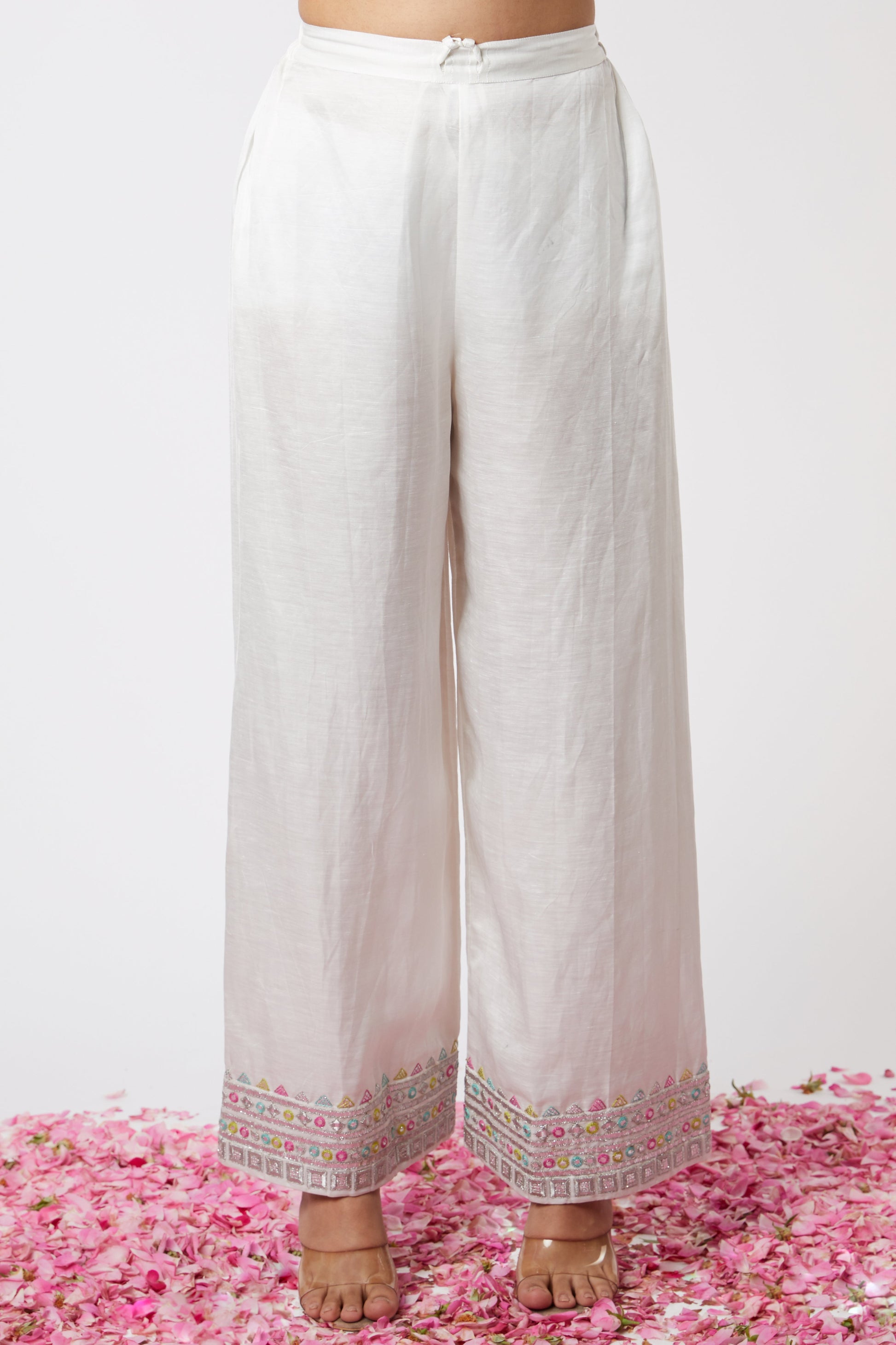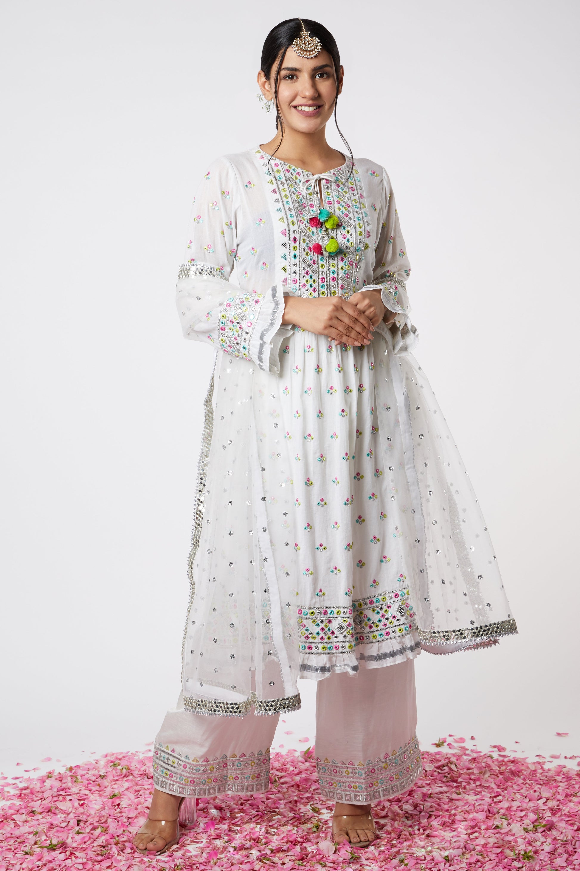 Featuring this tunic embellished with applique, mirror and bright threadwork all over, highlighting the neckline and bottom. Gathers on the waistline gives a natural flow to the outfit. The embroidered dupatta and palazzo gives it a young and festive look.