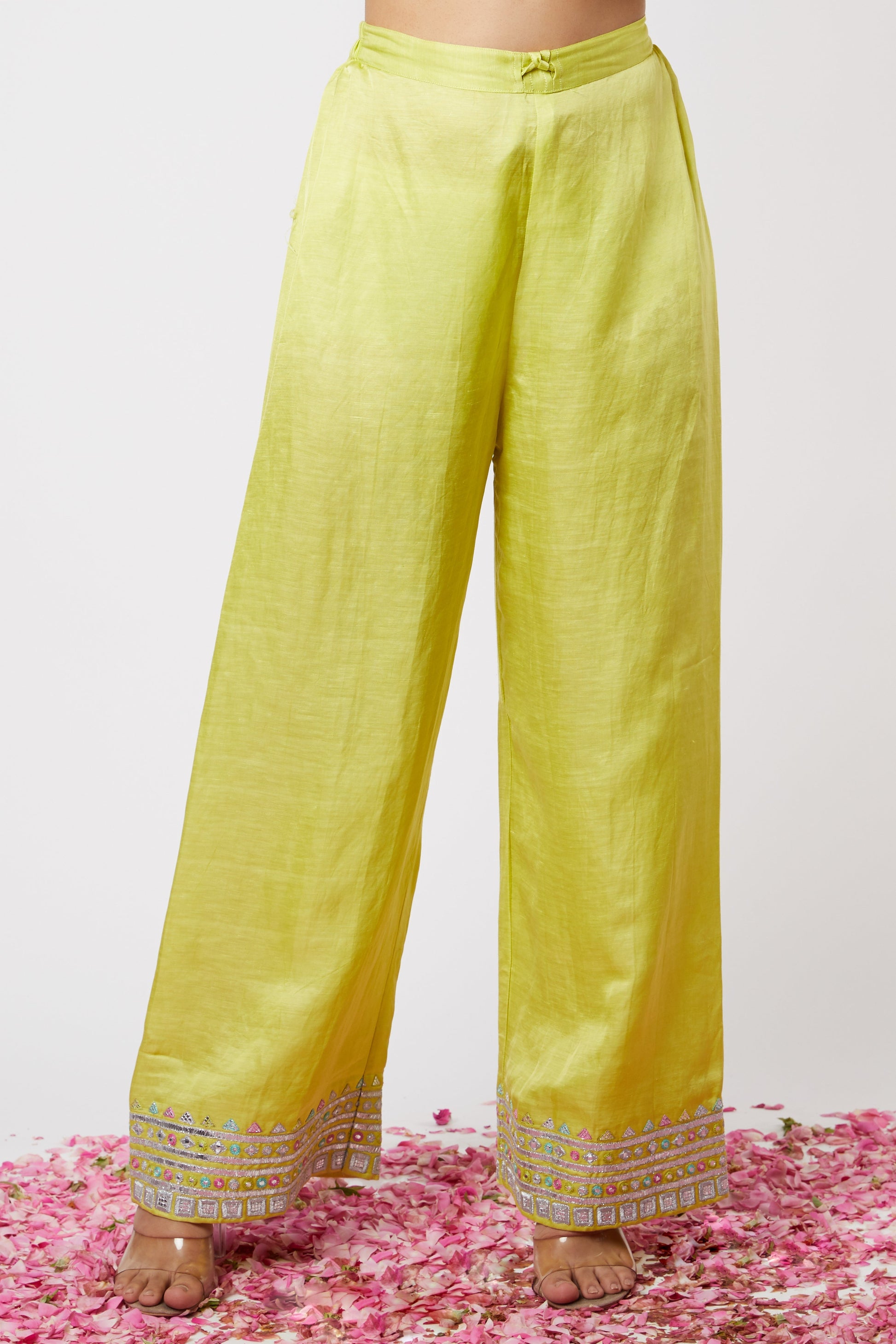 Featuring this tunic embellished with applique, mirror and bright threadwork all over, highlighting the neckline and bottom. Gathers on the waistline gives a natural flow to the outfit. The embroidered dupatta and palazzo gives it a young and festive look.