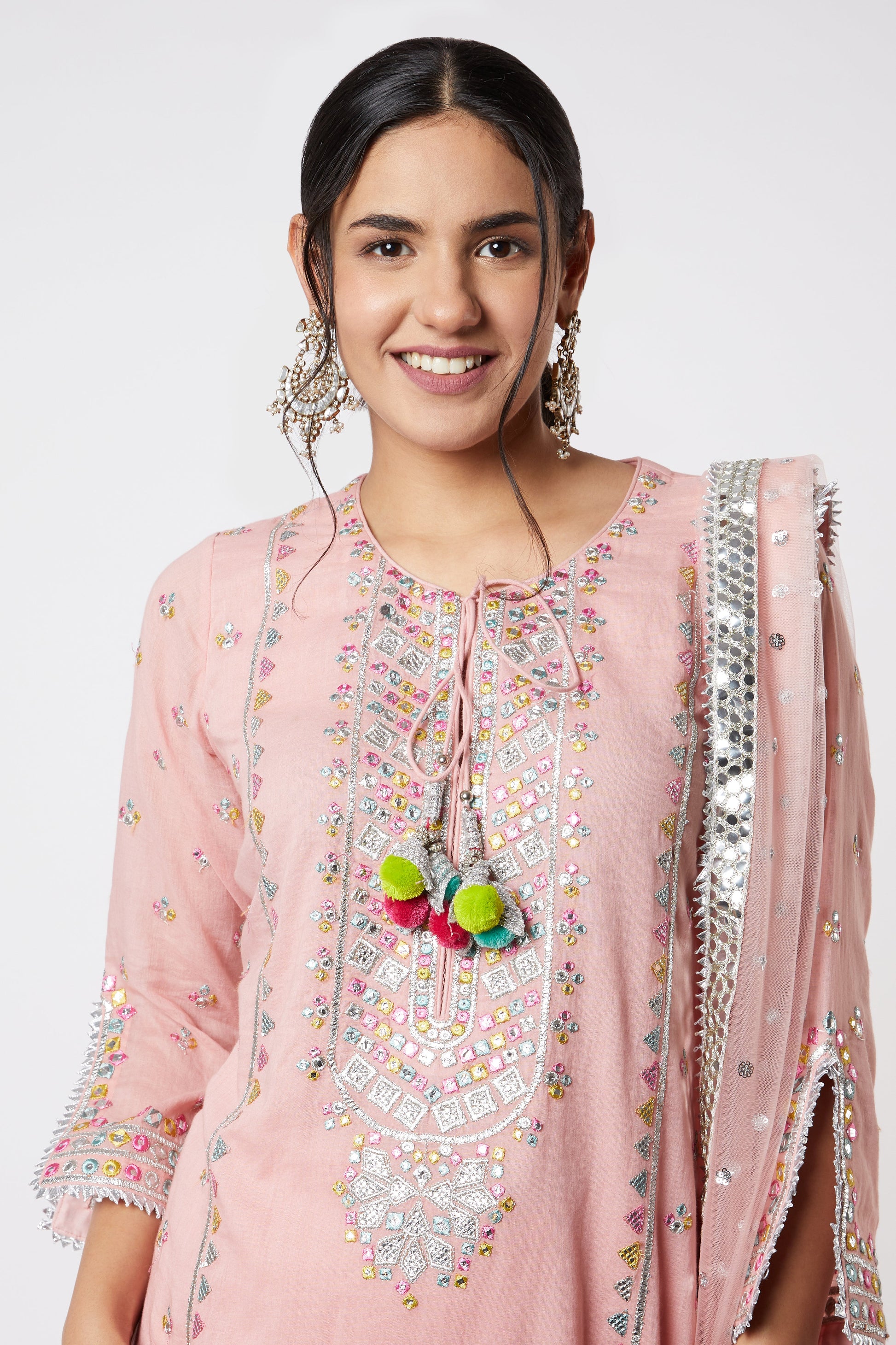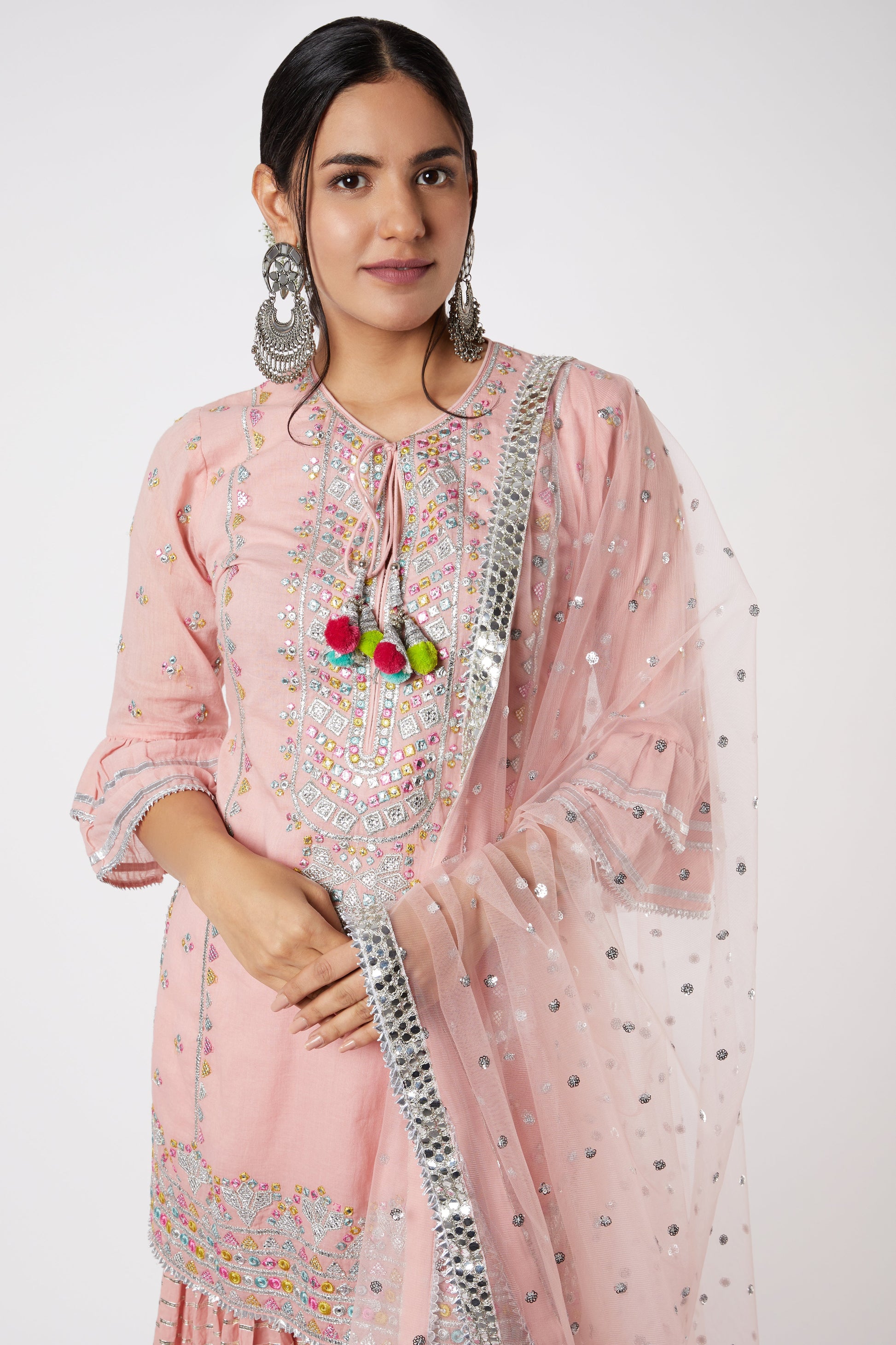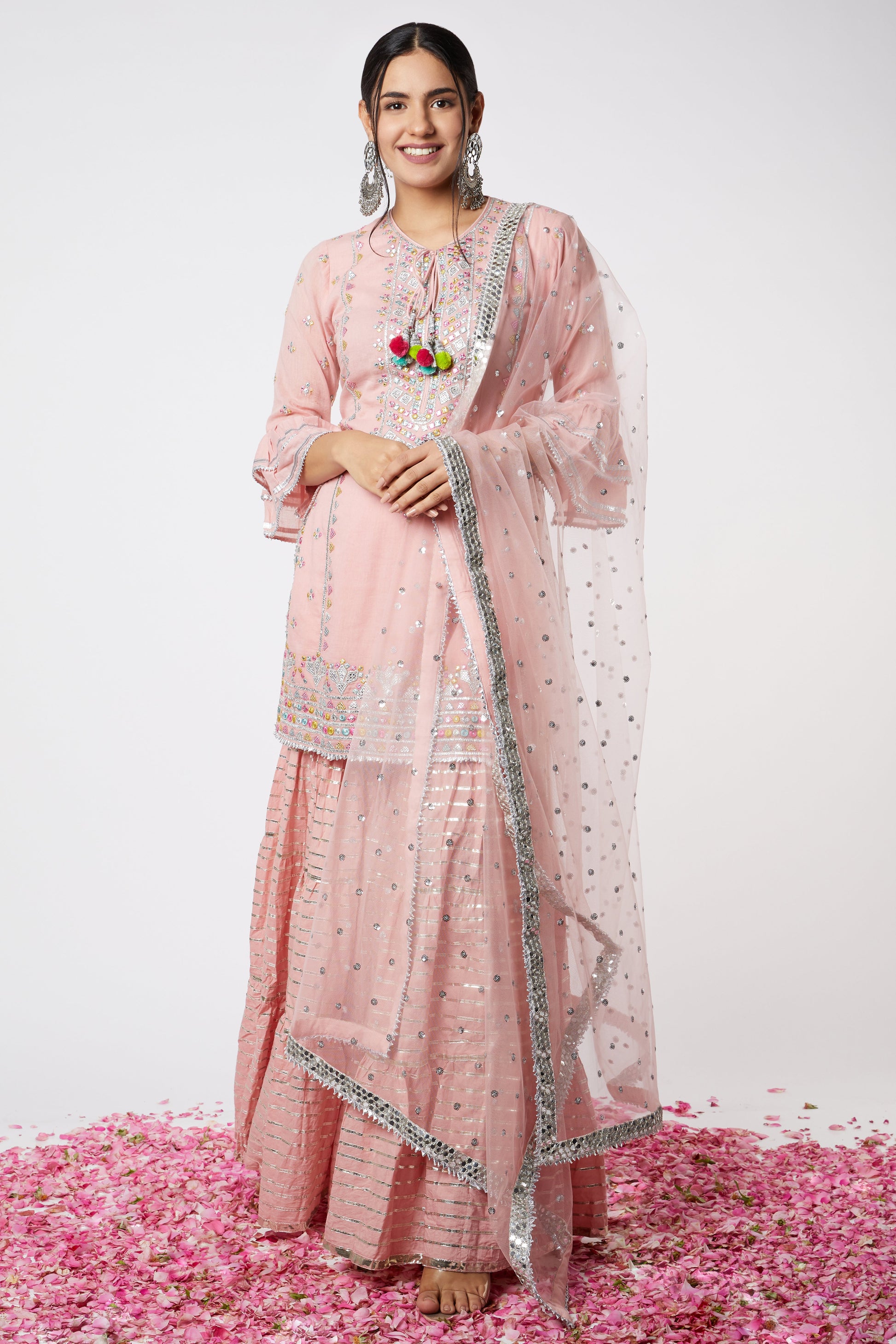 This cotton silk, short length, bright lime kurta is embellished with applique and mirror. The sharara with gota highlights and net dupatta completes the ensemble.