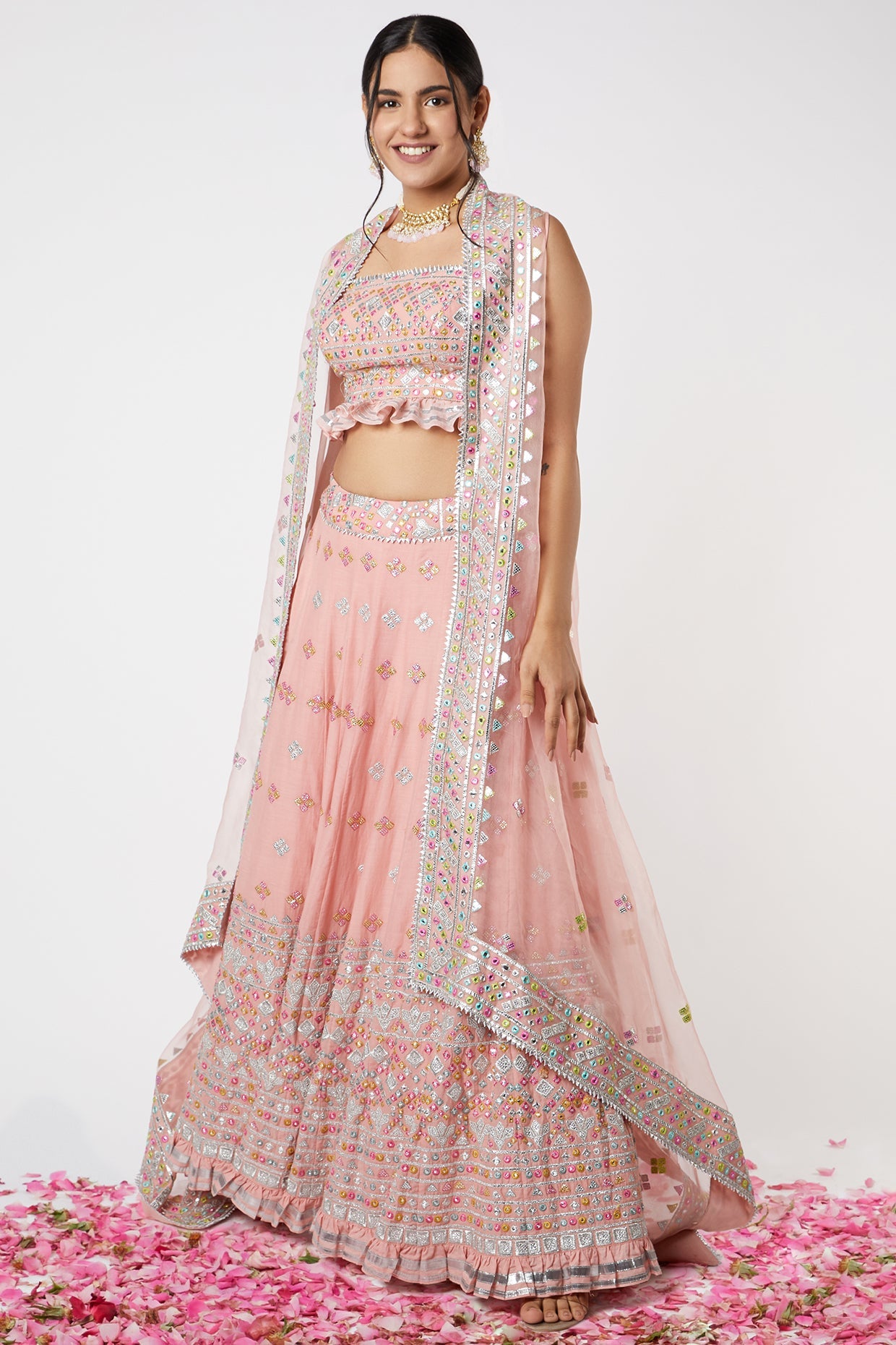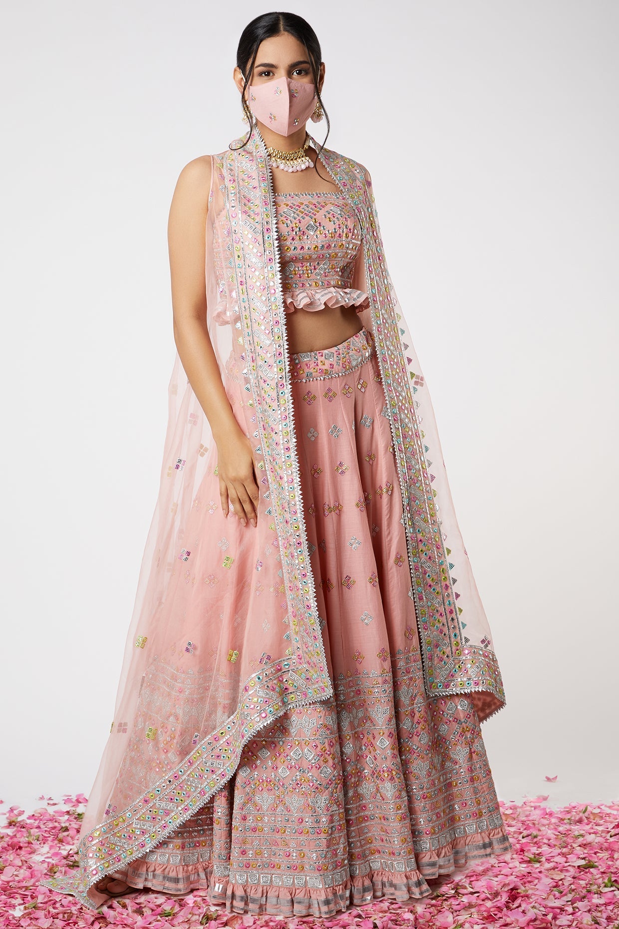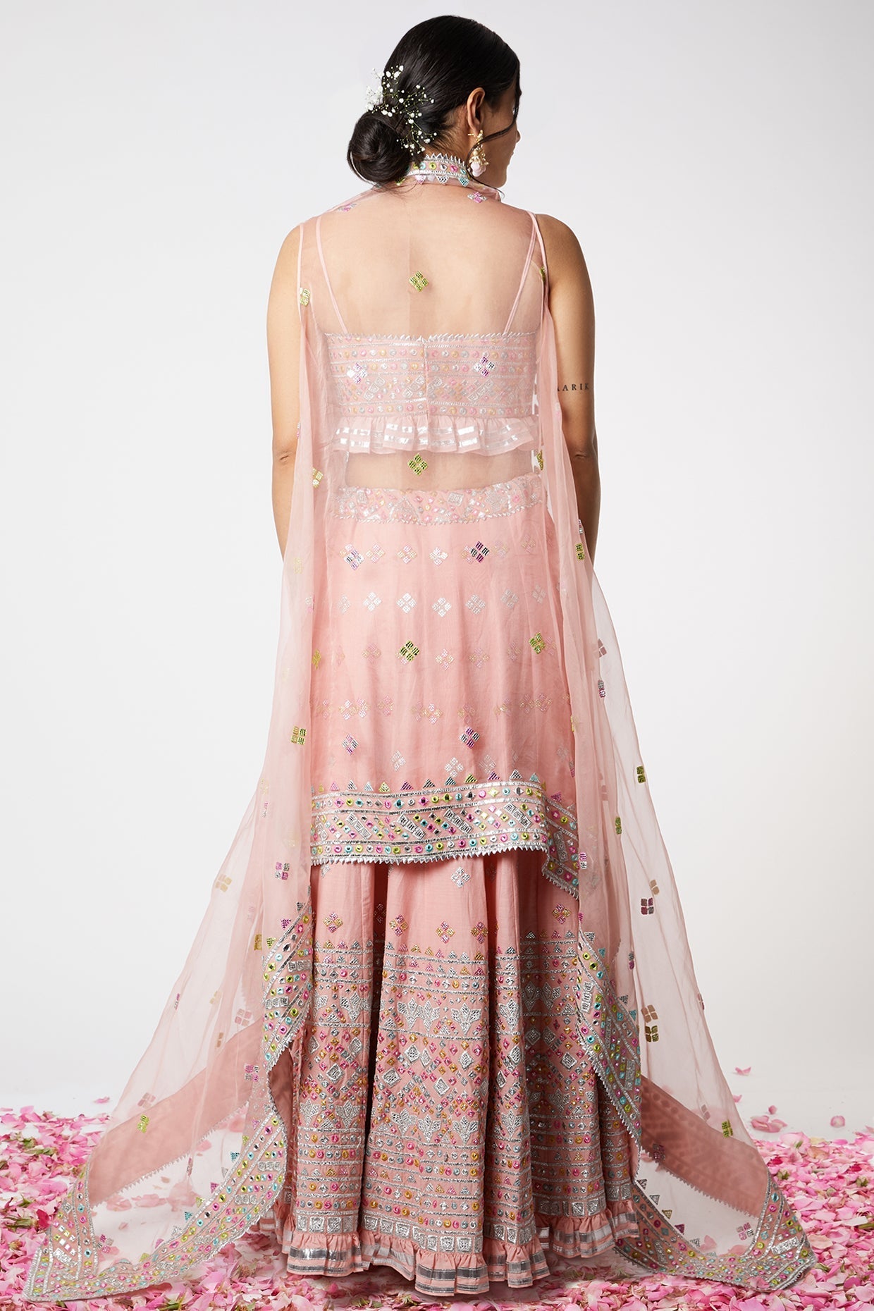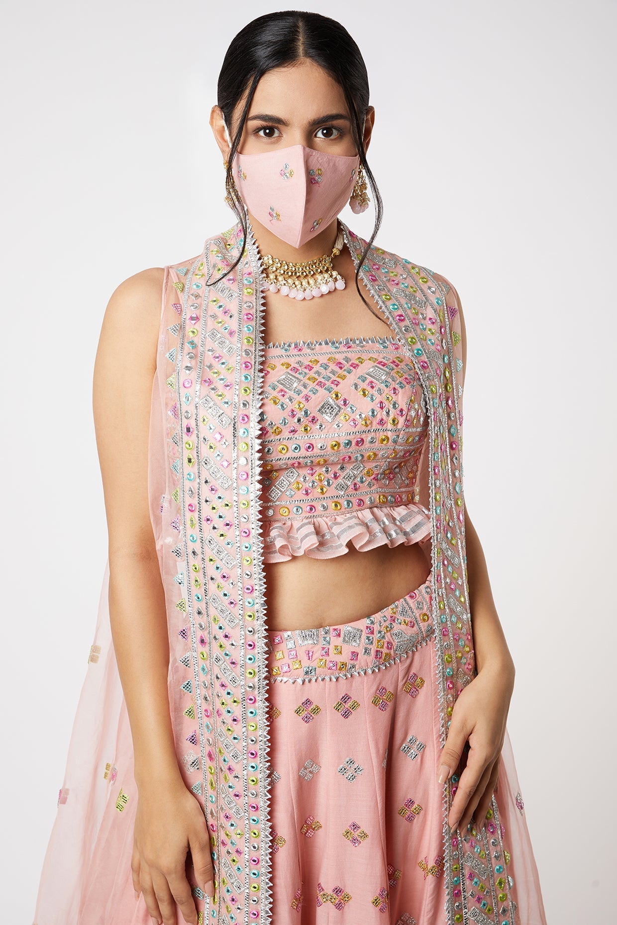 Featuring this gorgeous pink lehenga set In soft cotton, embellished with mirrors and silver appliqué. Paired with a fully embroidered strappy blouse and cape. The embroidery combines silver with pretty turquoise and pink threadwork and coloured tassels that give this a young, happy vibe! Our pick for that special mehendi celebration!