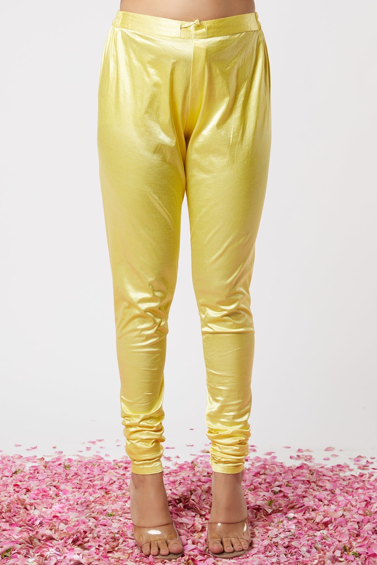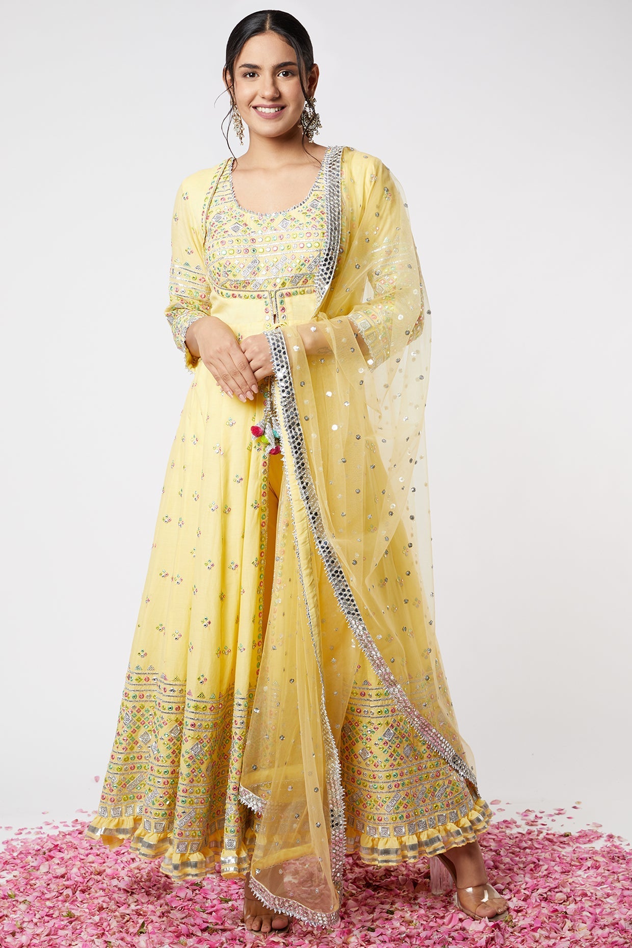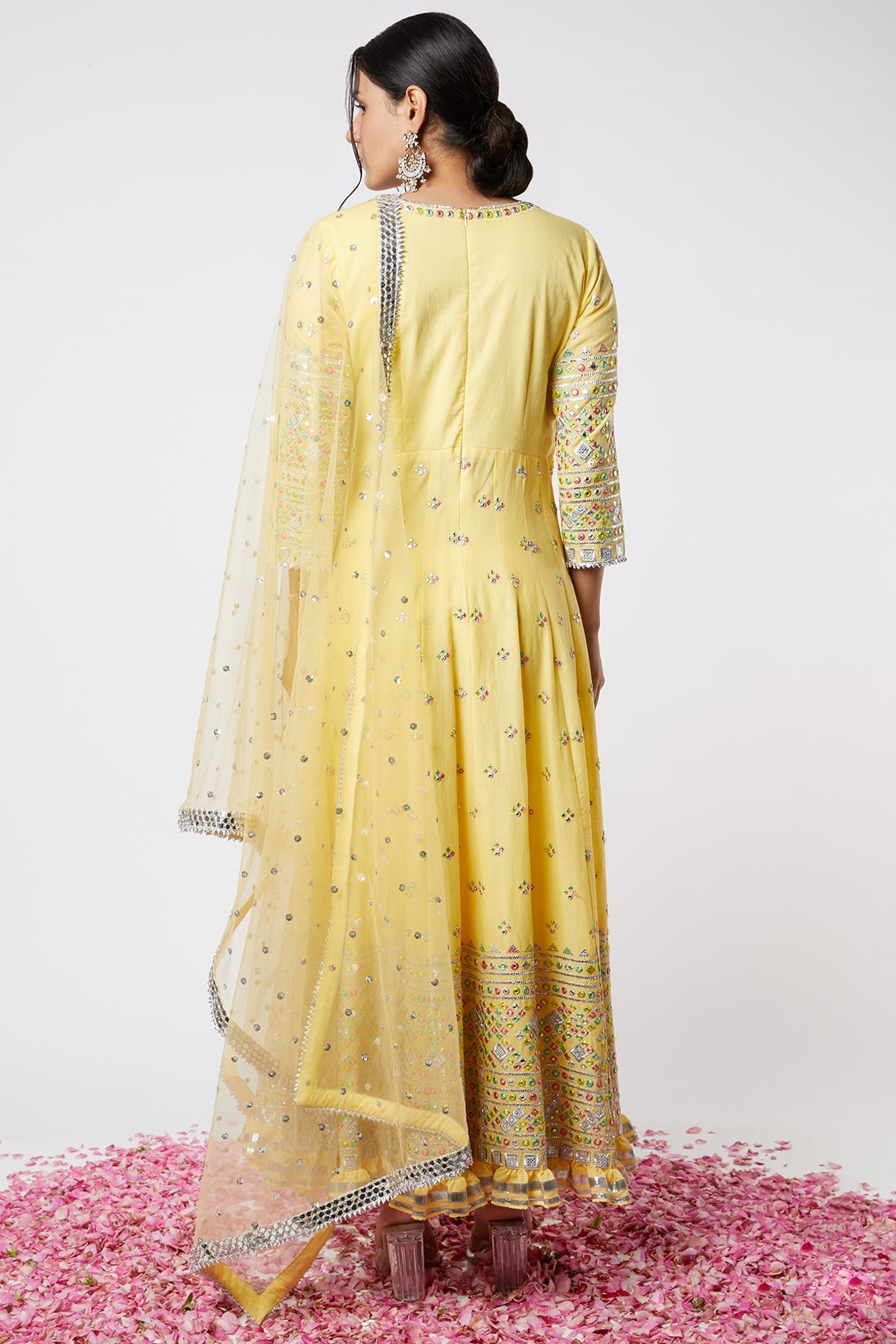 With delicate motifs on soft lime cotton, this long overlapping anarkali is paired with churidar and a beautifully embellished dupatta. The neckline is enhanced with gota, mirror and thread embroidery. The kalis down the waistline gives a flow to the ensemble making it fun to wear on any occasions.