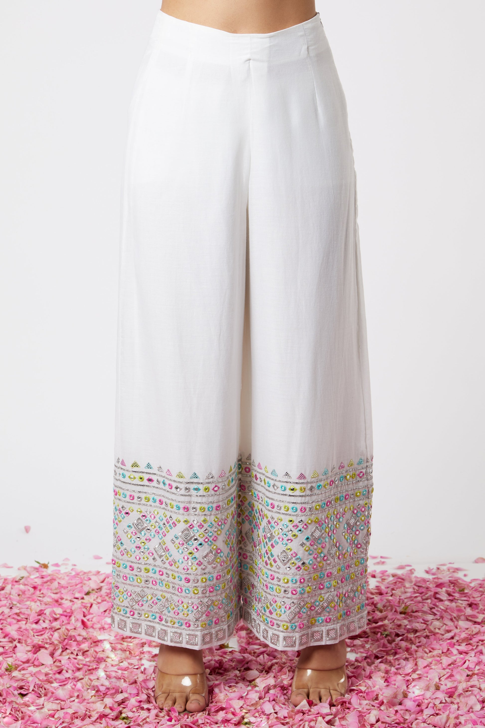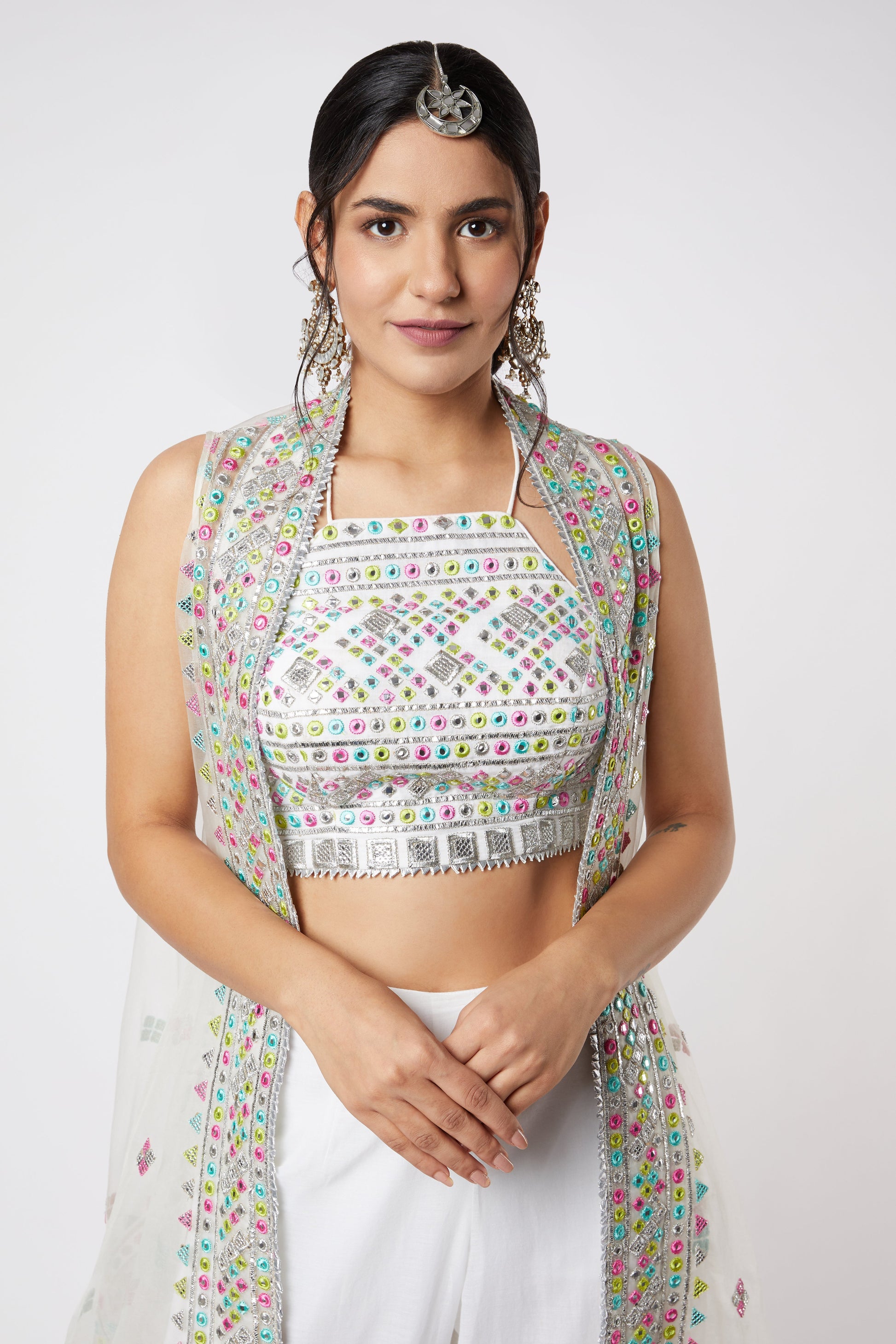 In vibrant colours, this short, cotton silk, bustier is smartly embellished with mirror, applique and colorful threadwork. Paired with matching pants and cape, it has a young, happy vibe!