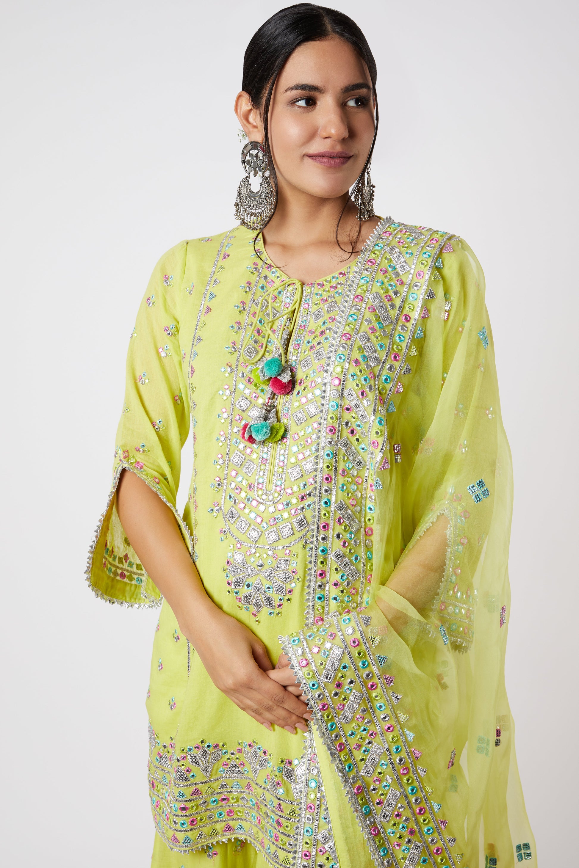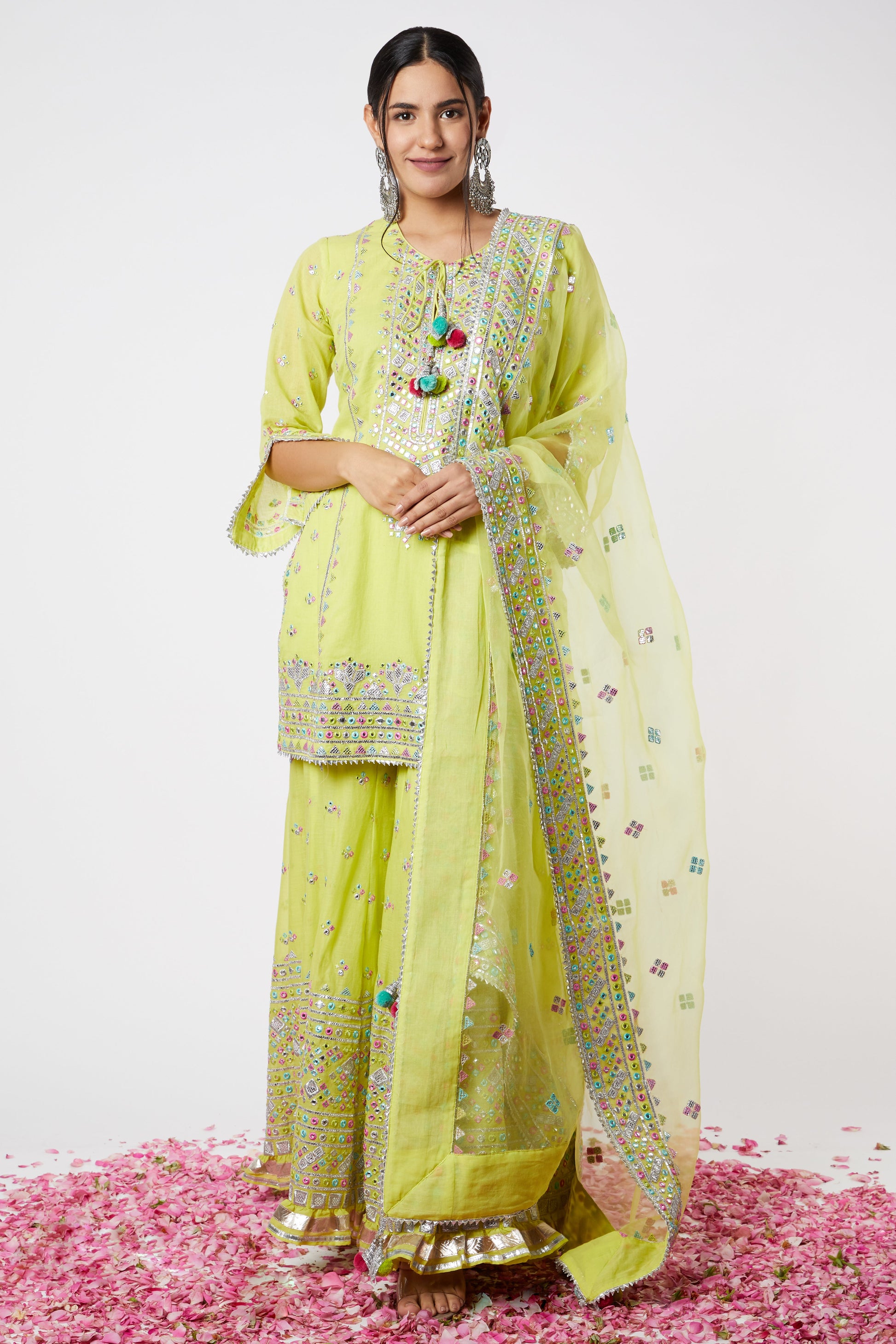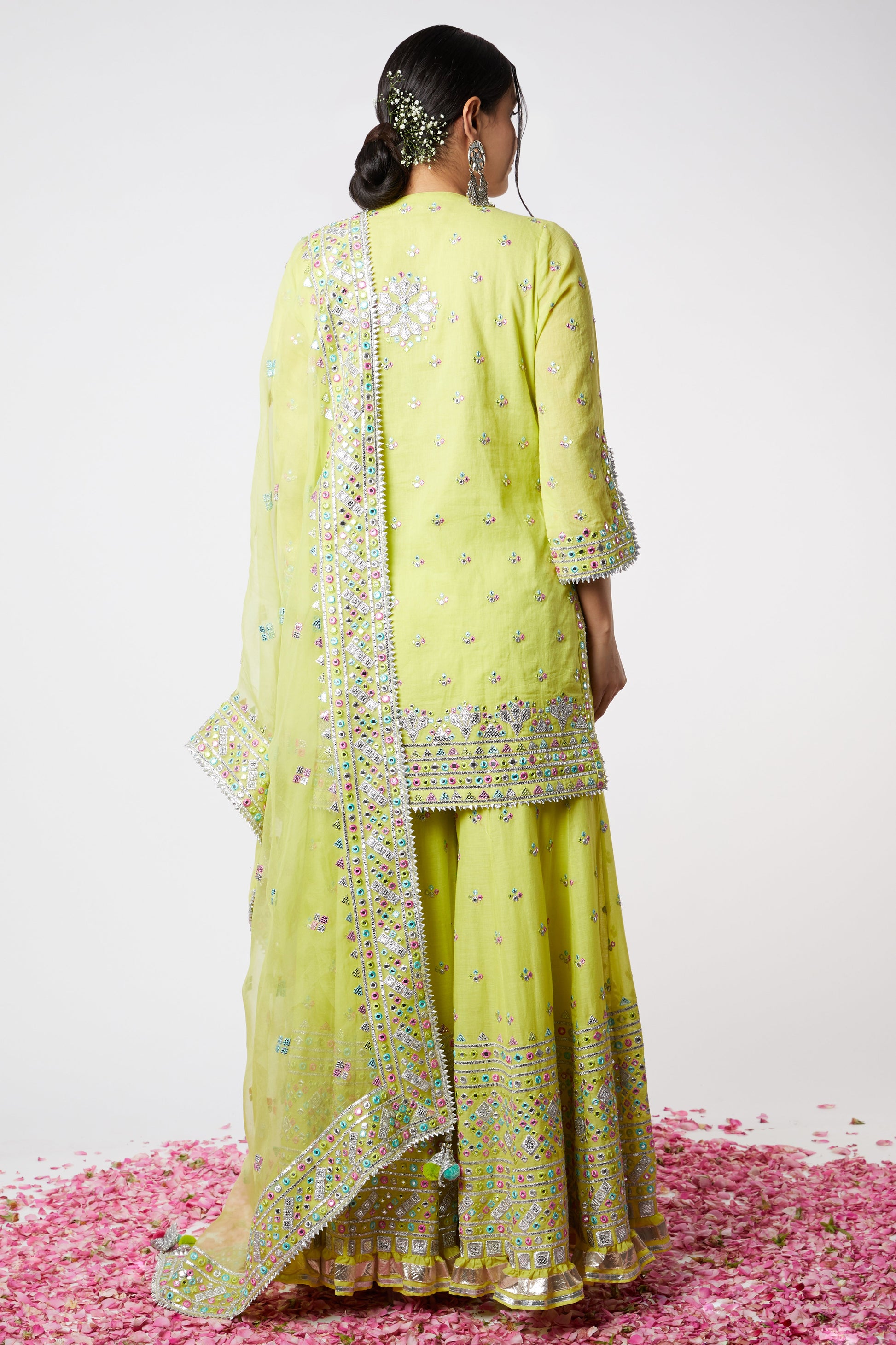 This tonal, short sharara set has a close, delicate gota motifs on cotton silk with zardosi and gota handwork to highlight the neckline. Paired with a fully embroidered sharara and a beautiful net dupatta, it exudes elegance and grace!