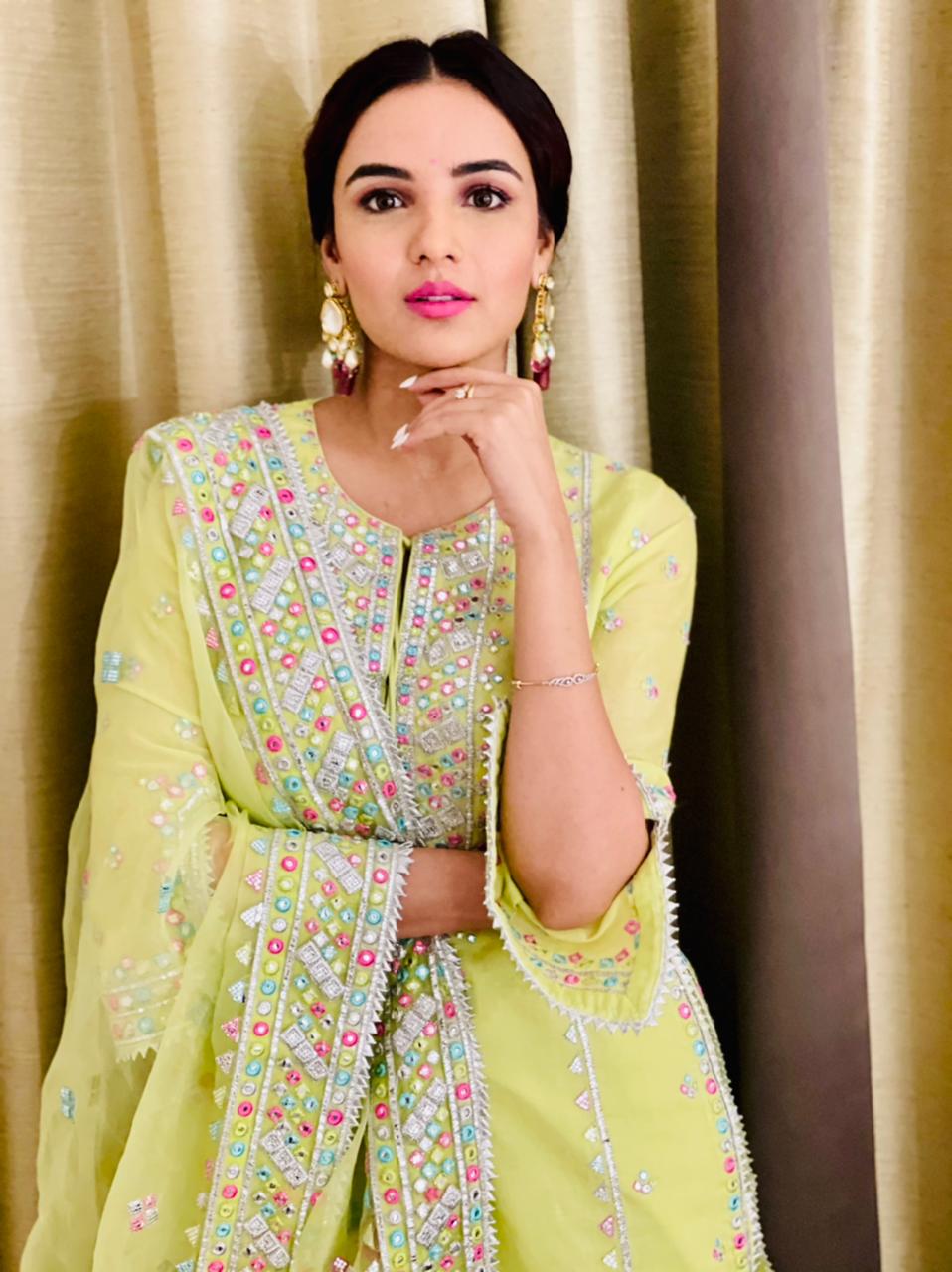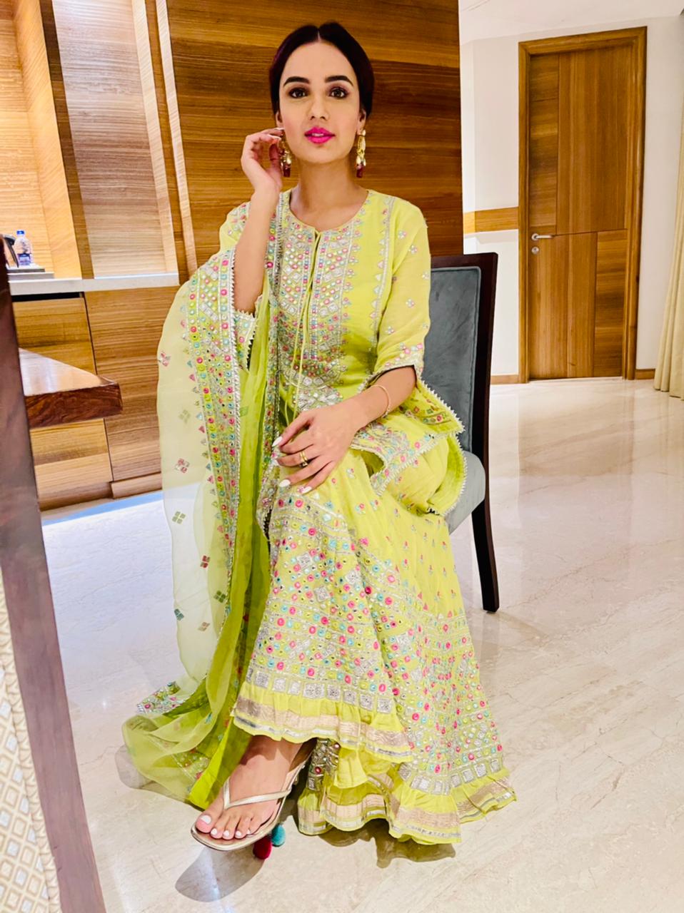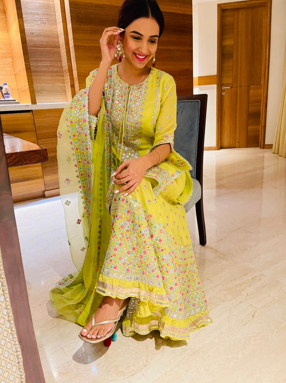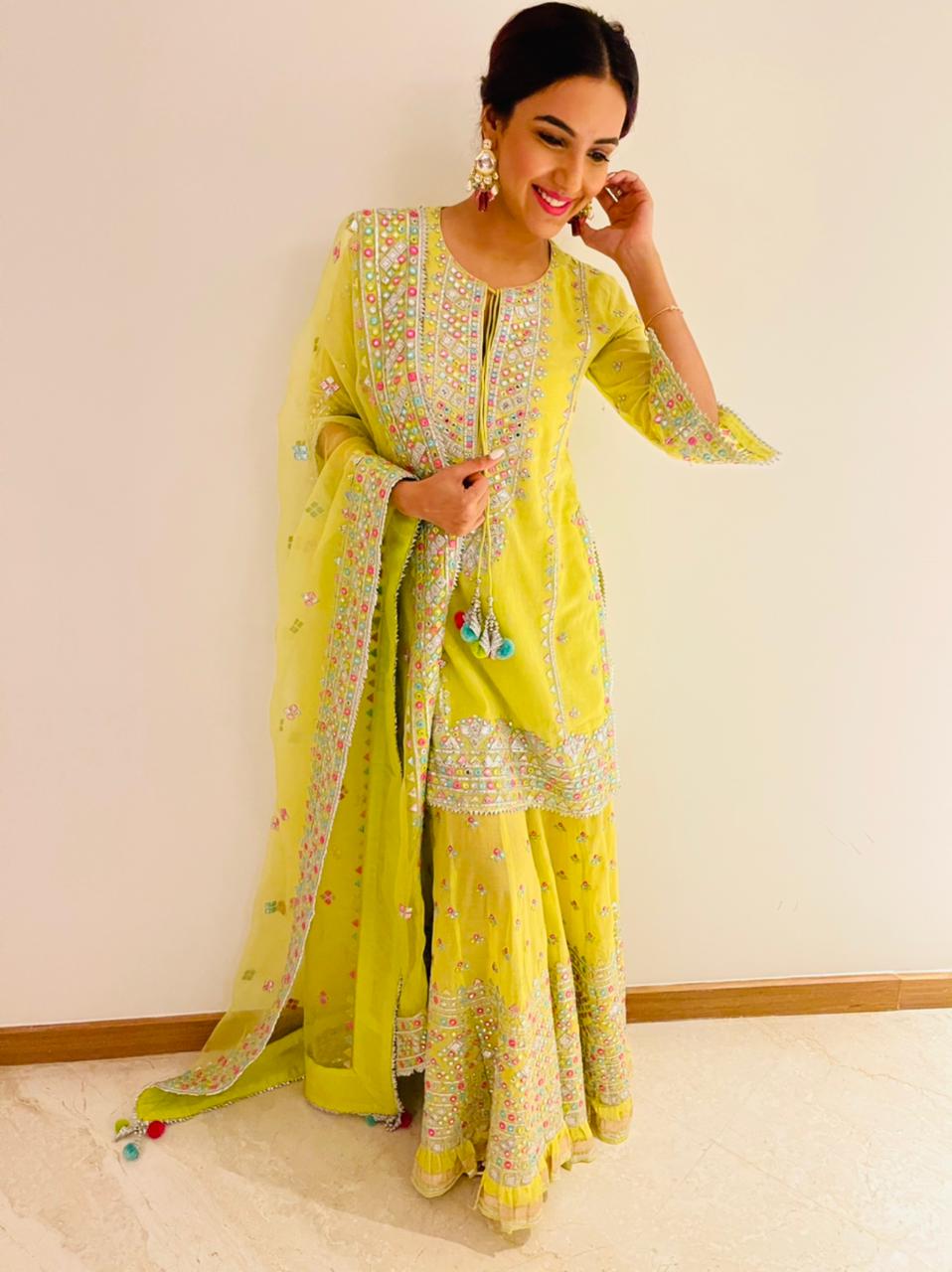 This tonal, short sharara set has a close, delicate gota motifs on cotton silk with zardosi and gota handwork to highlight the neckline. Paired with a fully embroidered sharara and a beautiful net dupatta, it exudes elegance and grace!