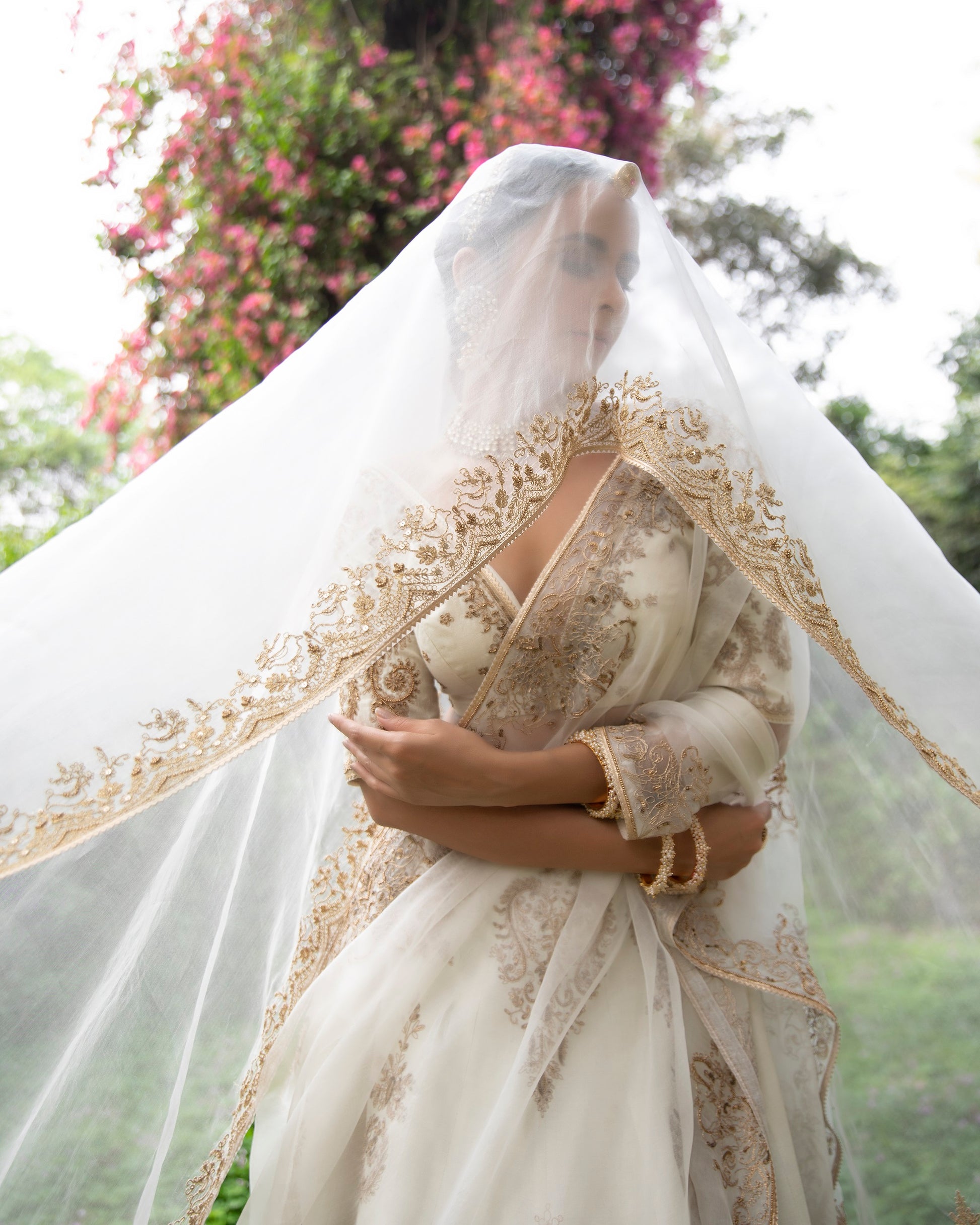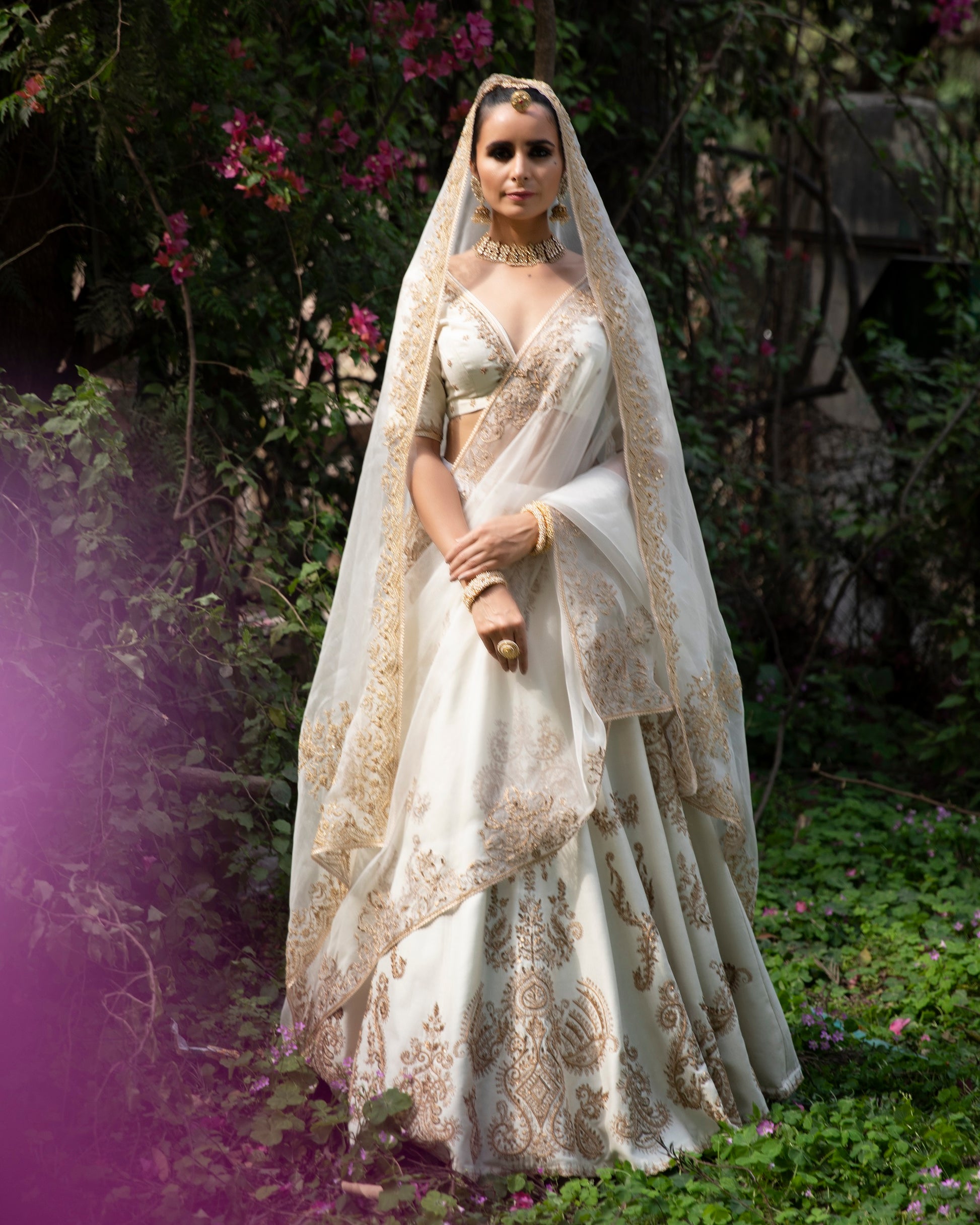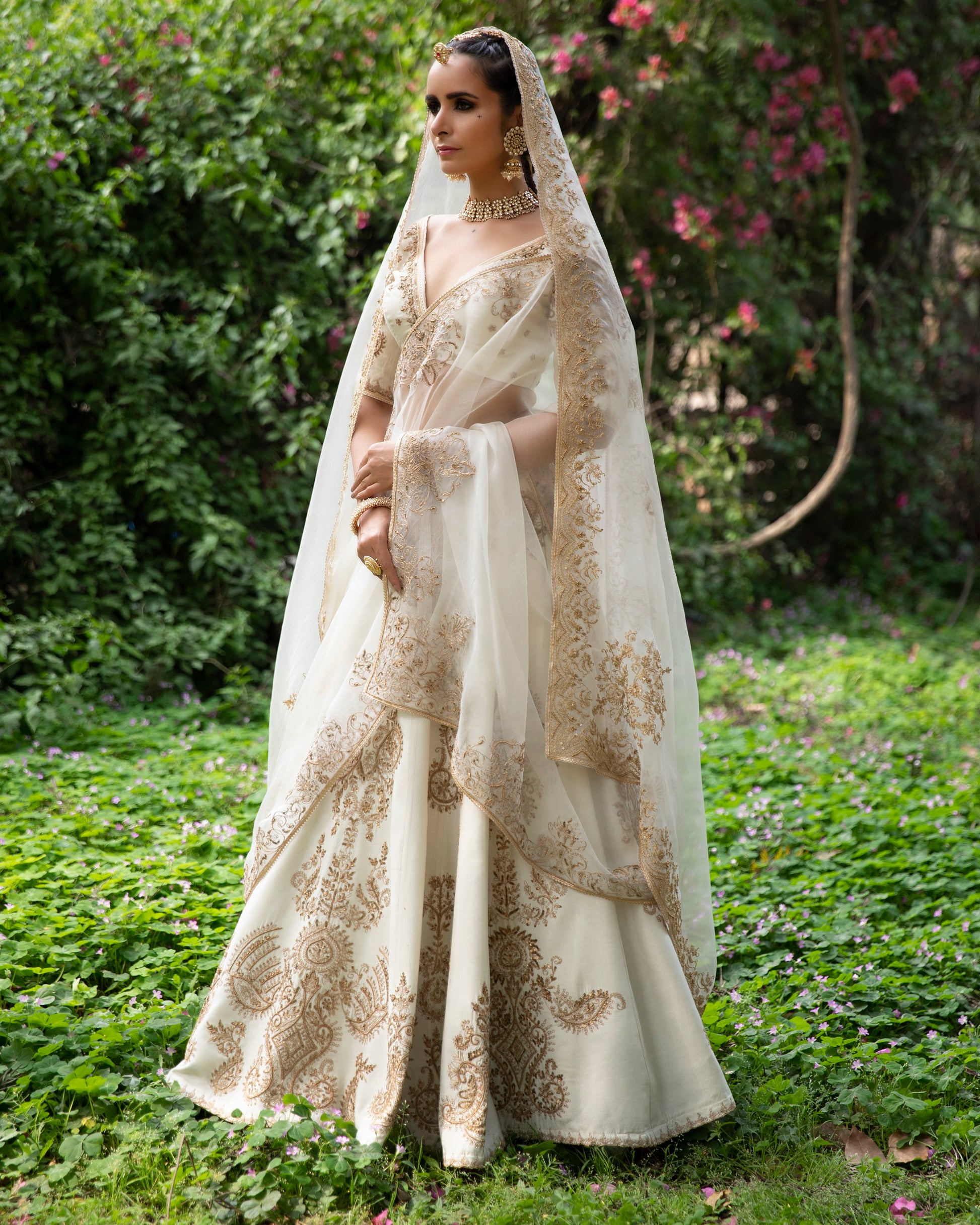 Featuring an off-white lehenga in chanderi base with dori and sequins embroidery. It is paired with matching blouse and two organza base dupatta.
