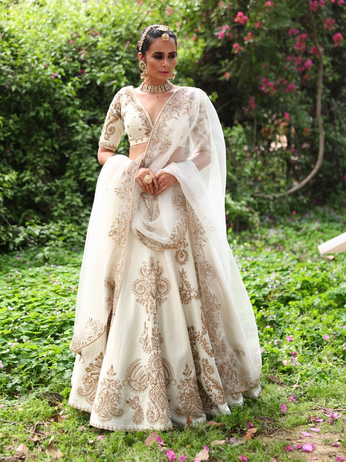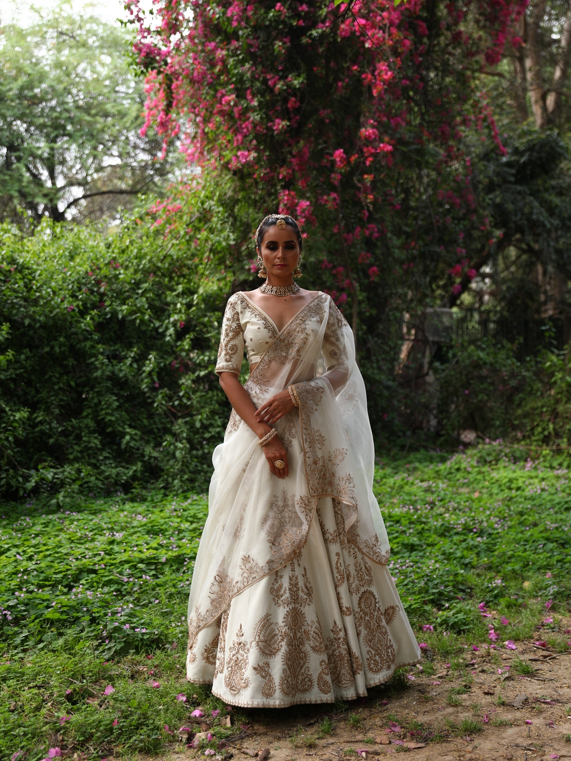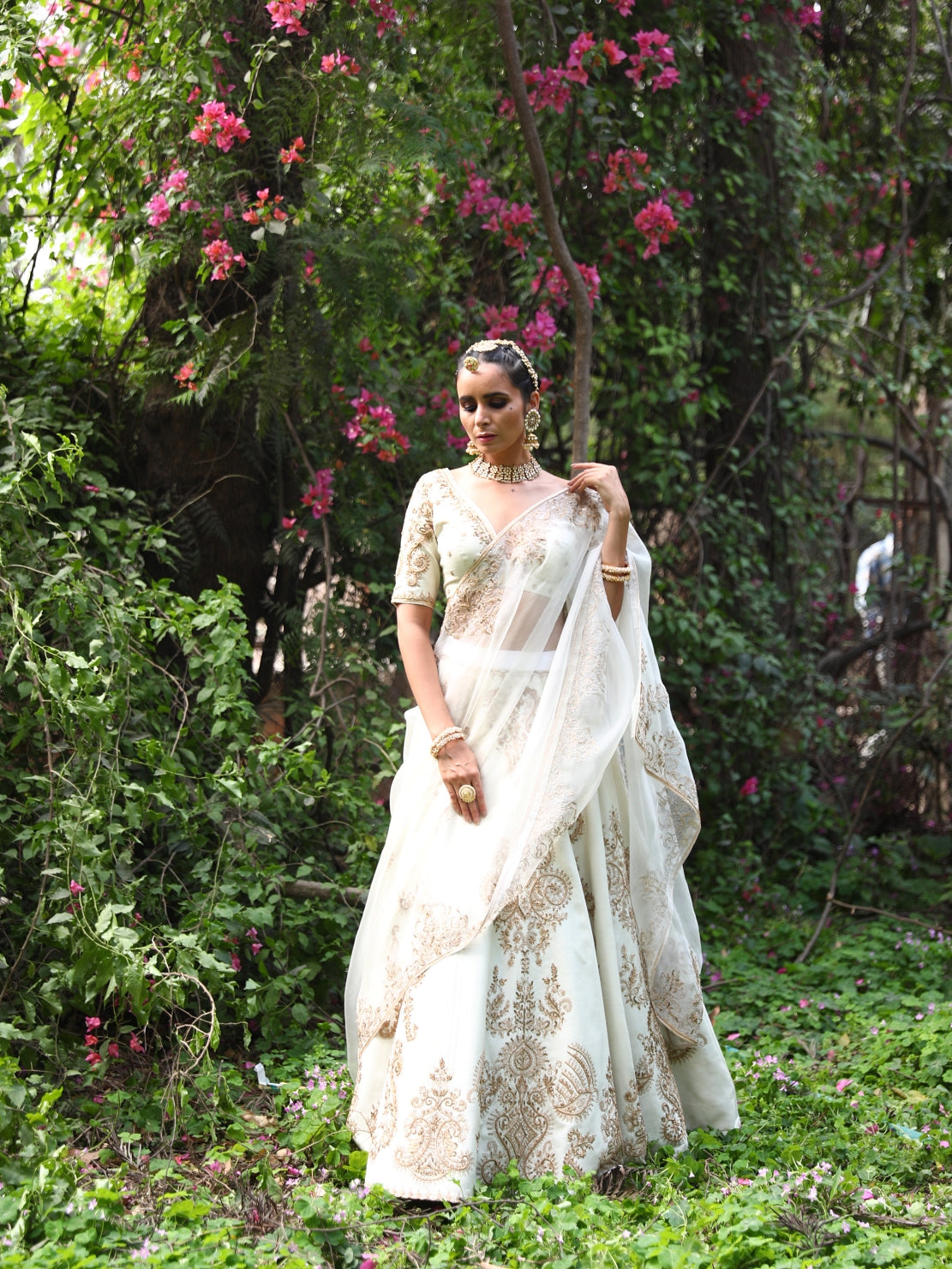 Featuring an off-white lehenga in chanderi base with dori and sequins embroidery. It is paired with matching blouse and organza base dupatta.