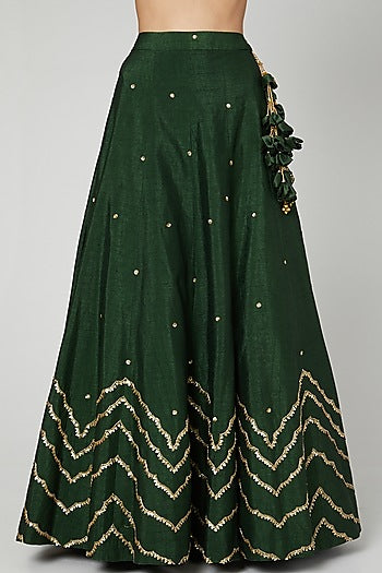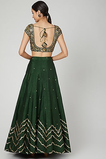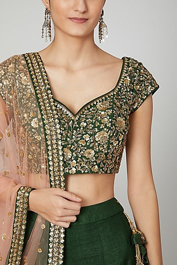 Featuring an olive green skirt in dupion silk based with dabka sequins and swarovski .it is paired with matching embroidery blouse and a peach embroidery net dupatta.