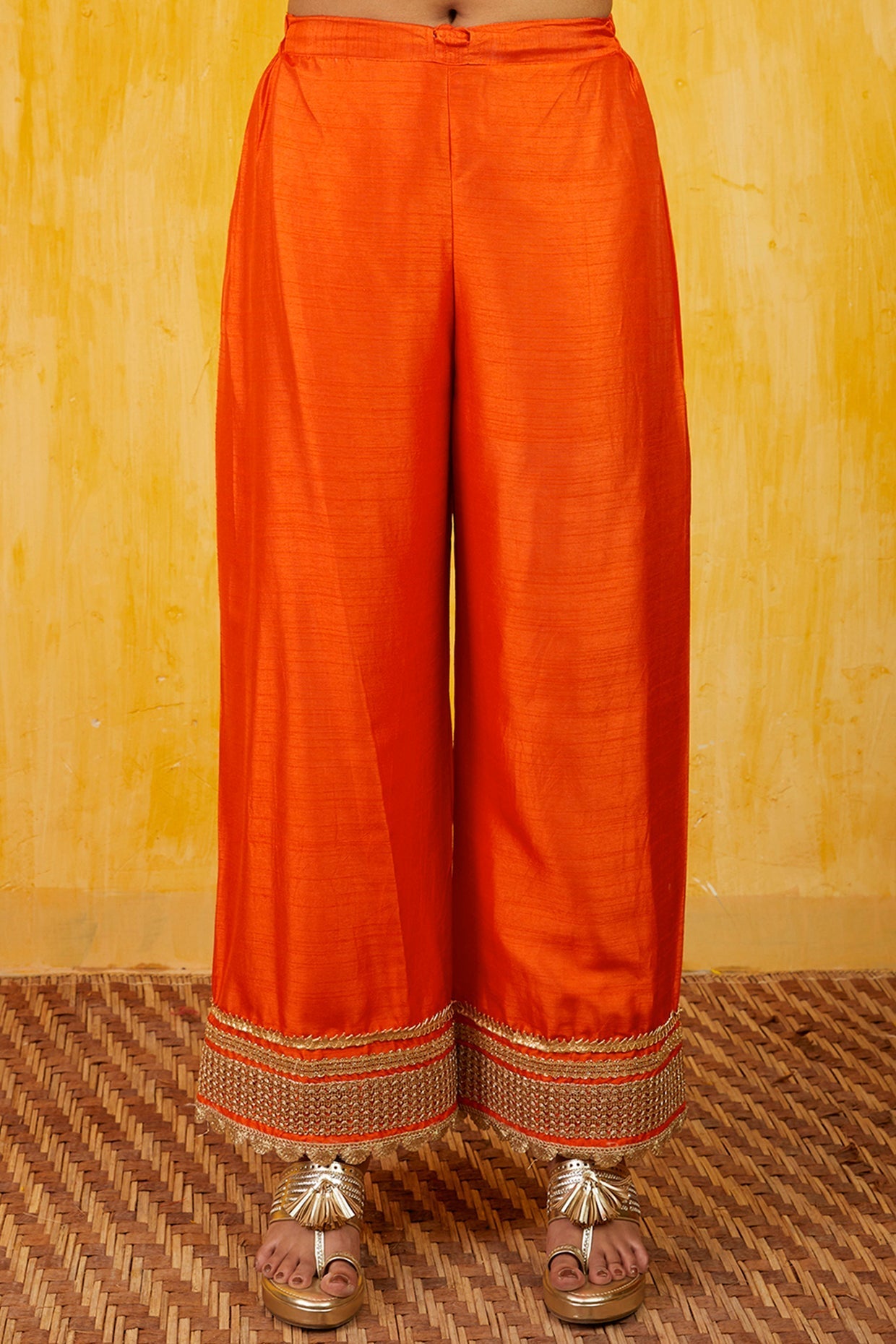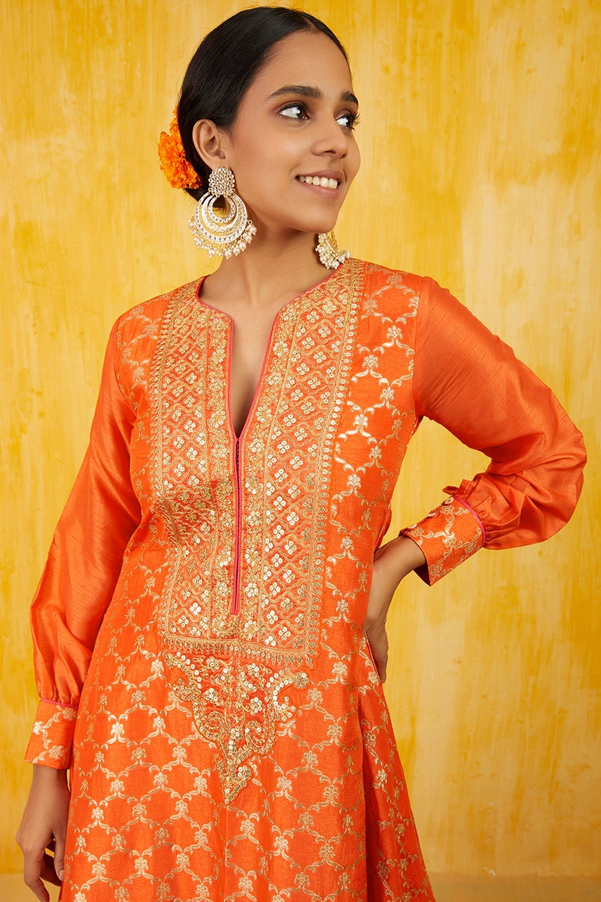 Featuring an kaftan tunic in tussar silk and hand woven silk brocade base with marodi embroidery. It is paired with matching palazzo pants.