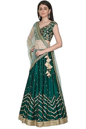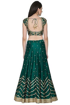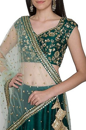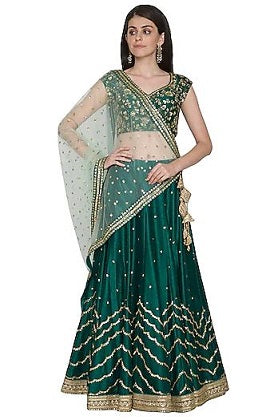 Featuring a peacock green lehenga skirt in raw silk base with dabka, sequins and swarovski embroidery. It is paired with a matching blouse and dupatta in net base.