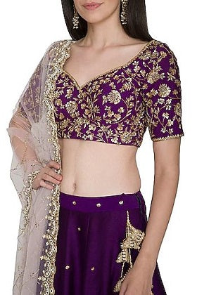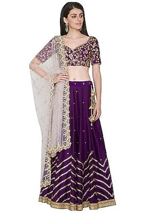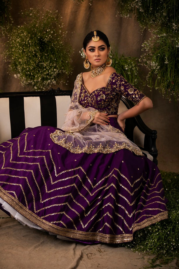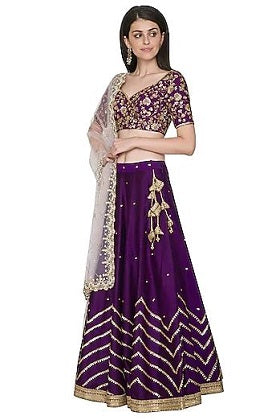 Featuring a purple lehenga skirt in dupion silk base with dabka, sequins and swarovski embroidery. It is paired with a matching blouse and dupatta in net base.