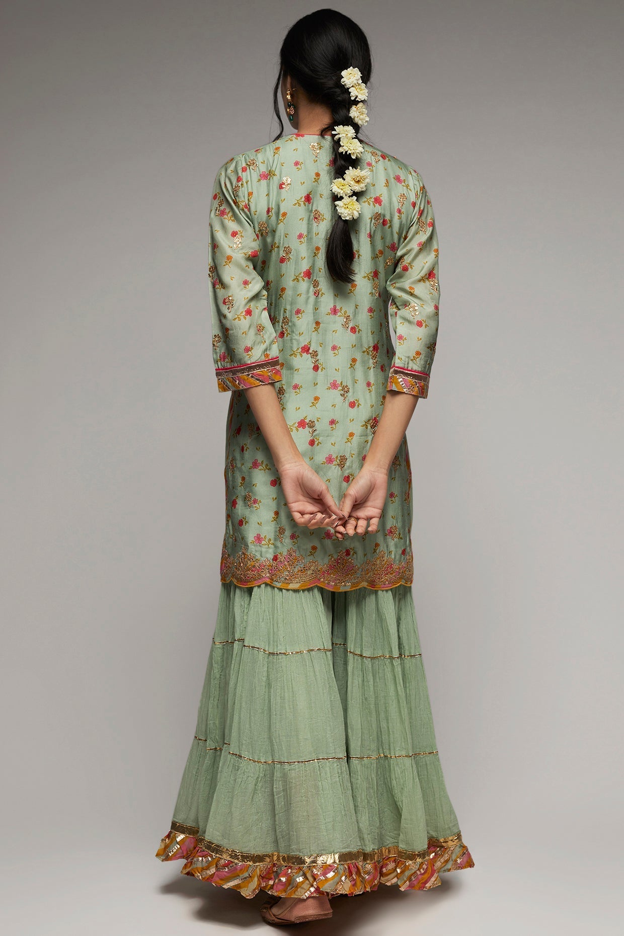 This Stunning Short sharara set In A Sophisticated Toned Down Hue, Is Embellished in Gota That Adds Shimmer All Along . More delicate gota, dori and sequins as all over buttis and borders end in pretty scallops ,This Fully Embroidered Full Seleves with sharara and Dupatta With Trim, Add Shimmer And A Richness To This Pretty Ensemble