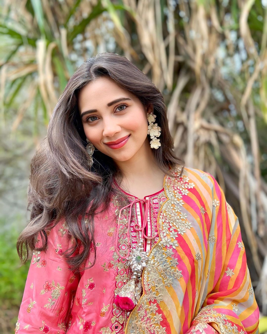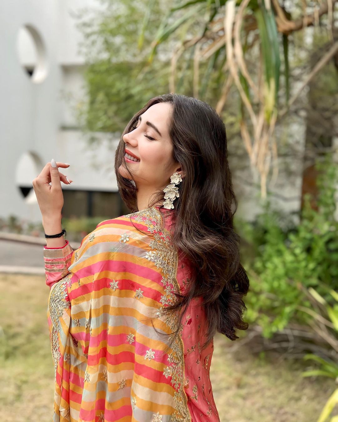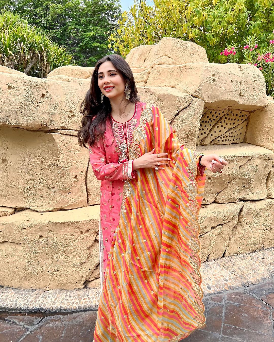 Rashida Long Sleeved Tunic Paired with a embroidered Cutwork palazzo and dupatta , combines floral bud and leaf buttis with lehriya in a mix of colour in stronger tones, More delicate gota, dori and sequins as all over buttis and borders end in pretty scallops fun tassels bring maasti to the collection which is perfect for mehendis, pujas and festivities.