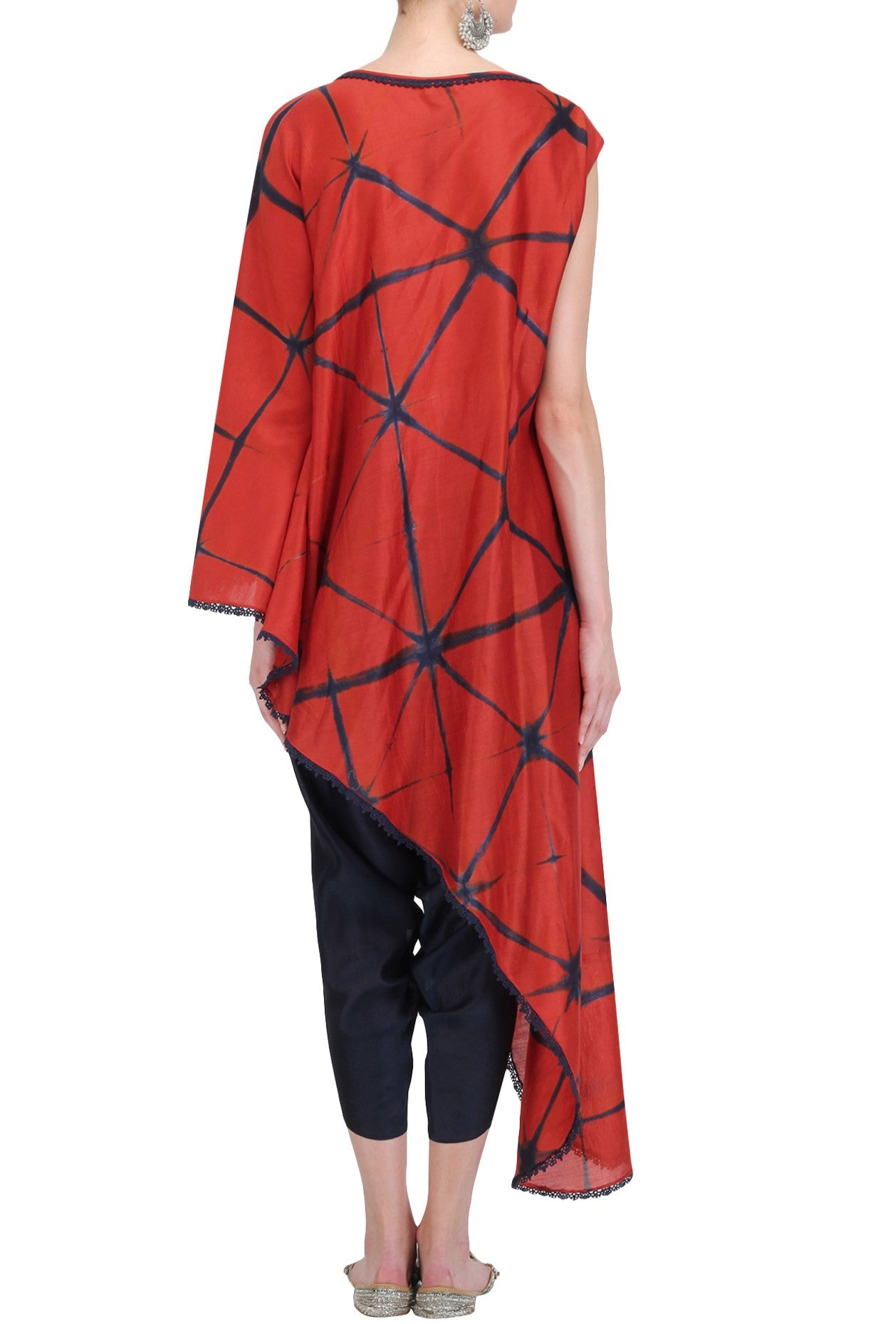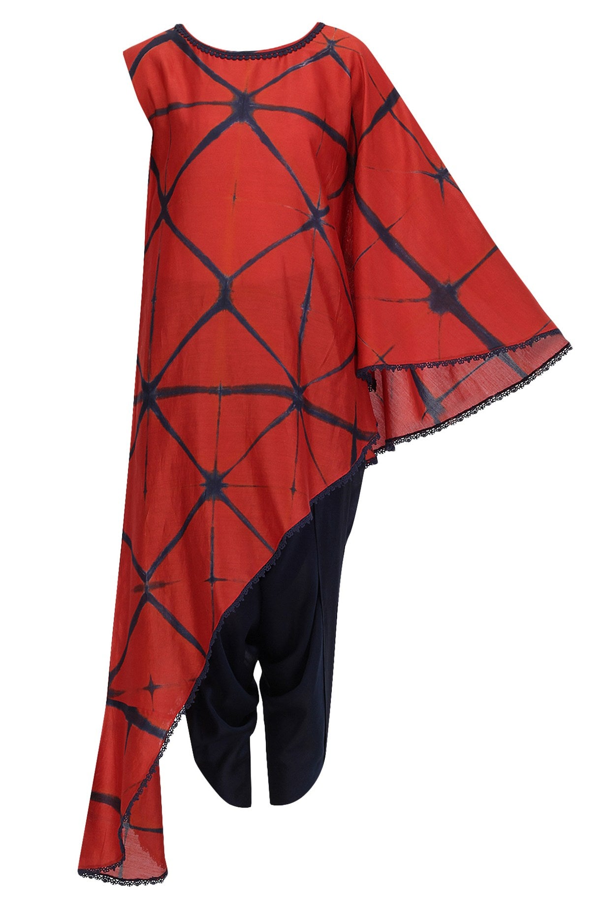 Red & blue shibori shirt comes with blue dhoti.