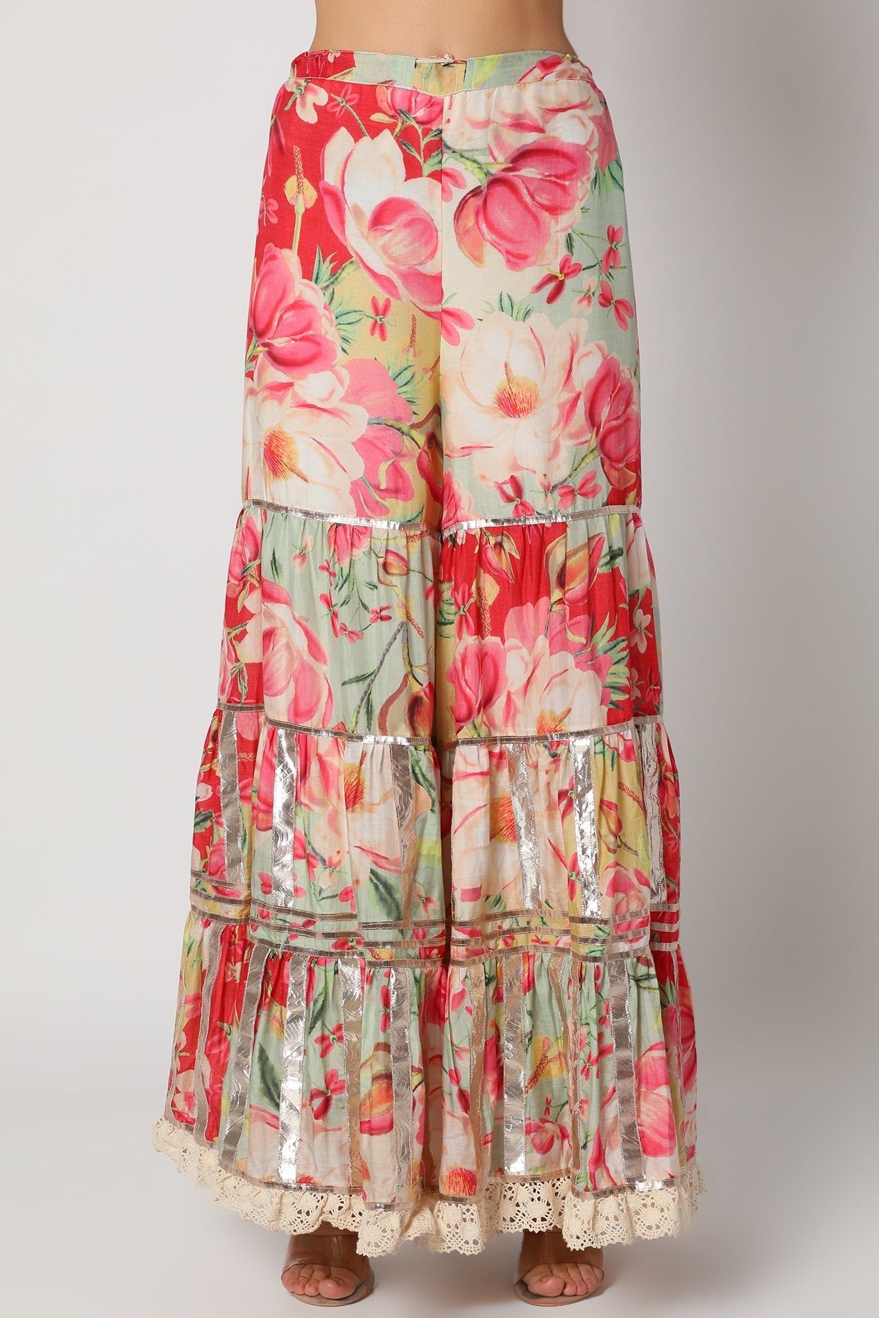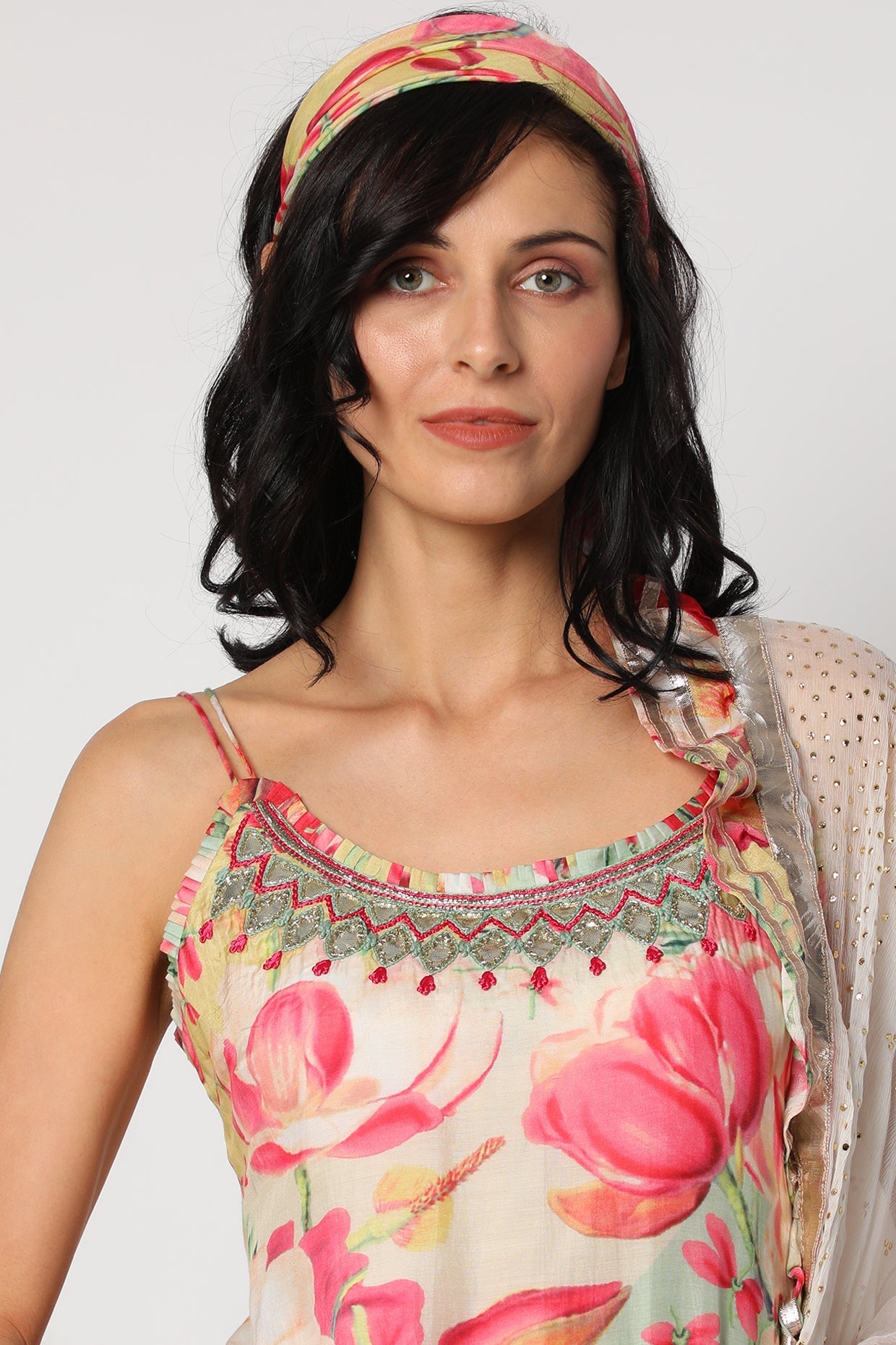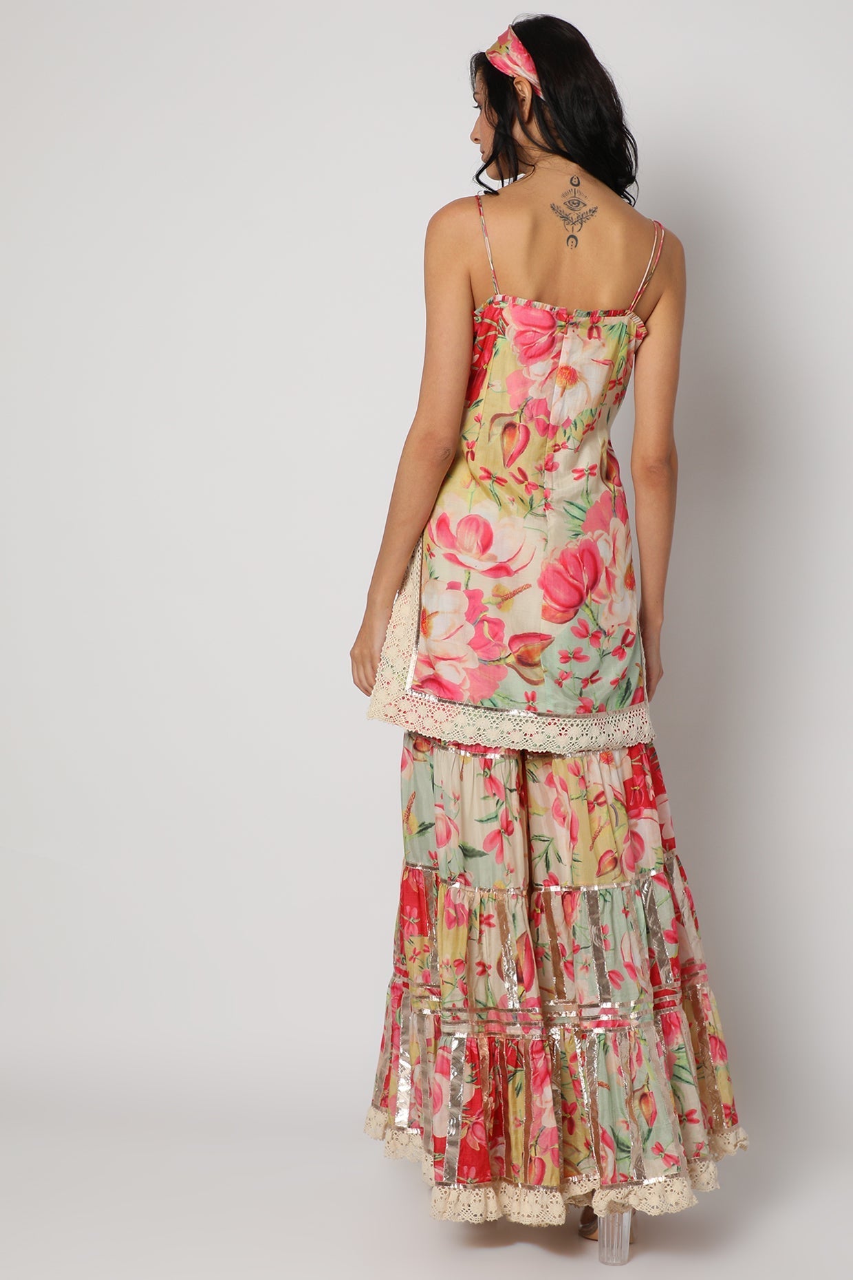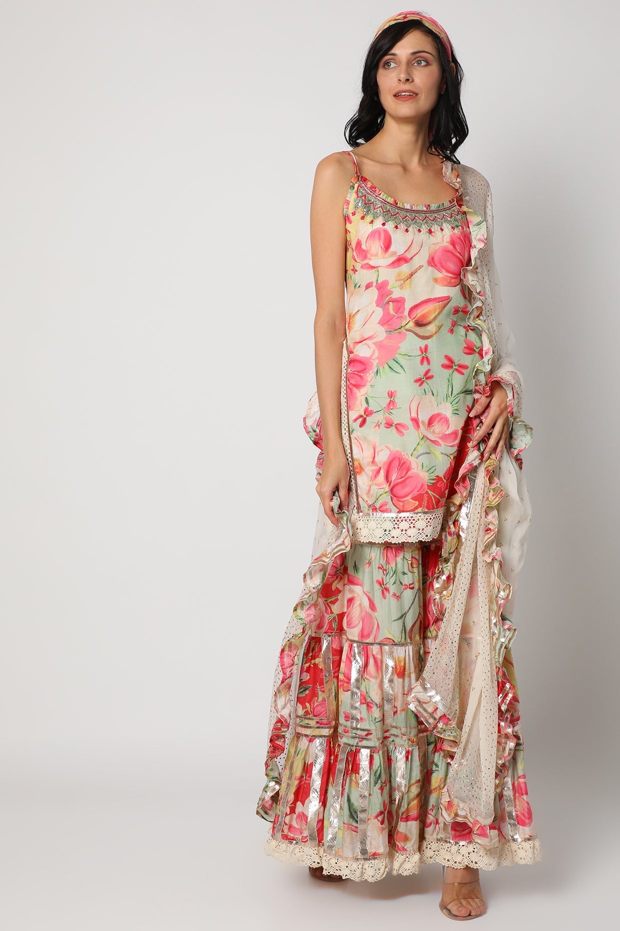 A short length floral printed, strappy kurta on cotton silk with gota highlights and lace trim, is paired with same printed sharara and Badla dupatta giving it a fresh and younger look.