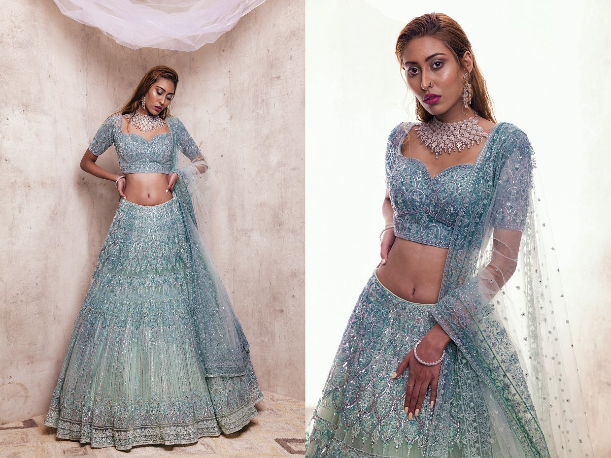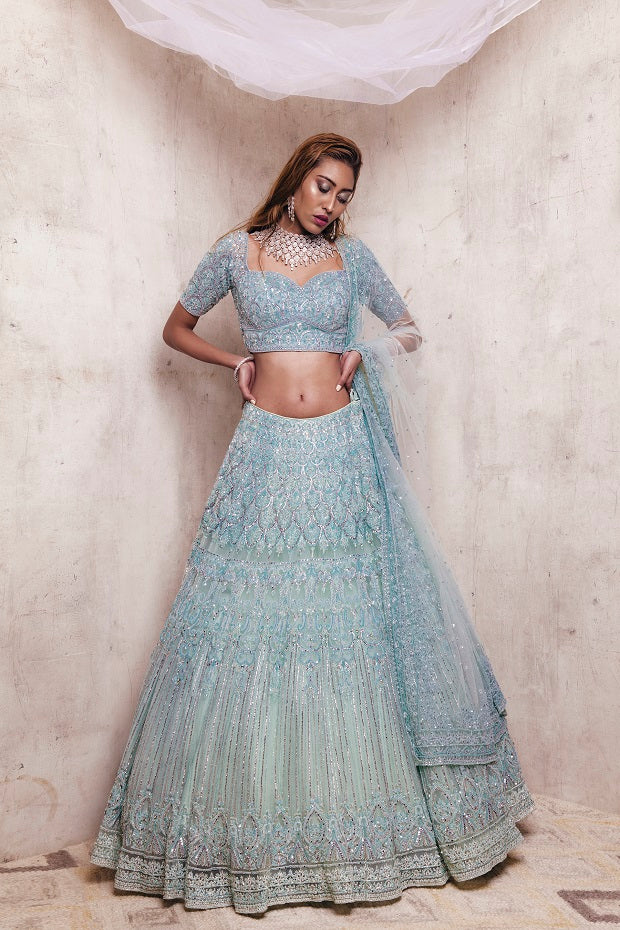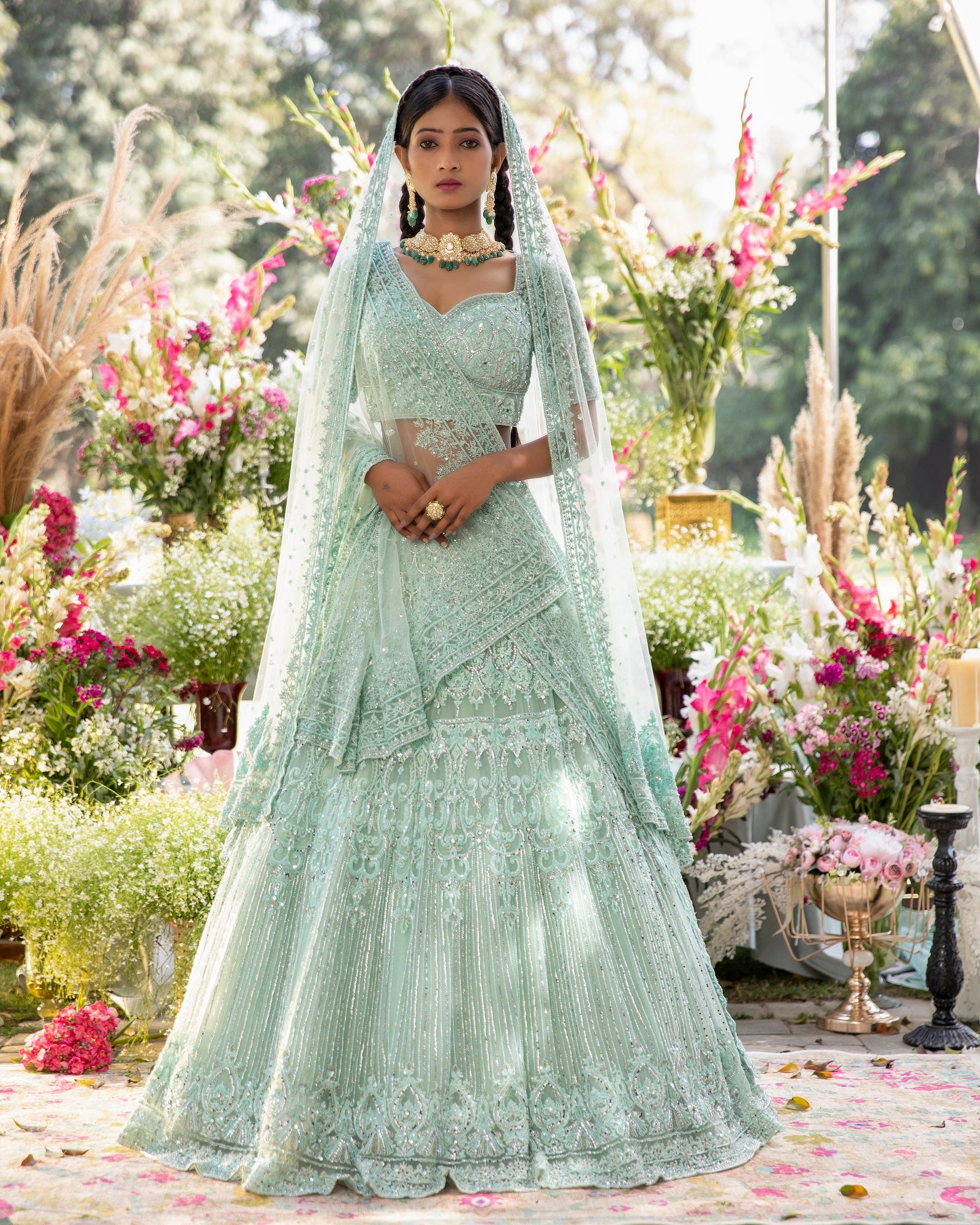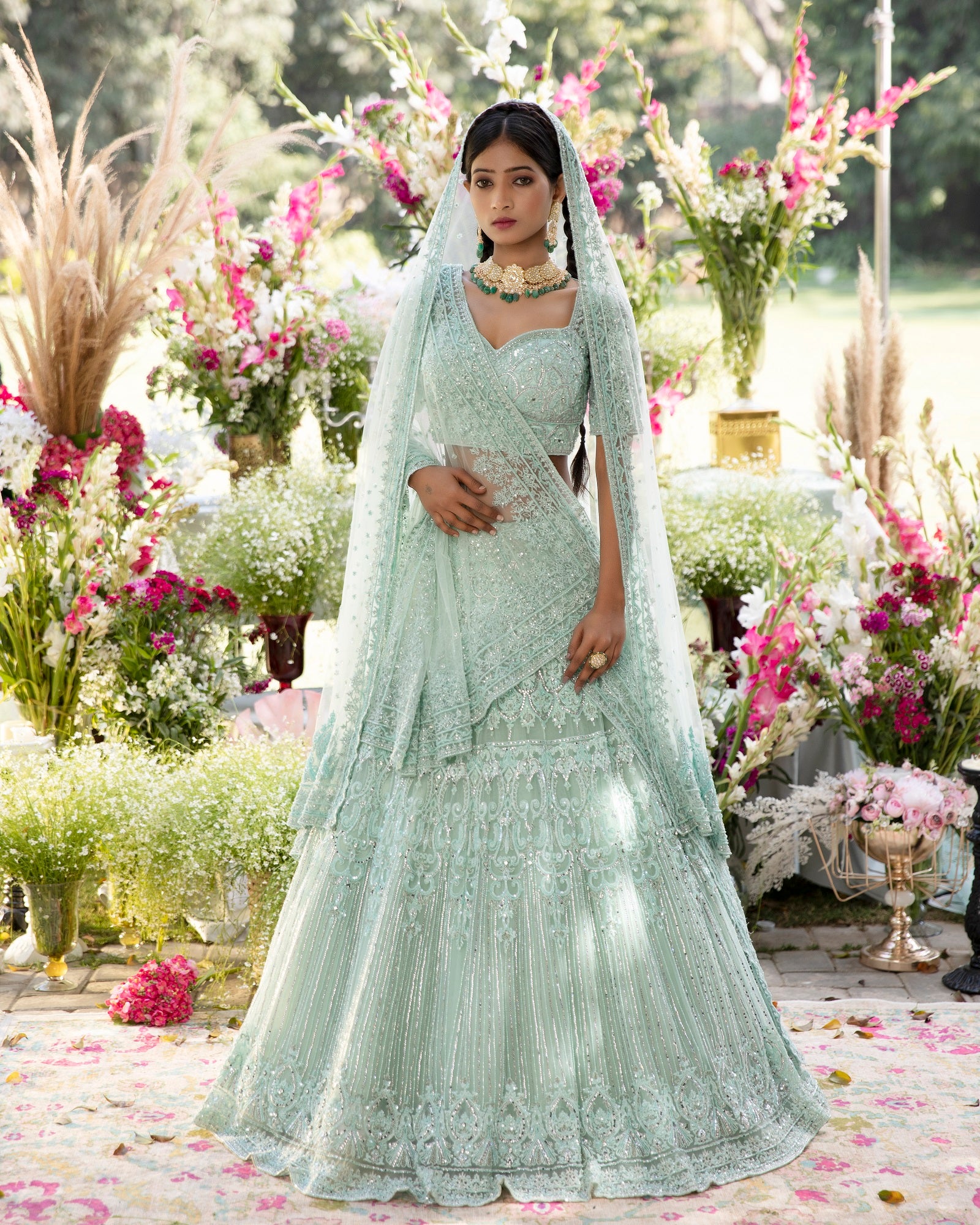 Featuring a sea green blouse in net base with aari/threadwork and zardosi embroidery. It is paired with a matching lehenga and with a matching net dupatta and a sea green dupatta.
