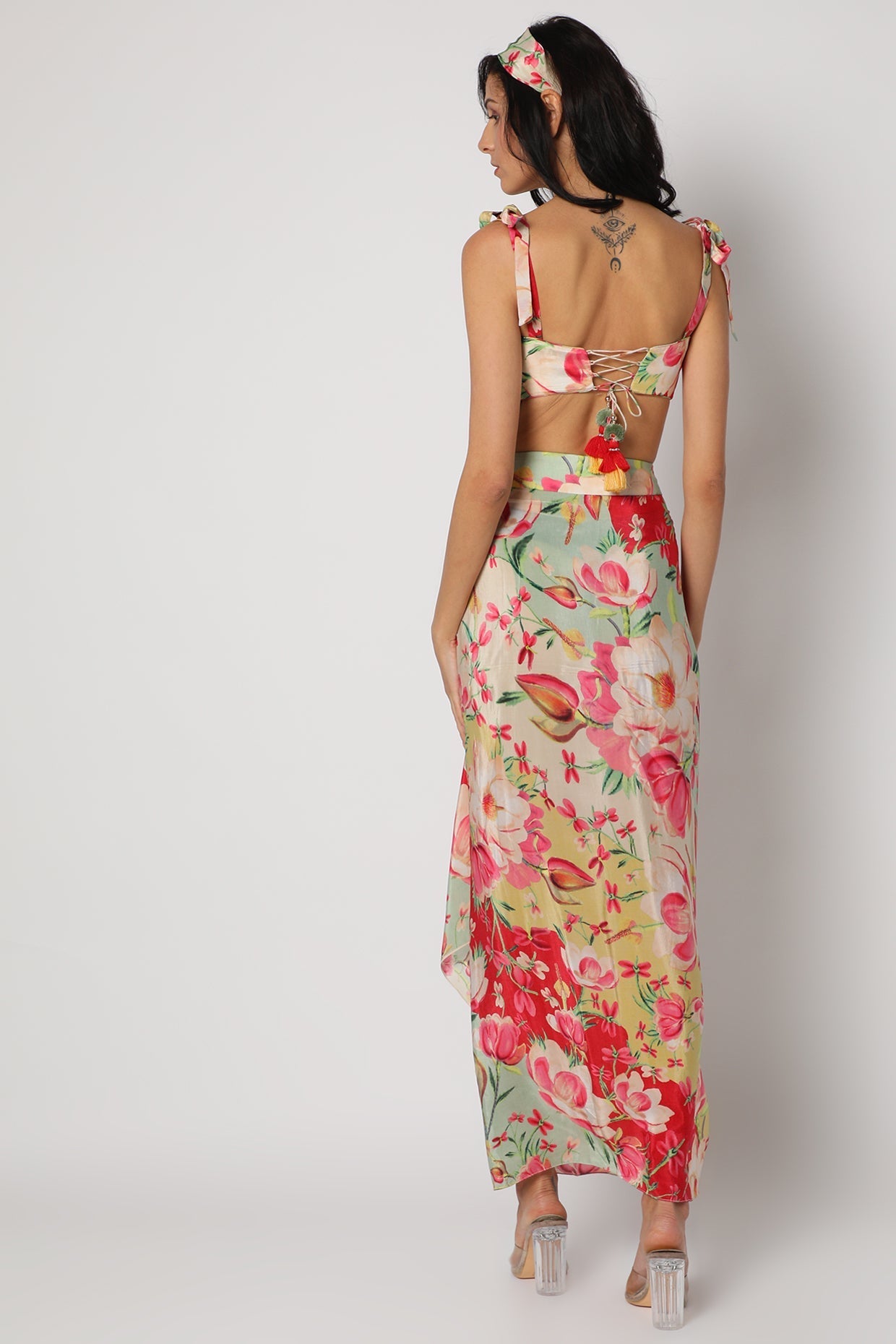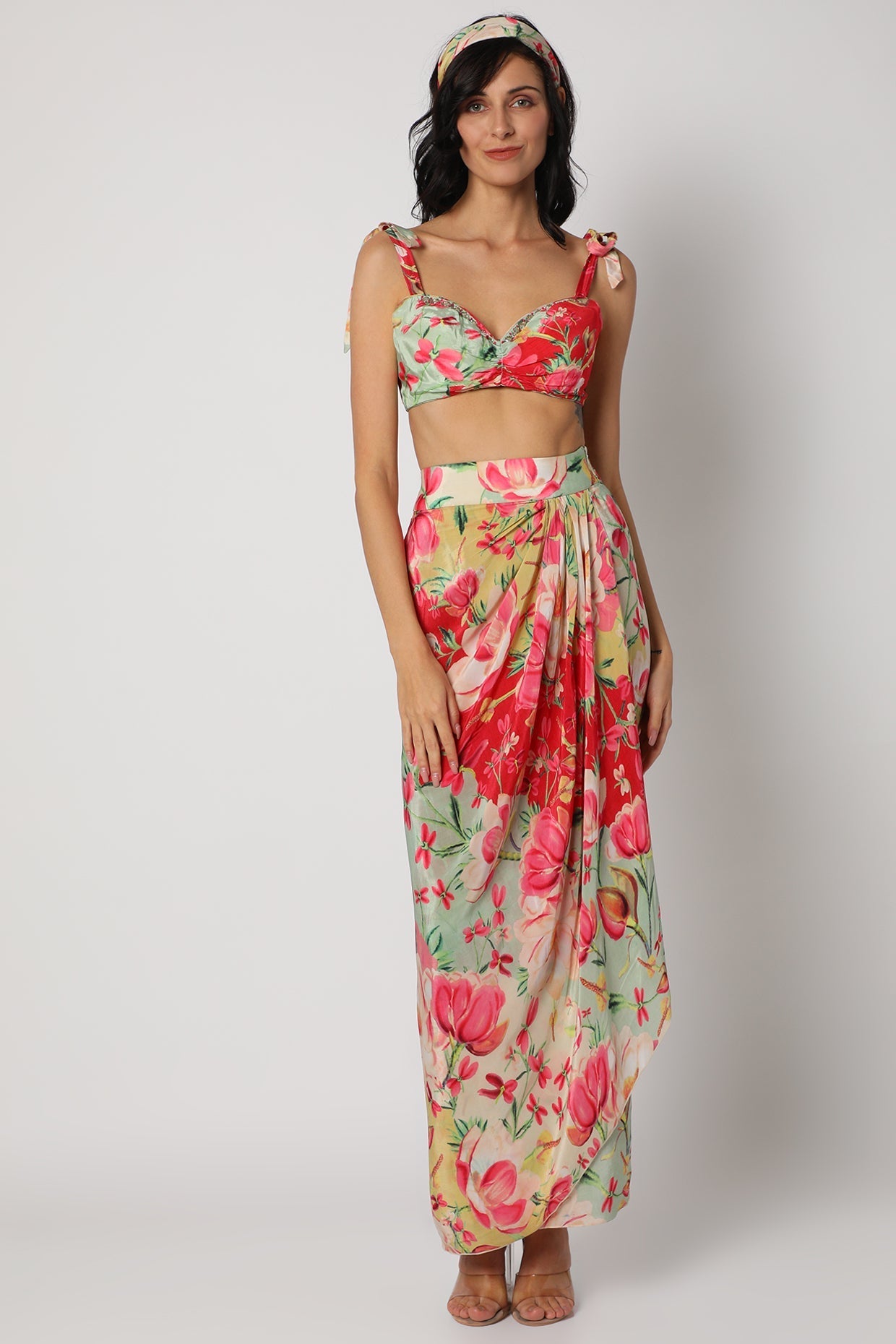 In vibrant colours, this short, cotton silk, bustier is smartly embellished with gota and thread. Paired with matching drape skirrt, it has a young, happy vibe!