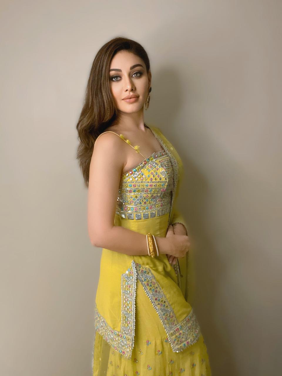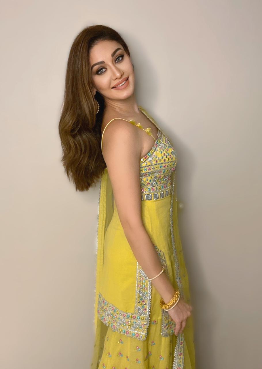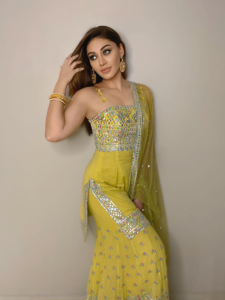 This gorgeous lime sharara on cotton silk is paired with an embroidered strappy kurta and net dupatta. The embroidery combines silver with pretty turquoise and pink threadwork and colored tassels that give this a young, happy vibe!