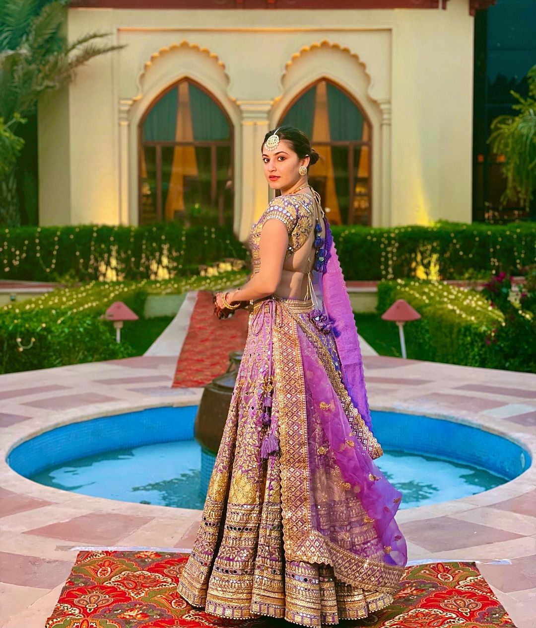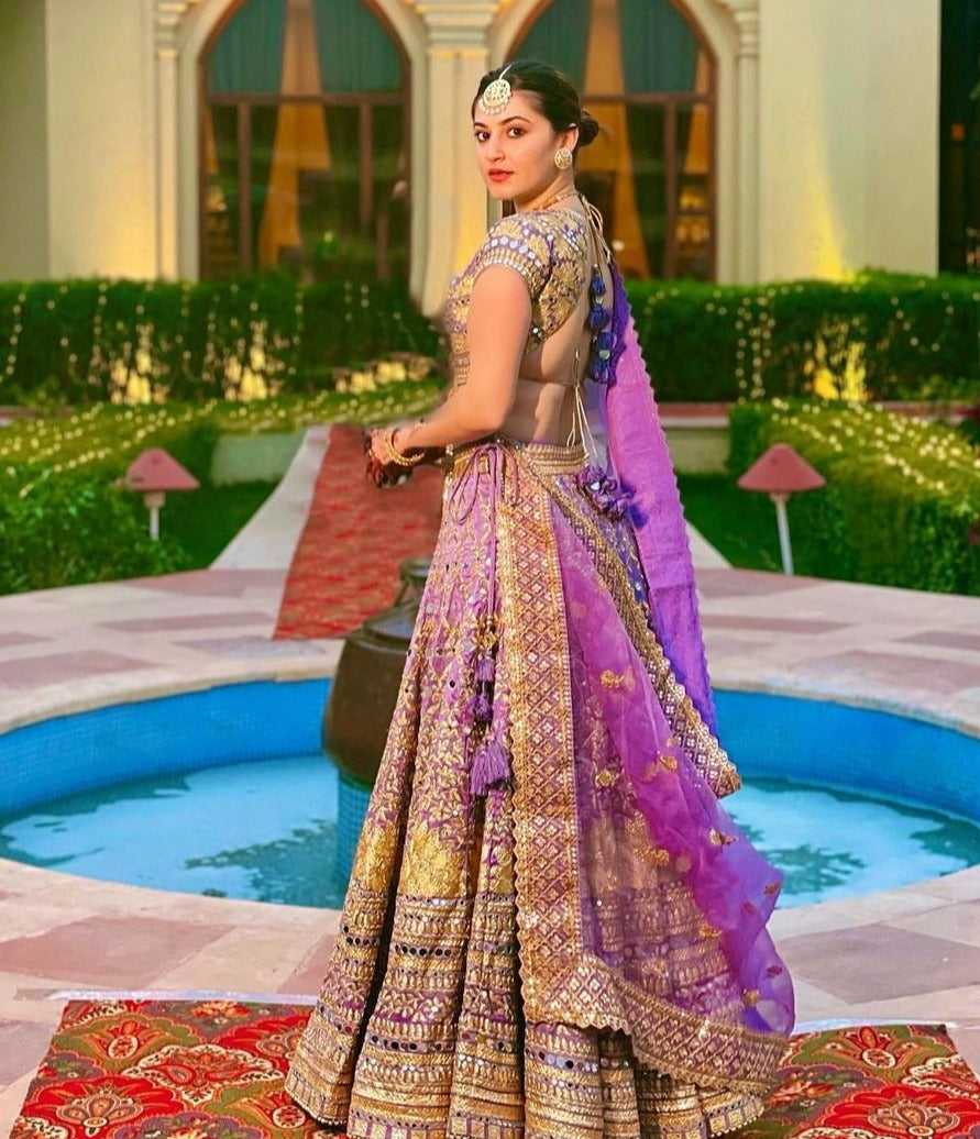 Artistry in weave, our bright purple lehenga set , exudes old world royalty and grace. Intricately woven designs combining the zari embellishment and elongated butti detail come together in a flowing kali cut lehenga. The feminine blouse uses exquisite zardosi detail to enhance the neck, give this a younger feel. The rich organza dupatta with marodiwork border and buttis, finished in delicate scallop, completes this beautiful ensemble.