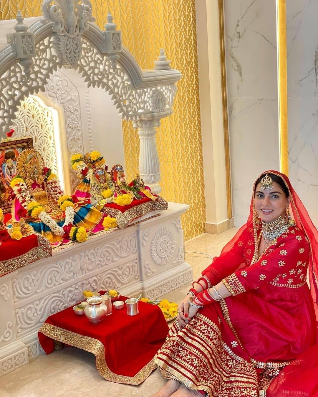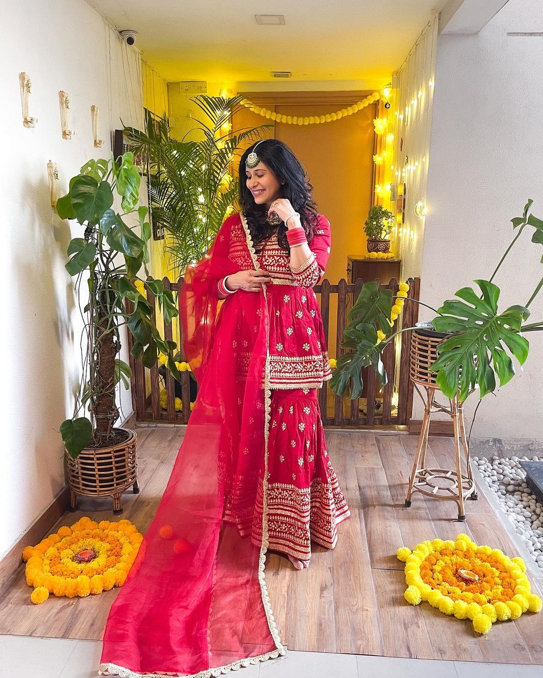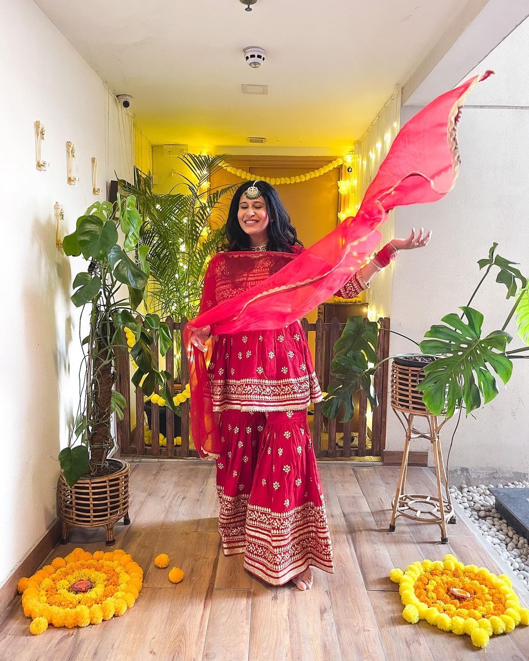 This classic tunic on cotton silk is paired up with a matching flared Garara and dupatta, making it a perfect option for any occasion. The gota highlight gives it a festive vide.