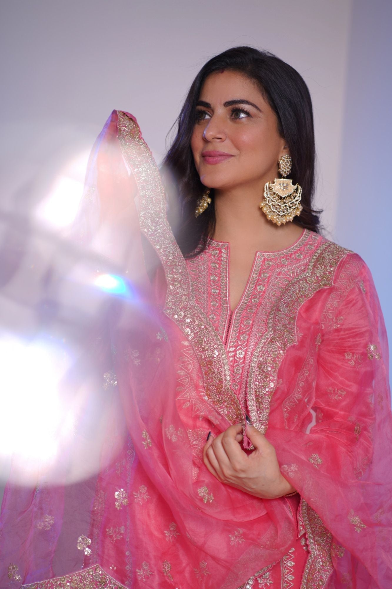 Featuring a kurta with long sleeves, paired with a beautiful organza dupatta. The subtle embroidery making it a great choice for a day or night event.