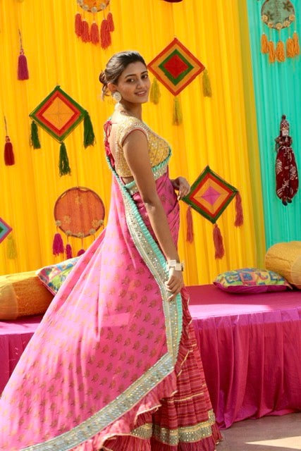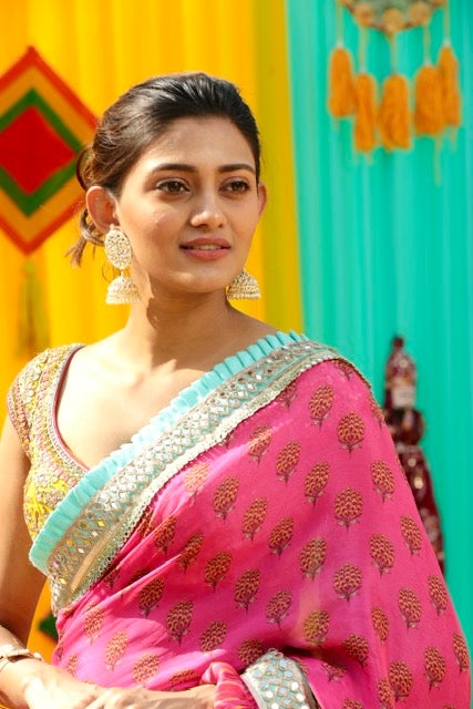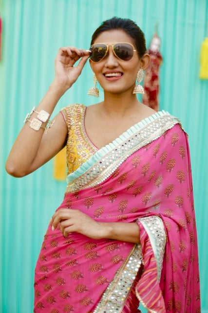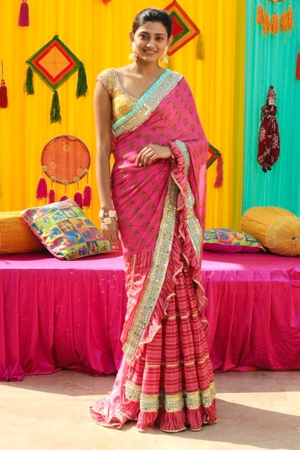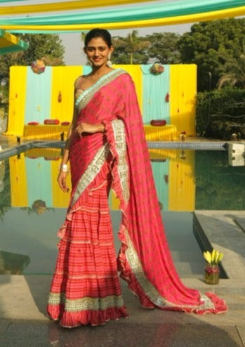 In crepe, this ready frill saree has gota work and lace trims. The floral print makes the pallau and the frills give the body style to this sari. The bustier is embroidered in the same fashion. Easy to wear . just zip it round and you are dressed to go!!