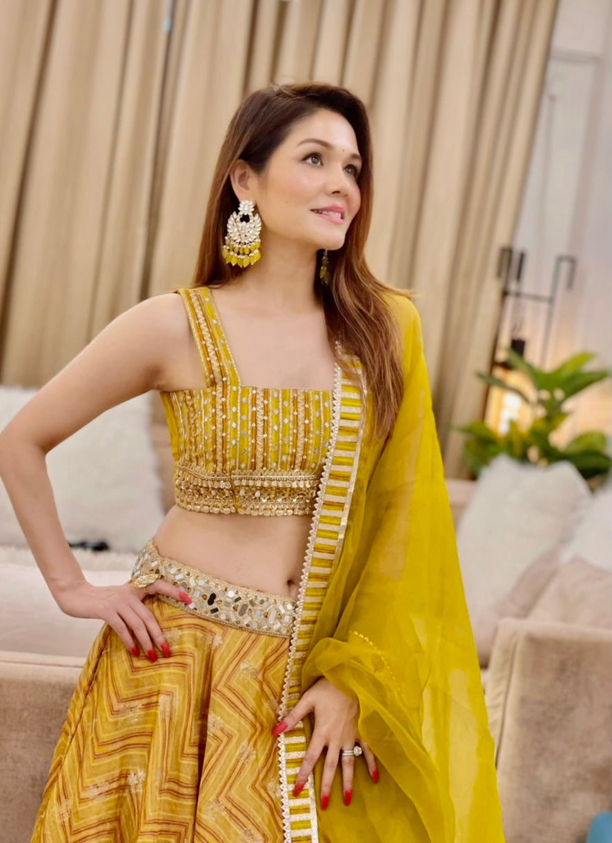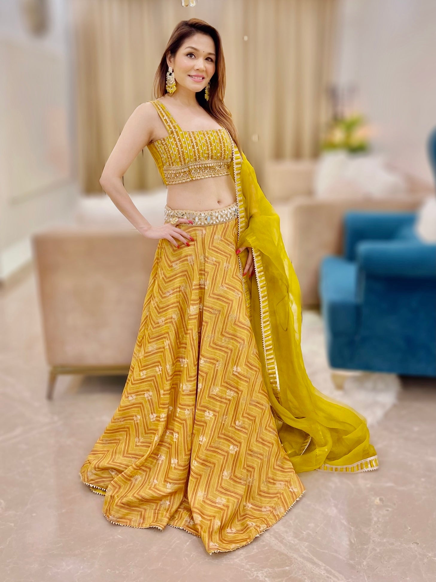 Sonu Kakkar in Marigold Zig-zag Lehenga Set