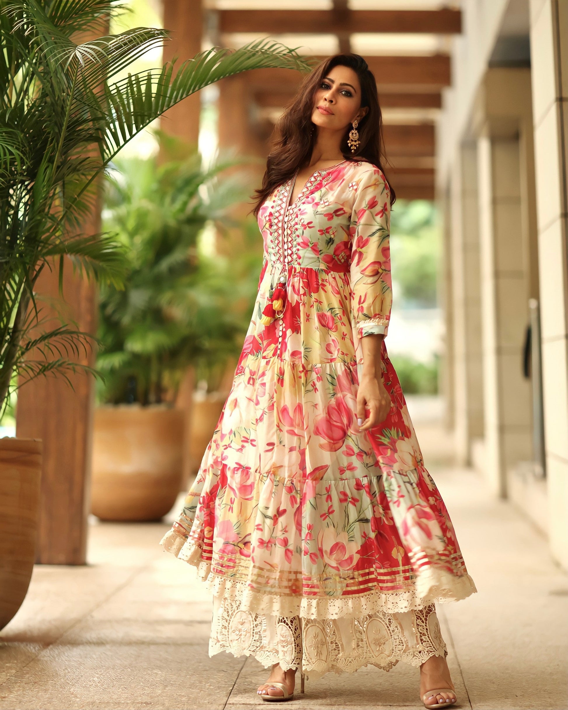This bold floral, front open layered tunic has elaborate embroidery, using gota and resham work. The gathers at the yolk gives a softness and flow to the outfit. Paired with a cutwork embellished palazzo to complete the ensemble.