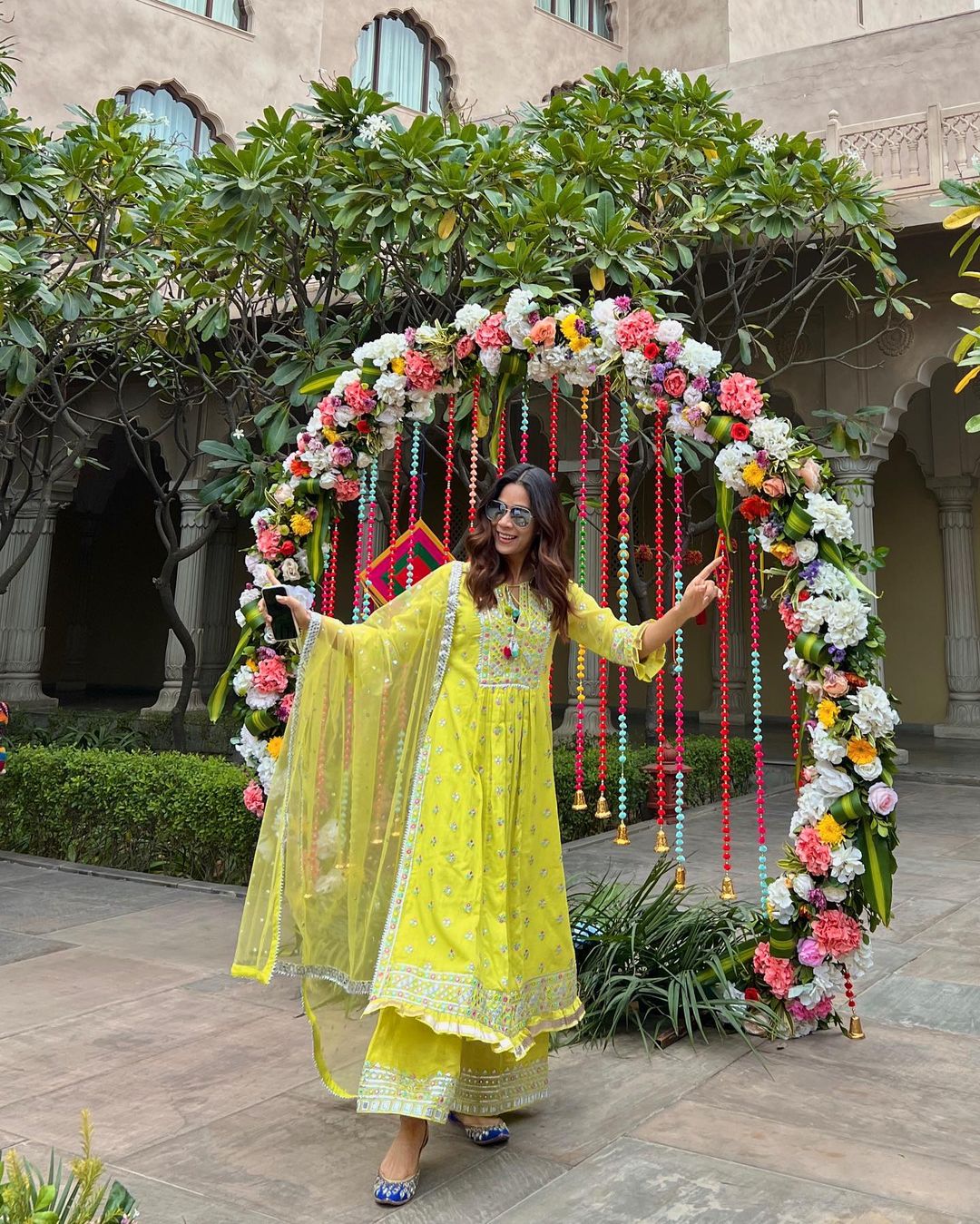 Featuring this tunic embellished with applique, mirror and bright threadwork all over, highlighting the neckline and bottom. Gathers on the waistline gives a natural flow to the outfit. The embroidered dupatta and palazzo gives it a young and festive look.